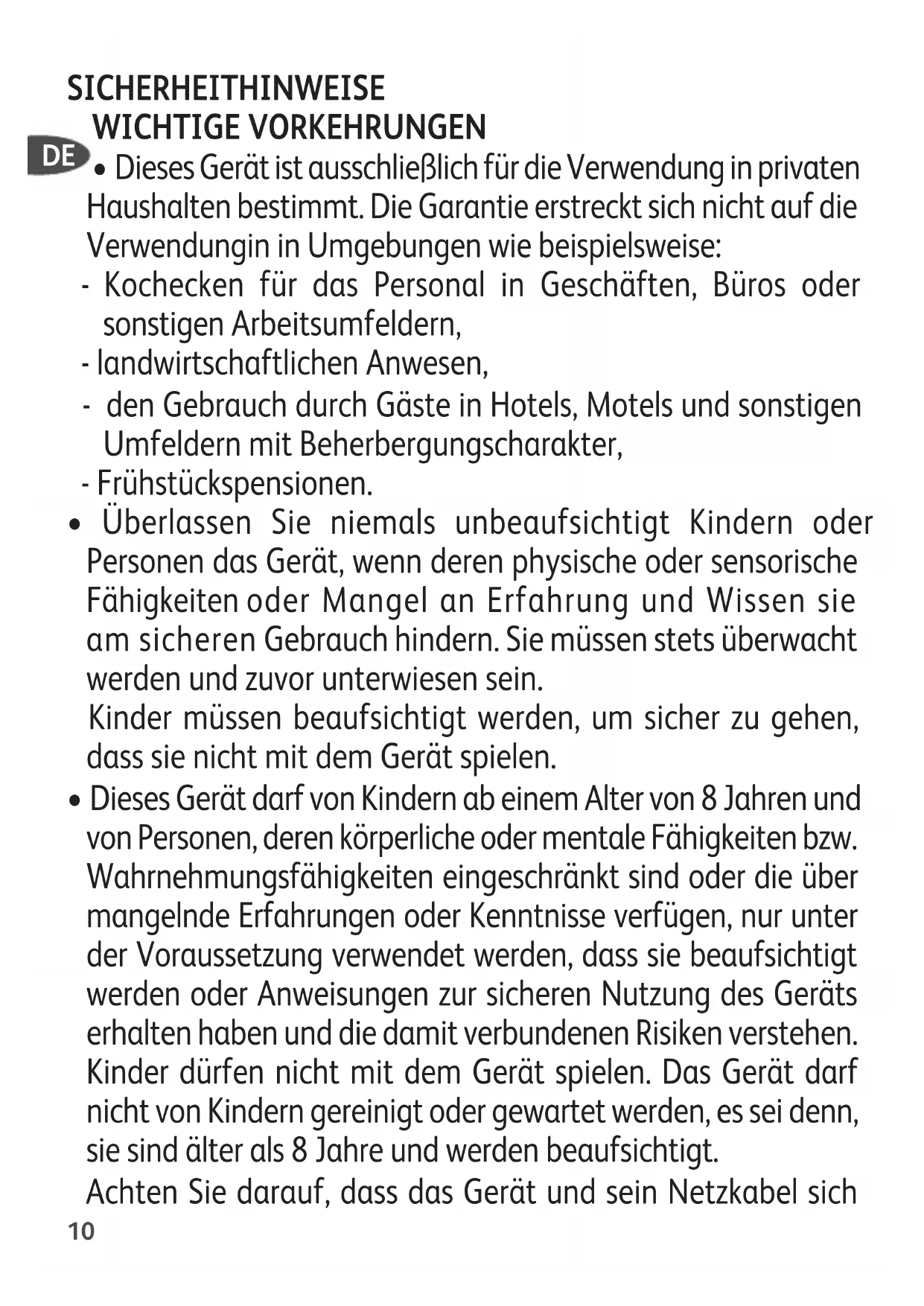 - Dieses Gerät ist ausschließlich für die Verwendung in privaten Haushalten bestimmt. Die Garantie erstreckt sich nicht auf die Verwendungin in Umgebungen wie beispielsweise: - Kochecken für das Personal in Geschäften, Büros oder sonstigen Arbeitsumfeldern, - landwirtschaftlichen Anwesen, - den Gebrauch durch Gäste in Hotels, Motels und sonstigen Umfeldern mit Beherbergungscharakter, - Frühstückspensionen.