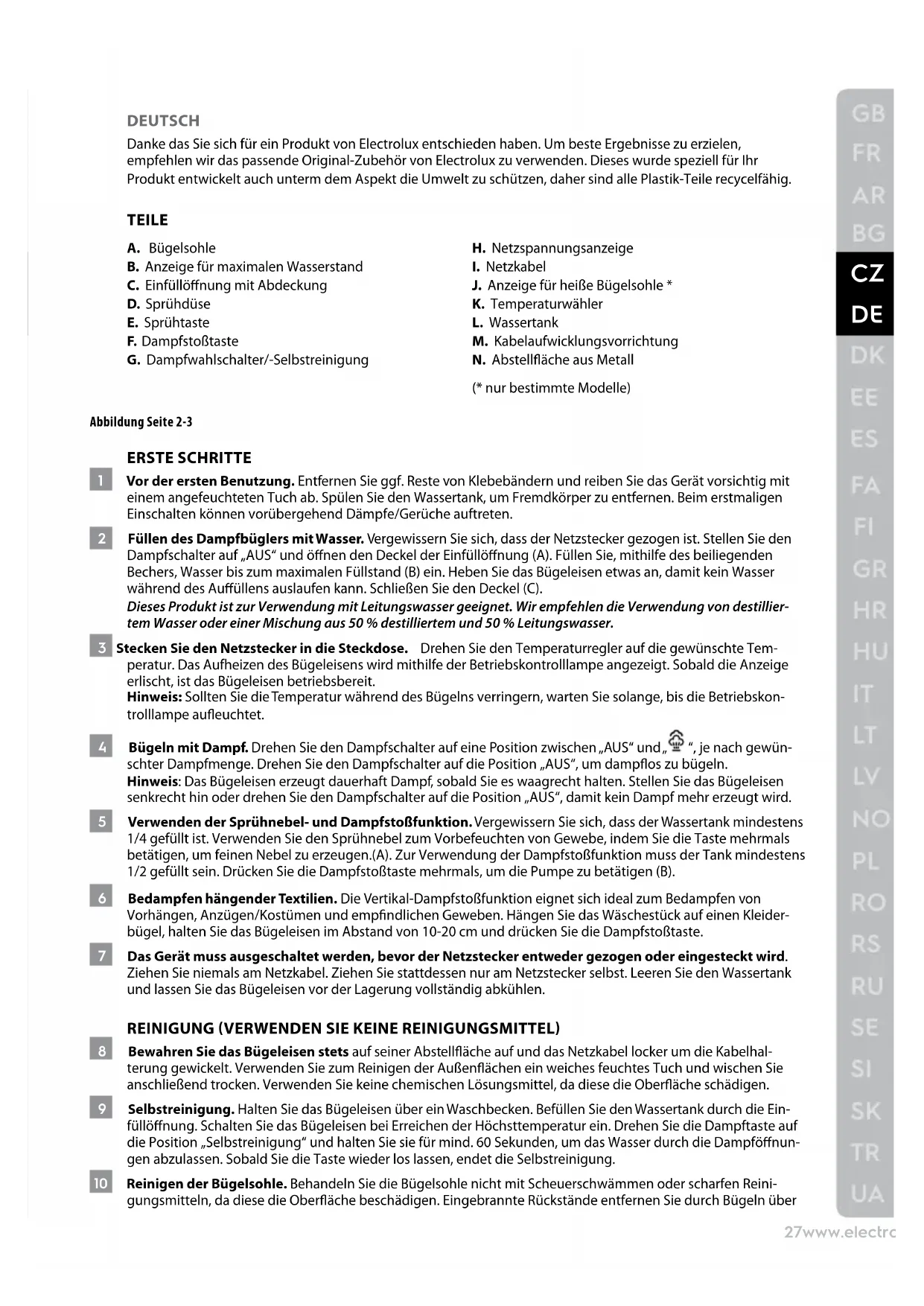 DEUTSCH Danke das Sie sich für ein Produkt von Electrolux entschieden haben. Um beste Ergebnisse zu erzielen, empfehlen wir das passende Original-Zubehör von Electrolux zu verwenden. Dieses wurde speziell für Ihr Produkt entwickelt auch unterm dem Aspekt die Umwelt zu schützen, daher sind alle Plastik-Teile recycelfähig. TEILE A. Bügelsohle B. Anzeige für maximalen Wasserstand C. Einfüllönung mit Abdeckung D. Sprühdüse E. Sprühtaste F. Dampfstoßtaste G. Dampfwahlschalter/-Selbstreinigung H. Netzspannungsanzeige