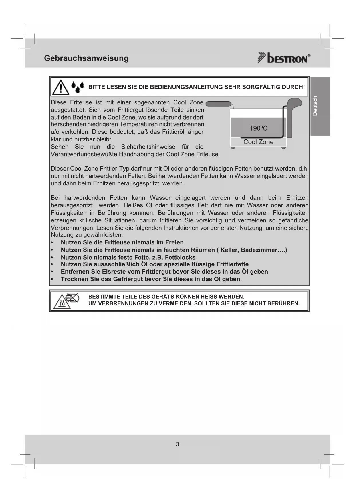 Dieser Cool Zone Frittier-Typ darf nur mit Öl oder anderen flüssigen Fetten benutzt werden, d.h. nur mit nicht hartwerdenden Fetten. Bei hartwerdenden Fetten kann Wasser eingelagert werden und dann beim Erhitzen herausgespritz werden.