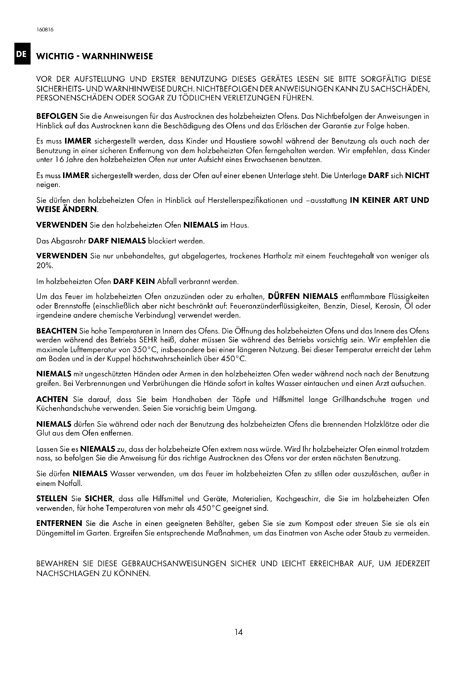 VOR DER AUFSTELLUNG UND ERSTER BENUTZUNG DIESES GERÄTES LESEN SIE BITTE SORGFÄLTIG DIESE SICHERHEITS- UND WARNHINWEISE DURCH NICHTBEFOLGEN DER ANWEISUNGEN KANN ZU SACHSCHÄDEN, PERSONENSCHÄDEN ODER SOGAR ZU TÖDLICHEN VERLETZUNGEN FÜHREN BEFOLGEN Sie die Anweisungen für das Austrocknen des holzbeheizten Ofens Das Nichtbefolgen der Anweisungen in Hinblick auf das Austrocknen kann die Beschädigung des Ofens und das Erlöschen der Garantie zur Folge haben Es muss IMMER sichergestellt werden, dass Kinder und Haustiere sowohl während der Benutzung als auch nach der Benutzung in einer sicheren Entfernung von dem holzbeheizten Ofen ferngehalten werden Wir empfehlen, dass Kinder unter 16 Jahre den holzbeheizten Ofen nur unter Aufsicht eines Erwachsenen benutzen Es muss IMMER sichergestellt werden, dass der Ofen auf einer ebenen Unterlage steht Die Unterlage DARF sich NICHT neigen Sie dürfen den holzbeheizten Ofen in Hinblick auf Herstellerspezifikationen und –ausstattung IN KEINER ART UND WEISE ÄNDERN VERWENDEN Sie den holzbeheizten Ofen NIEMALS im Haus Das Abgasrohr DARF NIEMALS blockiert werden VERWENDEN Sie nur unbehandeltes, gut abgelagertes, trockenes Hartholz mit einem Feuchtegehalt von weniger als 20% Im holzbeheizten Ofen DARF KEIN Abfall verbrannt werden Um das Feuer im holzbeheizten Ofen anzuzünden oder zu erhalten, DÜRFEN NIEMALS entflammbare Flüssigkeiten oder Brennstoffe (einschließlich aber nicht beschränkt auf: Feueranzünderflüssigkeiten, Benzin, Diesel, Kerosin, Öl oder irgendeine andere chemische Verbindung) verwendet werden BEACHTEN Sie hohe Temperaturen in Innern des Ofens Die Öffnung des holzbeheizten Ofens und das Innere des Ofens werden während des Betriebs SEHR heiß, daher müssen Sie während des Betriebs vorsichtig sein Wir empfehlen die maximale Lufttemperatur von 350°C, insbesondere bei einer längeren Nutzung Bei dieser Temperatur erreicht der Lehm am Boden und in der Kuppel höchstwahrscheinlich über 450°C NIEMALS mit ungeschützten Händen oder Armen in den holzbeheizten Ofen weder während noch nach der Benutzung greifen Bei Verbrennungen und Verbrühungen die Hände sofort in kaltes Wasser eintauchen und einen Arzt aufsuchen ACHTEN Sie darauf, dass Sie beim Handhaben der Töpfe und Hilfsmittel lange Grillhandschuhe tragen und Küchenhandschuhe verwenden Seien Sie vorsichtig beim Umgang NIEMALS dürfen Sie während oder nach der Benutzung des holzbeheizten Ofens die brennenden Holzklötze oder die Glut aus dem Ofen entfernen Lassen Sie es NIEMALS zu, dass der holzbeheizte Ofen extrem nass würde Wird Ihr holzbeheizter Ofen einmal trotzdem nass, so befolgen Sie die Anweisung für das richtige Austrocknen des Ofens vor der ersten nächsten Benutzung Sie dürfen NIEMALS Wasser verwenden, um das Feuer im holzbeheizten Ofen zu stillen oder auszulöschen, außer in einem Notfall STELLEN Sie SICHER, dass alle Hilfsmittel und Geräte, Materialien, Kochgeschirr, die Sie im holzbeheizten Ofen verwenden, für hohe Temperaturen von mehr als 450°C geeignet sind ENTFERNEN Sie die Asche in einen geeigneten Behälter, geben Sie sie zum Kompost oder streuen Sie sie als ein Düngemittel im Garten Ergreifen Sie entsprechende Maßnahmen, um das Einatmen von Asche oder Staub zu vermeiden BEWAHREN SIE DIESE GEBRAUCHSANWEISUNGEN SICHER UND LEICHT ERREICHBAR AUF, UM JEDERZEIT