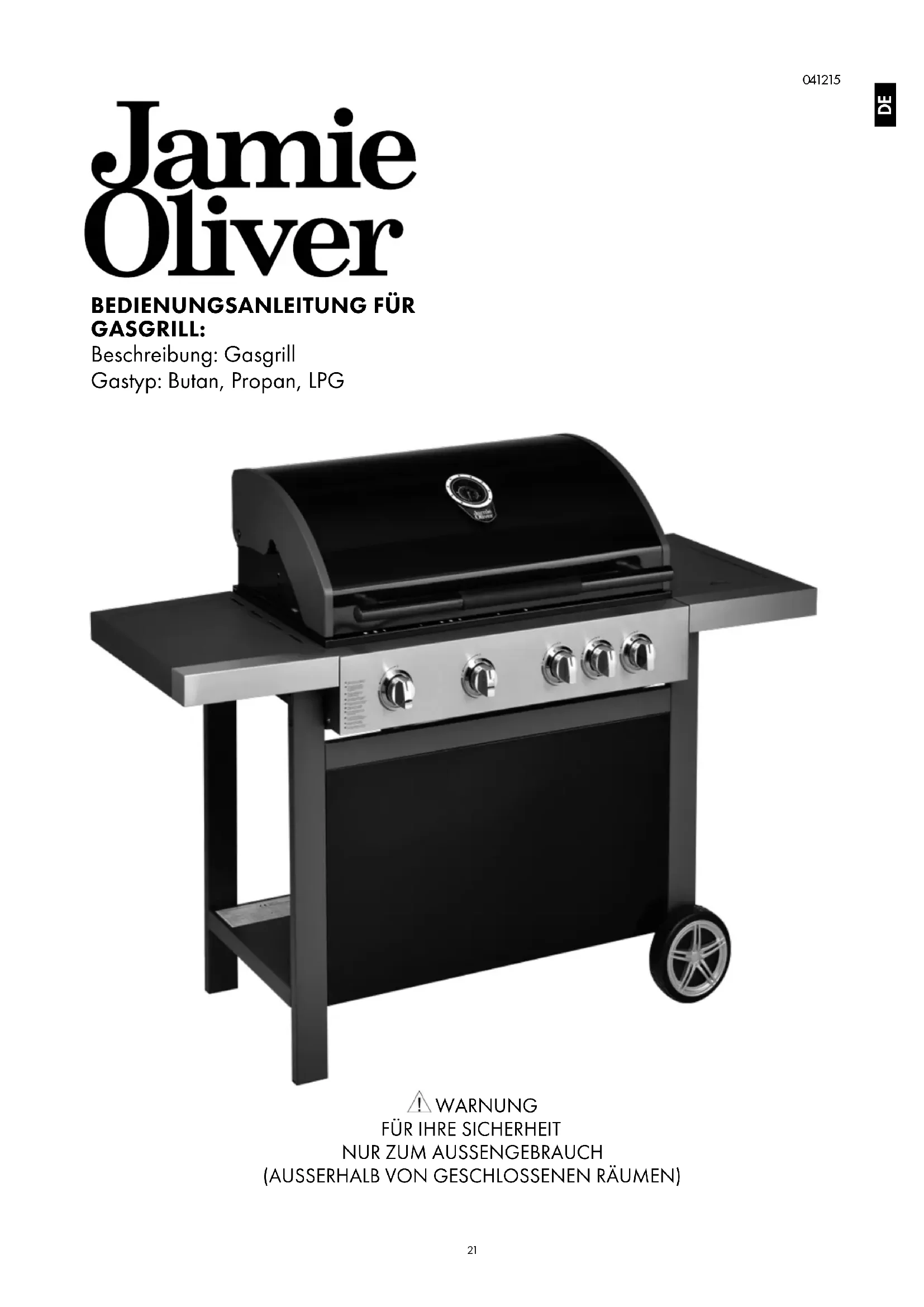 - Sonstige Teile 1 Jahr Diese Garantie gilt nicht: a. für aufgrund von Feuchtigkeit oder Überhitzung verrostete, korrodierte, oxidierte oder entfärbte Teile. b. für Arbeiten oder arbeitsbezogene Kosten. c. bei normaler Abnutzung und Rissen oder Entstopfung. d. bei fahrlässiger Verwendung oder Missbrauch des Produktes. e. bei der Verwendung von falschem Kraftstoff/Gas. f. bei unsachgemäßem Gebrauch, der nicht gemäß der Bedienungsanleitung im Handbuch erfolgt. g. für den Regler, den Schlauch und die Schlauchschellen. h. für die Verschleißteile, z. B. Batterien (ggf.). Durch diese Garantie werden die gesetzlichen Rechte des Kunden nicht beeinträchtigt. Die Garantie ist weltweit anwendbar. Jamie Oliver BBQ behält sich das Recht vor, dieses Produkt ohne Ankündigung zu ändern. Wenn das Modell nicht mehr erhältlich ist, wird ein Ersatz oder Ausgleich vereinbart. Die Garantie gilt 10 Jahre, für einige Teile jedoch nur, wenn sie innerhalb von 30 Tagen ab dem Kaufdatum registriert wurden. Um die Gewährleistungsrechte in Anspruch nehmen zu können, registrieren Sie sich unter www.jamieoliverbbq. com oder füllen Sie die Pflichtfelder auf der Webseite JETZT REGISTRIEREN auf einem gesonderten Blatt aus und senden Sie dieses an Jamie Oliver BBQ Registration. Um einen Anspruch auf Garantieleistungen geltend zu machen, laden Sie bitte das Antragsformular von der Webseite www. jamieoliverbbq.com herunter oder senden Sie ein Schreiben an die Adresse Jamie Oliver BBQ Helpline, Einsteinweg 5, 3752 LW Bunschoten, PO Box 214, 3750 GE Bunschoten, Niederlande, um ein Formular zu erhalten. Bei der Geltendmachung von Ansprüchen muss Folgendes übermittelt werden: a. eine lesbare Kopie der Kaufquittung (inkl. Kaufdatum, Modellname und Geschäft). b. der Modellname und die Modellnummer des Grills. c. das Kaufdatum. d. der Geschäftsname und -standort / oder Sonstiges, z. B. online. e. Fotos der beschädigten Teile, die im Anspruch angegeben werden. Dieses Dokument an einem sicheren Ort aufbewahren.30