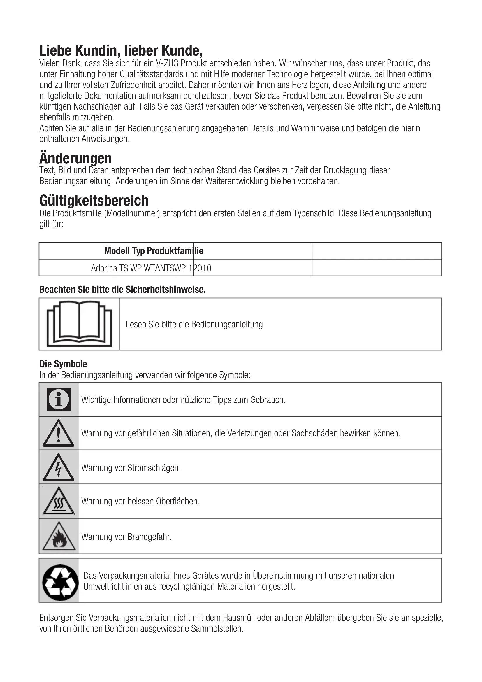 Tumble dryerLiebe Kundin, lieber Kunde, Vielen Dank, dass Sie sich für ein V-ZUG Produkt entschieden haben. Wir wünschen uns, dass unser Produkt, das unter Einhaltung hoher Qualitätsstandards und mit Hilfe moderner Technologie hergestellt wurde, bei Ihnen optimal und zu Ihrer vollsten Zufriedenheit arbeitet. Daher möchten wir Ihnen ans Herz legen, diese Anleitung und andere mitgelieferte Dokumentation aufmerksam durchzulesen, bevor Sie das Produkt benutzen. Bewahren Sie sie zum künftigen Nachschlagen auf. Falls Sie das Gerät verkaufen oder verschenken, vergessen Sie bitte nicht, die Anleitung ebenfalls mitzugeben. Achten Sie auf alle in der Bedienungsanleitung angegebenen Details und Warnhinweise und befolgen die hierin enthaltenen Anweisungen. Änderungen Text, Bild und Daten entsprechen dem technischen Stand des Gerätes zur Zeit der Drucklegung dieser Bedienungsanleitung. Änderungen im Sinne der Weiterentwicklung bleiben vorbehalten. Gültigkeitsbereich Die Produktfamilie (Modellnummer) entspricht den ersten Stellen auf dem Typenschild. Diese Bedienungsanleitung gilt für: Modell Typ Produktfamilie Adorina TS WP WTANTSWP 12010 Beachten Sie bitte die Sicherheitshinweise. Lesen Sie bitte die Bedienungsanleitung Die Symbole In der Bedienungsanleitung verwenden wir folgende Symbole: