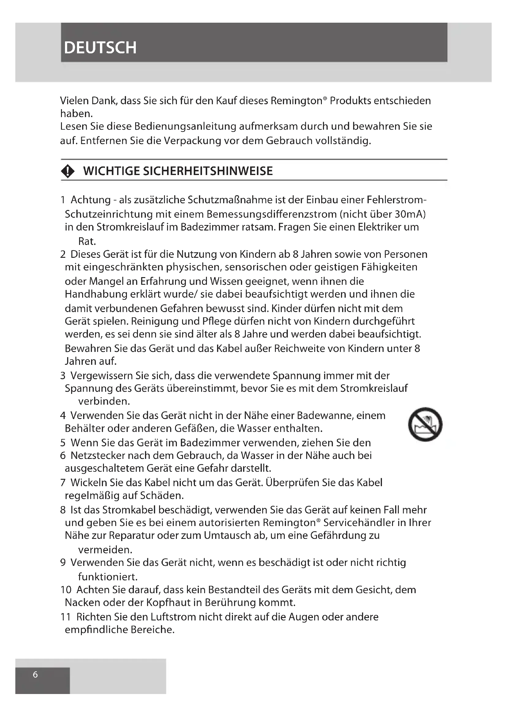 8 Ist das Stromkabel beschädigt, verwenden Sie das Gerät auf keinen Fall mehr und geben Sie es bei einem autorisierten Remington® Servicehändler in ihrer Höhe zur Reparatur oder zum Umtausch ab, um eine Gefährung zu vermeiden.