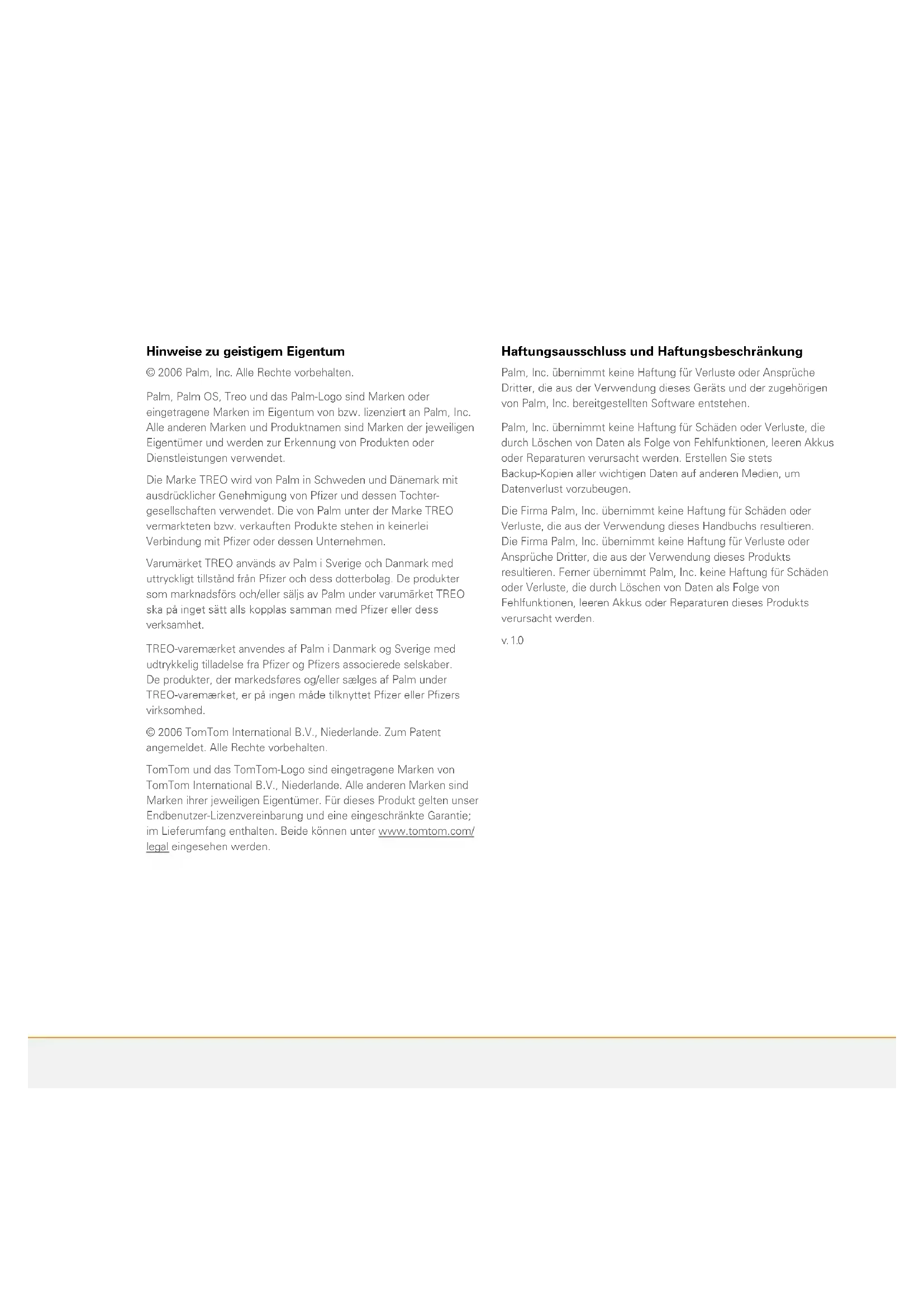 16Hinweise zu geistigem Eigentum © 2006 Palm, Inc. Alle Rechte vorbehalten. Palm, Palm OS, Treo und das Palm-Logo sind Marken oder eingetragene Marken im Eigentum von bzw. lizenziert an Palm, Inc. Alle anderen Marken und Produktnamen sind Marken der jeweiligen Eigentümer und werden zur Erkennung von Produkten oder Dienstleistungen verwendet. Die Marke TREO wird von Palm in Schweden und Dänemark mit ausdrücklicher Genehmigung von Pfizer und dessen Tochter- gesellschaften verwendet. Die von Palm unter der Marke TREO vermarkteten bzw. verkauften Produkte stehen in keinerlei Verbindung mit Pfizer oder dessen Unternehmen. Varumärket TREO används av Palm i Sverige och Danmark med uttryckligt tillstånd från Pfizer och dess dotterbolag. De produkter som marknadsförs och/eller säljs av Palm under varumärket TREO ska på inget sätt alls kopplas samman med Pfizer eller dess verksamhet. TREO-varemærket anvendes af Palm i Danmark og Sverige med udtrykkelig tilladelse fra Pfizer og Pfizers associerede selskaber. De produkter, der markedsføres og/eller sælges af Palm under TREO-varemærket, er på ingen måde tilknyttet Pfizer eller Pfizers virksomhed. © 2006 TomTom International B.V., Niederlande. Zum Patent angemeldet. Alle Rechte vorbehalten. TomTom und das TomTom-Logo sind eingetragene Marken von TomTom International B.V., Niederlande. Alle anderen Marken sind Marken ihrer jeweiligen Eigentümer. Für dieses Produkt gelten unser Endbenutzer-Lizenzvereinbarung und eine eingeschränkte Garantie; im Lieferumfang enthalten. Beide können unter www.tomtom.com/ legal eingesehen werden. Haftungsausschluss und Haftungsbeschränkung Palm, Inc. übernimmt keine Haftung für Verluste oder Ansprüche Dritter, die aus der Verwendung dieses Geräts und der zugehörigen von Palm, Inc. bereitgestellten Software entstehen. Palm, Inc. übernimmt keine Haftung für Schäden oder Verluste, die durch Löschen von Daten als Folge von Fehlfunktionen, leeren Akkus oder Reparaturen verursacht werden. Erstellen Sie stets Backup-Kopien aller wichtigen Daten auf anderen Medien, um Datenverlust vorzubeugen. Die Firma Palm, Inc. übernimmt keine Haftung für Schäden oder Verluste, die aus der Verwendung dieses Handbuchs resultieren. Die Firma Palm, Inc. übernimmt keine Haftung für Verluste oder Ansprüche Dritter, die aus der Verwendung dieses Produkts resultieren. Ferner übernimmt Palm, Inc. keine Haftung für Schäden oder Verluste, die durch Löschen von Daten als Folge von Fehlfunktionen, leeren Akkus oder Reparaturen dieses Produkts verursacht werden.