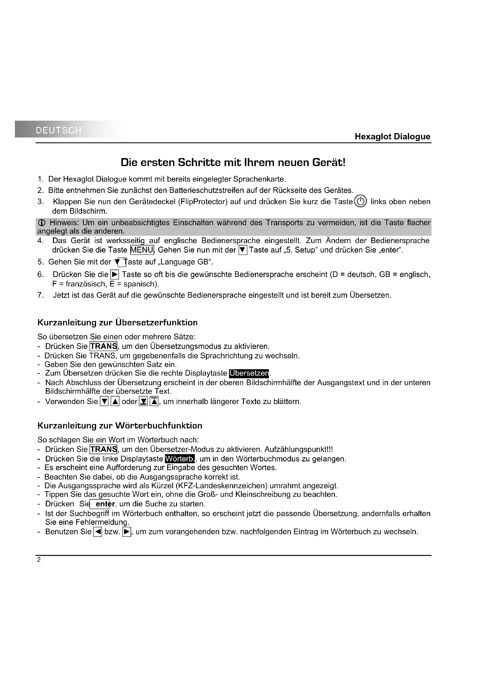 Kurzanleitung zur Übersetzerfunktion So übersetzen Sie einen oder mehrere Sätze: - Drücken Sie TRANS, um den Übersetzungsmodus zu aktivieren. - Drücken Sie TRANS, um gegebenenfalls die Sprachrichtung zu wechseln. - Geben Sie den gewünschten Satz ein. - Zum Übersetzen drücken Sie die rechte Displaytaste Übersetzen. - Nach Abschluss der Übersetzung erscheint in der oberen Bildschirmhälfte der Ausgangstext und in der unteren Bildschirm- hälfte der übersetzte Text. - Verwenden Sie ▼ ▲ oder ▼ ▲, um innerhalb längerer Texte zu blättern. Kurzanleitung zur Wörterbuchfunktion So schlagen Sie ein Wort im Wörterbuch nach: - Drücken Sie TRANS, um den Übersetzer-Modus zu aktivieren. Aufzählungspunkt!!! - Drücken Sie die linke Displaytaste Wörterb., um in den Wörterbuchmodus zu gelangen. - Es erscheint eine Aufforderung zur Eingabe des gesuchten Wortes. - Beachten Sie dabei, ob die Ausgangssprache korrekt ist. - Die Ausgangssprache wird als Kürzel (KFZ-Landeskennzeichen) umrahmt angezeigt. - Tippen Sie das gesuchte Wort ein, ohne die Groß- und Kleinschreibung zu beachten. - Drücken Sie enter, um die Suche zu starten. - Ist der Suchbegriff im Wörterbuch enthalten, so erscheint jetzt die passende Übersetzung, andernfalls erhalten Sie eine Fehlermeldung. - Benutzen Sie ◄ bzw. ►, um zum vorangehenden bzw. nachfolgenden Eintrag im Wörterbuch zu wechseln. Hinweise zum Einstellen der Bedienersprache des Gerätes, zur Änderung der Sprachrichtung und weitere ausführliche Informa- tionen finden Sie auf den folgenden Seiten.Hexaglot Dialogue