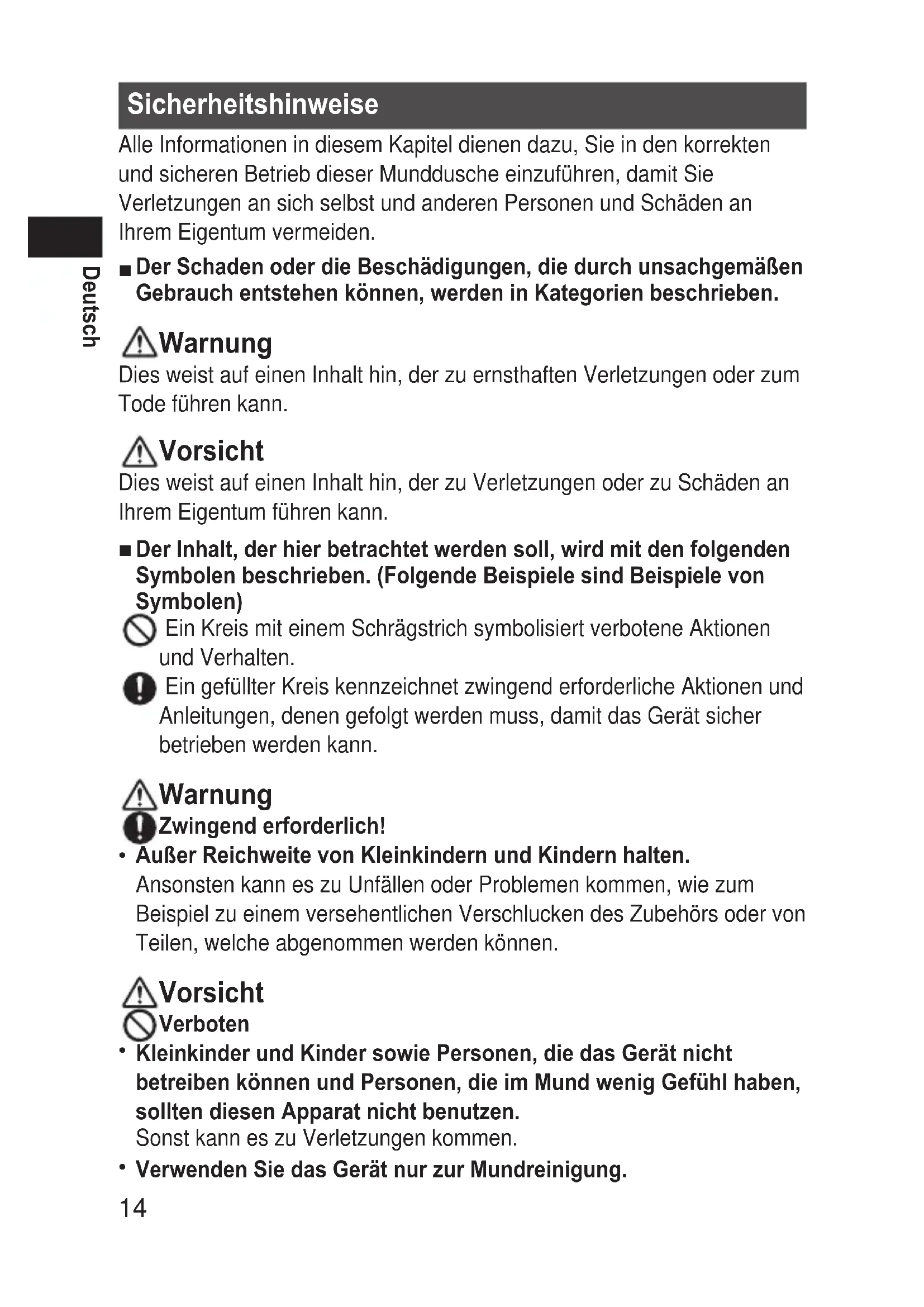 These symbols on the products, packaging, and/or accompanying documents mean that used electrical and electronic products and batteries should not be mixed with general household waste. For proper treatment, recovery and recycling of old products and used batteries, please take them to applicable collection points, in accordance with your national legislation and the Directives 2002/96/EC and 2006/66/EC. By disposing of these products and batteries correctly, you will help to save valuable resources and prevent any potential negative effects on human health and the environment which could otherwise arise from inappropriate waste handling. For more information about collection and recycling of old products and batteries, please contact your local municipality, your waste disposal service or the point of sale where you purchased the items. Penalties may be applicable for incorrect disposal of this waste, in accordance with national legislation. ForbusinessusersintheEuropeanUnion If you wish to discard electrical and electronic equipment, please contact your dealer or supplier for further information. [InformationonDisposalinotherCountries outsidetheEuropeanUnion] These symbols are only valid in the European Union. If you wish to discard these items, please contact your local authorities or dealer and ask for the correct method of disposal. Noteforthebatterysymbol(bottomtwosymbolexamples): This symbol might be used in combination with a chemical symbol. In this case it complies with the requirement set by the Directive for the chemical involved.14 Deutsch Sicherheitshinweise Alle Informationen in diesem Kapitel dienen dazu, Sie in den korrekten und sicheren Betrieb dieser Munddusche einzuführen, damit Sie Verletzungen an sich selbst und anderen Personen und Schäden an Ihrem Eigentum vermeiden. DerSchadenoderdieBeschädigungen,diedurchunsachgemäßen Gebrauchentstehenkönnen,werdeninKategorienbeschrieben. Warnung Dies weist auf einen Inhalt hin, der zu ernsthaften Verletzungen oder zum Tode führen kann. Vorsicht Dies weist auf einen Inhalt hin, der zu Verletzungen oder zu Schäden an Ihrem Eigentum führen kann. Der Inhalt,derhierbetrachtetwerdensoll,wirdmitdenfolgenden Symbolenbeschrieben.(FolgendeBeispielesindBeispielevon Symbolen) Ein Kreis mit einem Schrägstrich symbolisiert verbotene Aktionen und Verhalten. Ein gefüllter Kreis kennzeichnet zwingend erforderliche Aktionen und Anleitungen, denen gefolgt werden muss, damit das Gerät sicher betrieben werden kann. Warnung Zwingenderforderlich! AußerReichweitevonKleinkindernundKindernhalten. Ansonsten kann es zu Unfällen oder Problemen kommen, wie zum Beispiel zu einem versehentlichen Verschlucken des Zubehörs oder von Teilen, welche abgenommen werden können. Vorsicht Verboten KleinkinderundKindersowiePersonen,diedasGerätnicht betreibenkönnenundPersonen,dieimMundwenigGefühlhaben, solltendiesenApparatnichtbenutzen. Sonst kann es zu Verletzungen kommen. VerwendenSiedasGerätnurzurMundreinigung.