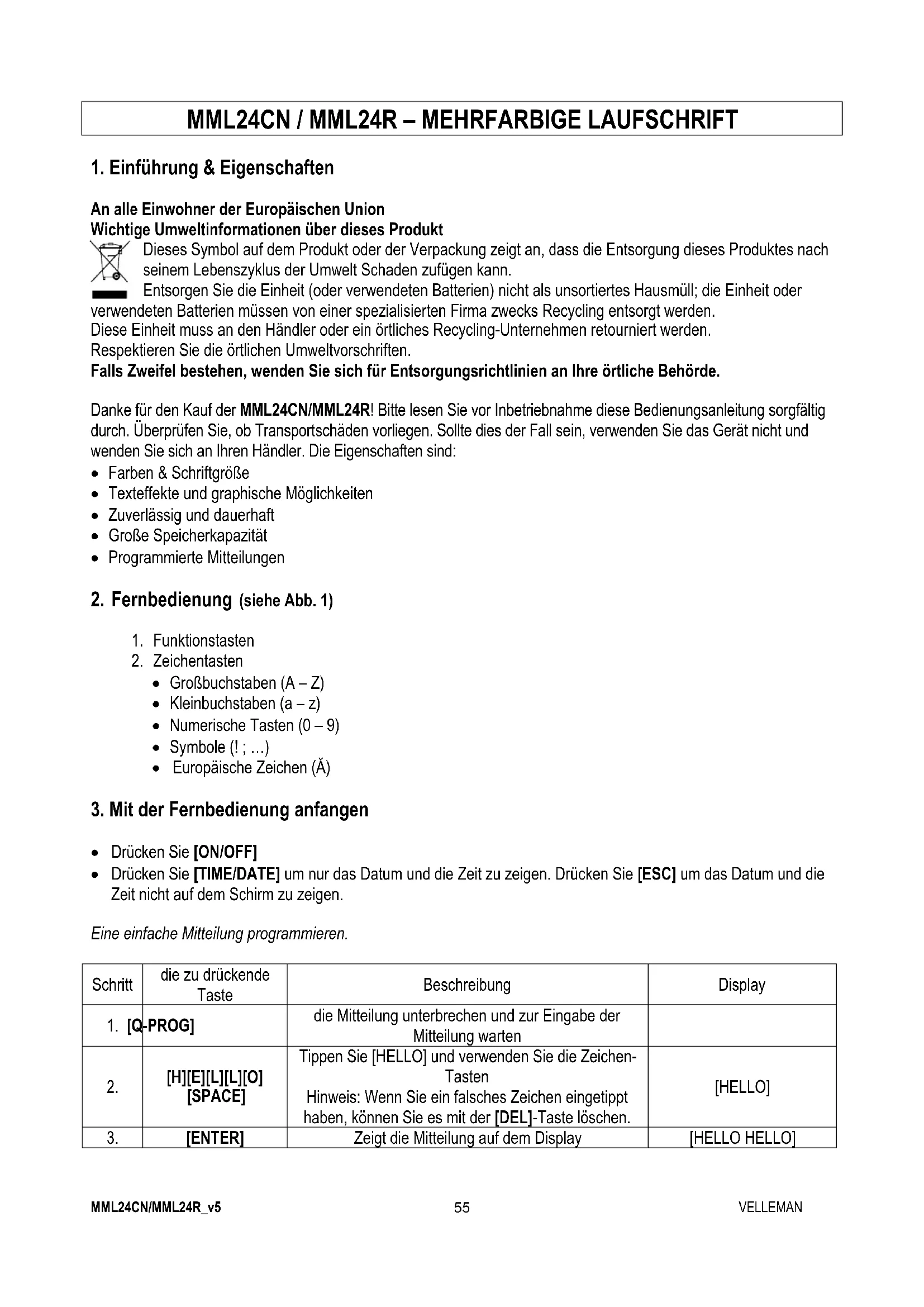 3. [ENTER] Zeigt die Mitteilung auf dem Display [HELLO HELLO]MML24CN/MML24R_v5 VELLEMAN