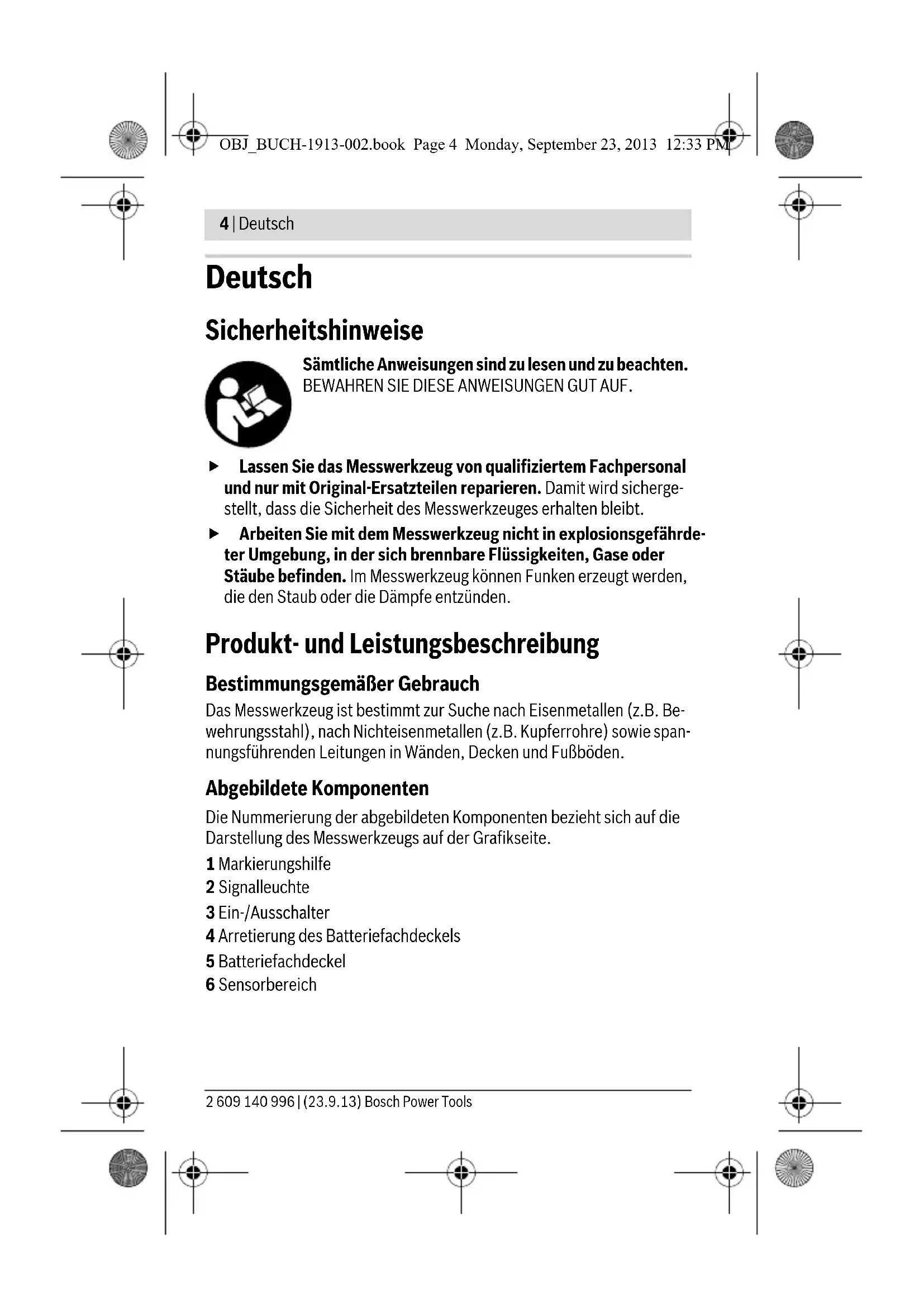 - abhängig von Material und Größe der Objekte sowie Material und Zustand des Unter- grundes (Wände, Decken, Böden) ** geringere Erfassungstiefe bei nicht spannungsführenden Leitungen Das Messergebnis kann hinsichtlich der Genauigkeit und Erfassungstiefe bei ungünstiger Beschaffenheit des Untergrundes schlechter ausfallen. Henk Becker Executive Vice President Engineering Helmut Heinzelmann Head of Product Certification PT/ETM9 OBJ_BUCH-1913-002.book Page 5 Monday, September 23, 2013 12:33 PM6 | Deutsch 2 609 140 996 | (23.9.13) Bosch Power Tools Robert Bosch GmbH, Power Tools Division D-70745 Leinfelden-Echterdingen Leinfelden, 26.08.2013 Montage Batterien einsetzen/wechseln Für den Betrieb des Messwerkzeugs wird die Verwendung von Alkali-Man- gan-Batterien empfohlen. Zum Öffnen des Batteriefachdeckels 5 drücken Sie auf die Arretierung 4 und klappen den Batteriefachdeckel auf. Setzen Sie die Batterien ein. Achten Sie dabei auf die richtige Polung entsprechend der Darstellung auf der Innenseite des Batteriefachs. Nehmen Sie die Batterien aus dem Messwerkzeug, wenn Sie es längere Zeit nicht benutzen. Batterien können bei längerer Lagerung korrodieren oder sich selbst entladen. Betrieb Inbetriebnahme Schützen Sie das Messwerkzeug vor Nässe und direkter Sonnen- einstrahlung. Setzen Sie das Messwerkzeug keinen extremen Temperaturen oder Temperaturschwankungen aus. Lassen Sie es z.B. nicht länge- re Zeit im Auto liegen. Lassen Sie das Messwerkzeug bei größeren Temperaturschwankungen erst austemperieren, bevor Sie es in Be- trieb nehmen. Bei extremen Temperaturen oder Temperaturschwan- kungen kann die Präzision des Messwerkzeugs beeinträchtigt werden. Vermeiden Sie heftige Stöße oder Stürze des Messwerkzeuges. Ein-/Ausschalten Stellen Sie vor dem Einschalten des Messwerkzeugs sicher, dass der Sensorbereich 6 nicht feucht ist. Reiben Sie das Messwerkzeug gegebenenfalls mit einem Tuch trocken. OBJ_BUCH-1913-002.book Page 6 Monday, September 23, 2013 12:33 PMDeutsch | 7 Bosch Power Tools 2 609 140 996 | (23.9.13) Schieben Sie zum Einschalten des Messwerkzeugs den Ein-/ Ausschalter 3 nach unten. Nach einem kurzen Selbsttest ist das Messwerkzeug betriebsbereit. Die Betriebsbereitschaft wird dadurch angezeigt, dass die Signalleuchte 2 leuchtet. Leuchtet nach dem Einschalten die Signalleuchte 2 nicht auf, müssen Sie die Batterien erneuern. Schieben Sie zum Ausschalten des Messwerkzeugs den Ein-/ Ausschalter 3 nach oben. Erfolgt ca. 10 min lang keine Messung, dann schaltet sich das Messwerk- zeug zur Schonung der Batterien automatisch ab. Hinweis: Hat sich das Messwerkzeug automatisch abgeschaltet, so befin- det sich der Ein-/Ausschalter 3 noch in der Position „An“. Um das Mess- werkzeug wieder einzuschalten, schieben Sie den Ein-/Ausschalter 3 zu- nächst in die Position „Aus“ und anschließend wieder in die Position „An“. Betriebsarten Das Messwerkzeug detektiert Objekte unterhalb des Sensorbereiches 6. Bevor Sie in die Wand bohren, sägen oder fräsen, sollten Sie sich noch durch andere Informationsquellen vor Gefahren sichern. Da Genauigkeit und Erfassungstiefe des Messwerkzeugs durch Umge- bungseinflüsse oder die Wandbeschaffenheit verringert werden kön- nen, kann Gefahr bestehen, dass sich Objekte im Sensorbereich befin- den, obwohl die Anzeige kein Objekt anzeigt (die Signalleuchte 2 leuchtet grün). Signalleuchte Erklärung grün kein Objekt gefunden gelb – Metallobjekt in der Nähe des Sensors – kleines oder tief liegendes Metallobjekt im Sensorbereich oder – Beeinträchtigung des Sensors durch ungünstige Wandbeschaffenheit rot und Dauerton Metallobjekt im Sensorbereich gefunden rot blinkend (schnell) und pulsierende Tonfolge spannungsführende Leitung gefunden OBJ_BUCH-1913-002.book Page 7 Monday, September 23, 2013 12:33 PM8 | Deutsch 2 609 140 996 | (23.9.13) Bosch Power Tools Metallobjekte suchen Nach dem Einschalten leuchtet die Signalleuchte 2 grün. Setzen Sie das Messwerkzeug auf die zu untersuchende Oberfläche und bewegen Sie es seitlich. – Ist im Untergrund kein Metallobjekt erkennbar, dann leuchtet die Sig- nalleuchte 2 weiterhin grün und es ertönt kein Signalton. – Nähert sich das Messwerkzeug einem Metallobjekt, leuchtet die Sig- nalleuchte 2 zunächst gelb und geht bei Annäherung an das Metallob- jekt in Rot über. Sobald die Signalleuchte rot leuchtet, wird zusätzlich ein Signalton abgegeben, der bei weiterer Annäherung an das Metall- objekt in der Tonhöhe ansteigt. – Über einem Metallobjekt leuchtet die Signalleuchte 2 rot und es ertönt ein Signalton mit maximaler Tonhöhe. Auch bei gelber Signalleuchte 2 kann sich ein Metallobjekt unter- halb des Sensorbereichs befinden. Kleine oder tief liegende Metall- objekte befinden sich in der Nähe des Sensors, oder die Wandbeschaf- fenheit beeinträchtigt das Messergebnis. Beim ersten Überfahren wird die Position des Metall- objekts nur grob angezeigt. Wenn Sie das Metallobjekt mehrmals mit dem Messwerkzeug überfahren, wird die Objekterkennung immer präziser. Nach mehrmali- gem Überfahren (ohne das Messwerkzeug vom Unter- grund abzuheben) kann die Position des Metallobjek- tes genau angezeigt werden: Leuchtet die Signalleuch- te 2 rot und ertönt der Signalton, liegt das Metallobjekt unterhalb des Sensorbereichs. Wenn die Tonhöhe des Signaltons am höchsten ist, befindet sich das Metallobjekt unterhalb der Sensormitte. Spannungsführende Leitungen suchen Das Messwerkzeug zeigt Leitungen an, die Spannung zwischen 110 V und 240 V führen und deren Frequenz dem weit verbreiteten Standard (Wechselstrom mit 50 bzw. 60 Hz) entspricht. Andere Leitungen (Gleich- strom, höhere/niedrigere Frequenz oder Spannung) sowie nicht span- nungsführende Leitungen können nicht zuverlässig gefunden werden, sie werden aber gegebenenfalls als Metallobjekte angezeigt. Die Suche nach spannungsführenden Leitungen erfolgt automatisch bei jeder Messung. Wird eine spannungsführende Leitung gefun
