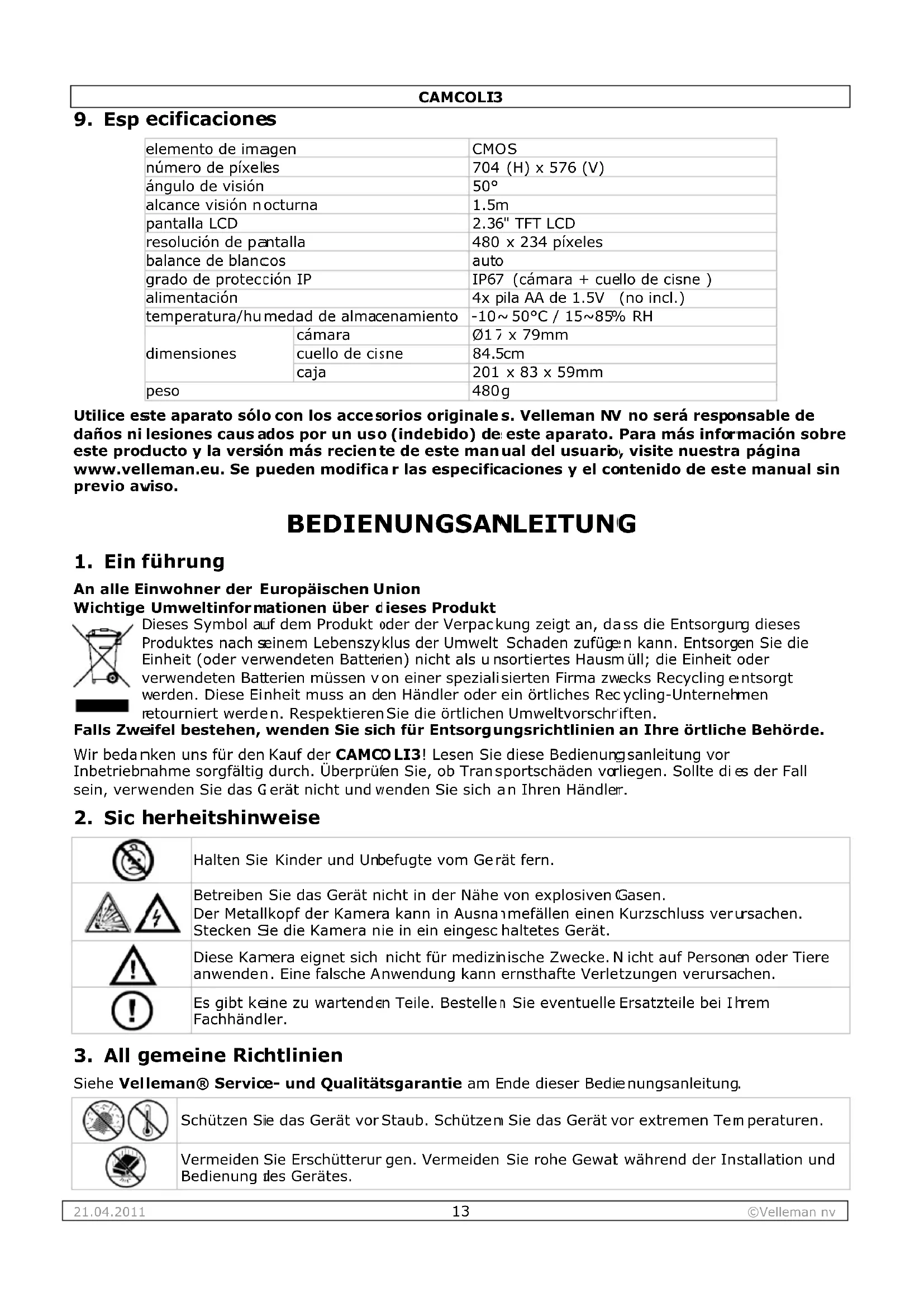 Velleman NV dispone de los derechos de autor para este manual del usuario. Todos los derechos mundiales reservados. Está estrictamente prohibido reproducir, traducir, copiar, editar y guardar este manual del usuario o partes de ello sin previo permiso escrito del derecho habiente. © URHEBERRECHT Velleman NV besitzt das Urheberrecht für diese Bedienungsanleitung. Alle weltweiten Rechte vorbehalten. Ohne vorherige schriftliche Genehmigung des Urhebers ist es nicht gestattet, diese Bedienungsanleitung ganz oder in Teilen zu reproduzieren, zu kopieren, zu übersetzen, zu bearbeiten oder zu speichern.21.04.2011