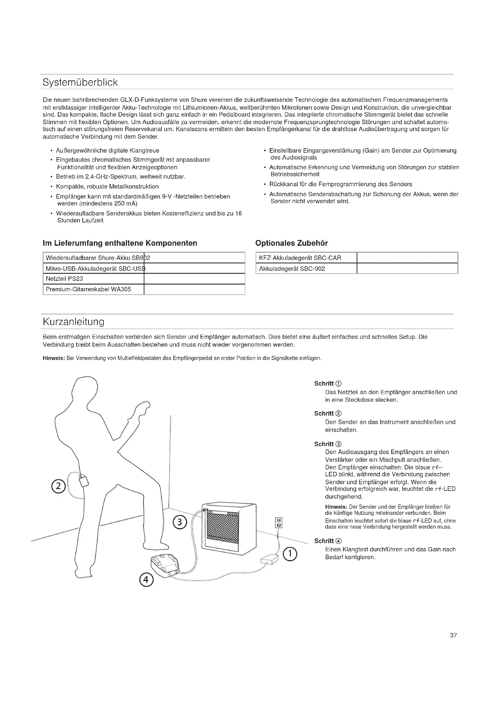 Systemüberblick Die neuen bahnbrechenden GLX-D-Funksysteme von Shure vereinen die zukunftsweisende Technologie des automatischen Frequenzmanagements mit erstklassiger intelligenter Akku-Technologie mit Lithiumionen-Akkus, weltberühmten Mikrofonen sowie Design und Konstruktion, die unvergleichbar sind. Das kompakte, flache Design lässt sich ganz einfach in ein Pedalboard integrieren. Das integrierte chromatische Stimmgerät bietet das schnelle Stimmen mit flexiblen Optionen. Um Audioausfälle zu vermeiden, erkennt die modernste Frequenzsprungtechnologie Störungen und schaltet automa- tisch auf einen störungsfreien Reservekanal um. Kanalscans ermitteln den besten Empfängerkanal für die drahtlose Audioübertragung und sorgen für automatische Verbindung mit dem Sender.