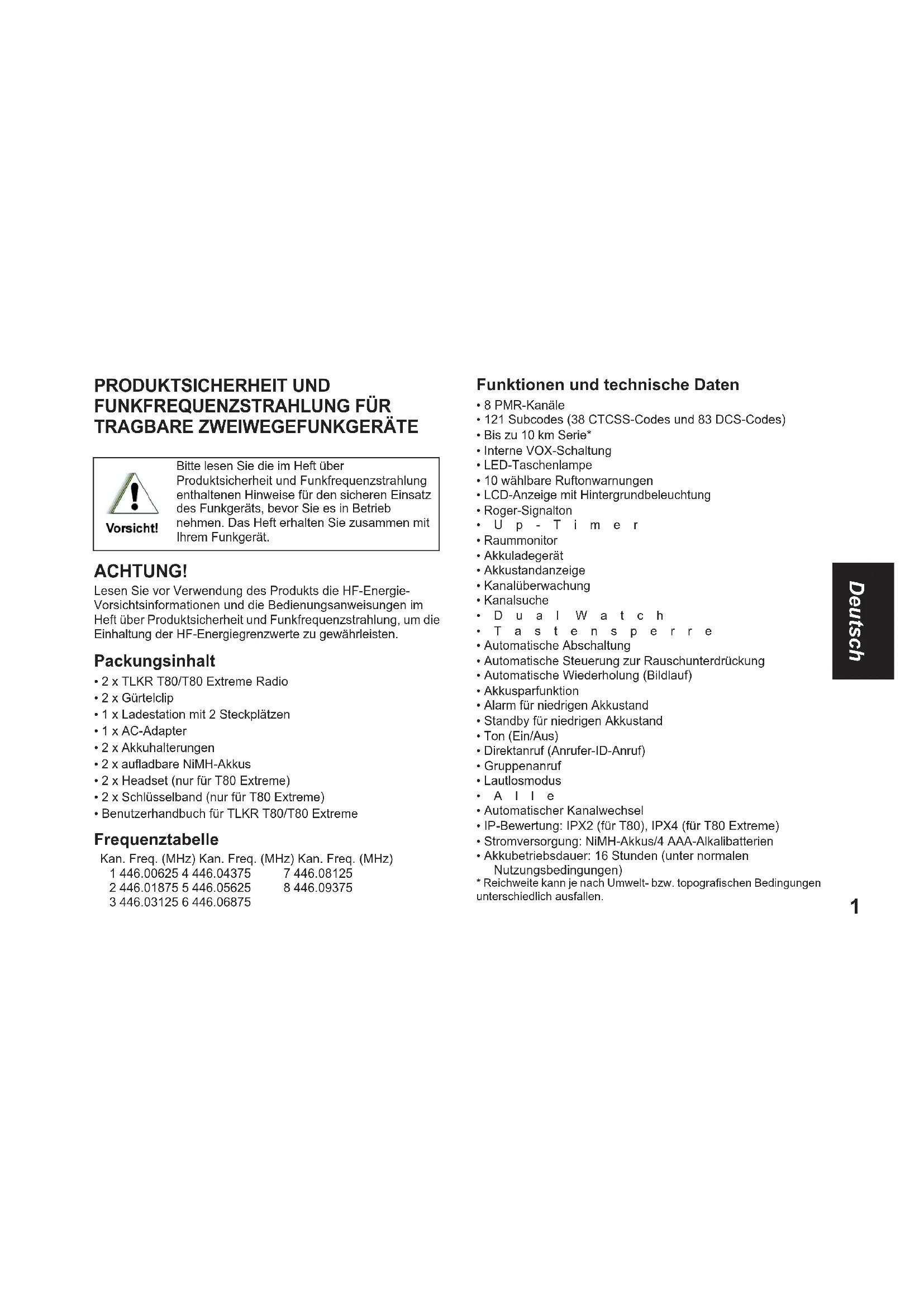 - Benutzerhandbuch für TLKR T80/T80 Extreme Frequenztabelle Funktionen und technische Daten