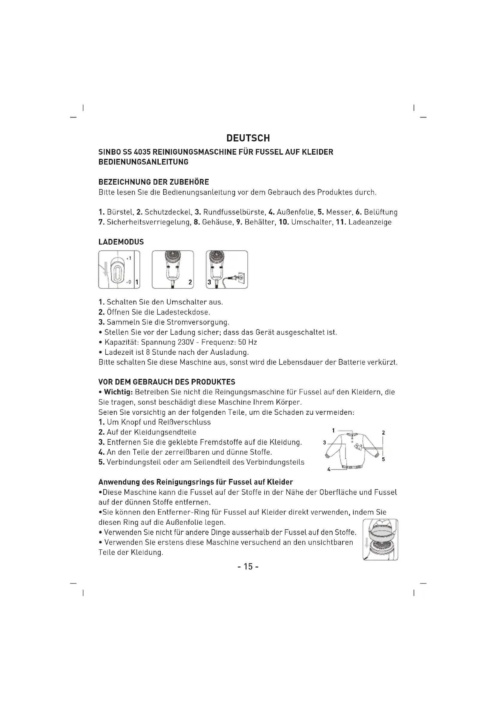 7 8 9SINBO SS 4035 REINIGUNGSMASCHINE FÜR FUSSEL AUF KLEIDER BEDIENUNGSANLEITUNG