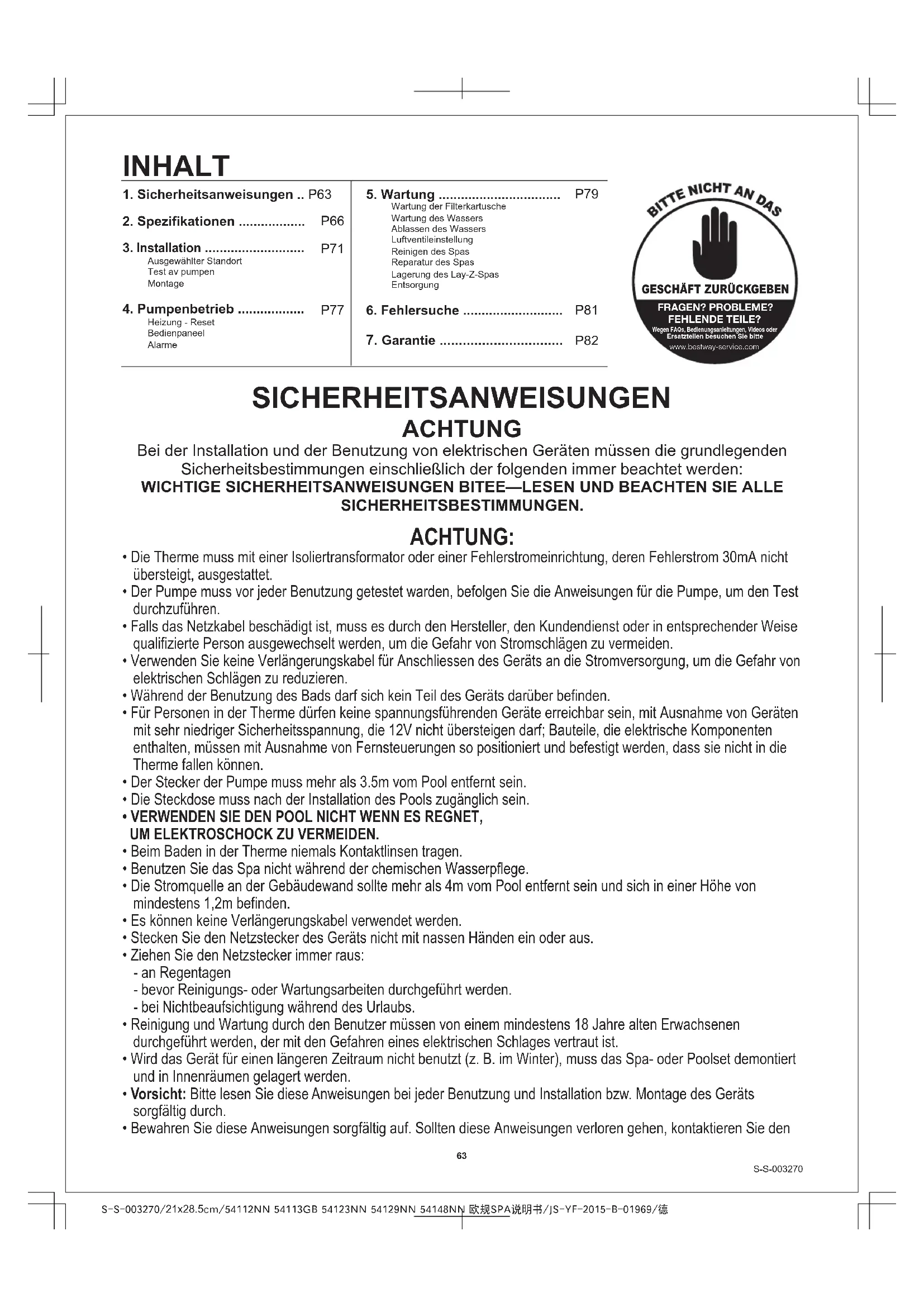 S-S-003270FassungsvermgenWasser(80%):Gre aufgeblasen: G e w i ch t g e f ü l l t : Temperaturbereich: Be t r i e b s d r u ck :Fassungsvermgen:945L (250gal)1.96m x 66cm(77’’ x 26’’)1,215kg (2,678Lb) 40ºC (104ºF)0.8PSI (0.055Bar)4-6 ErwachseneHeizelement:Pumpe:Wasserfluss:Massage-Turbogeblse: 2,000W bei 20ºC 50W Umwlzfilterpumpe St r o mv e r s o r g u n g : 220-240V AC, 2,050W bei 20ºCAnnhrend1.5-2ºC/h (3-4ºF/h) 1,325L/h (350 gal/h)Aufheizzeit: 800WS-S-003270/21x28.5cm/54112NN 54113GB 54123NN 54129NN 54148NN 欧规SPA说明书/JS-YF-2015-B-01969/ Ausgewhlter Standort WIC H T IG: Aufgrund des Gewichts der Lay-Z-Therme, des Wassers und der Benutzer ist es ausgesprochen wichtig, dass der Untergrund, auf dem die Lay-Z-Therme aufgestellt wird, glatt, flach und eben ist und das Gewicht fr die gesamte Installationszeit der Therme gleichmig tragen kann (nicht auf dem Teppich oder hnlichem Material). Falls die Lay-Z-Therme auf einem Untergrund aufgebaut wird, der diese Anforderungen nicht erfllt, werden Beschdigungen, die durch den ungeeigneten Untergrund verursacht werden, nicht von der Herstellergarantie abgedeckt. Die Verantwortung fr die Gewhrleistung der Anforderungen an den Aufstellort liegt beim Eigentmer der Lay-Z-Therme.