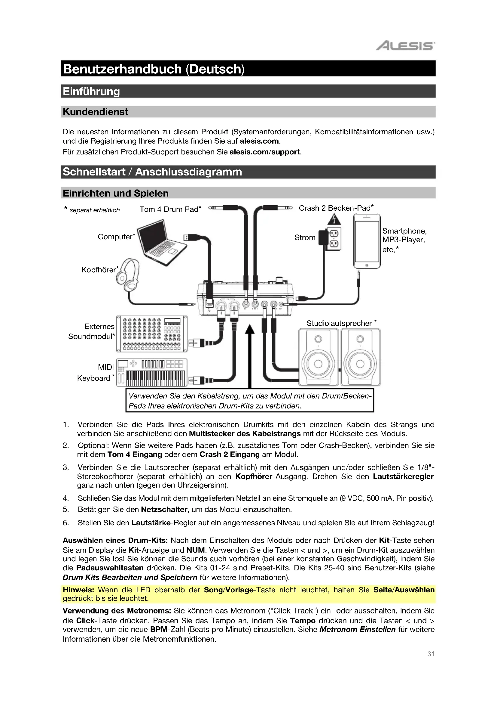 Benutzerhandbuch (Deutsch) Einführung Kundendienst Die neuesten Informationen zu diesem Produkt (Systemanforderungen, Kompatibilitätsinformationen usw.) und die Registrierung Ihres Produkts finden Sie auf alesis.com. Für zusätzlichen Produkt-Support besuchen Sie alesis.com/support. Schnellstart / Anschlussdiagramm Einrichten und Spielen