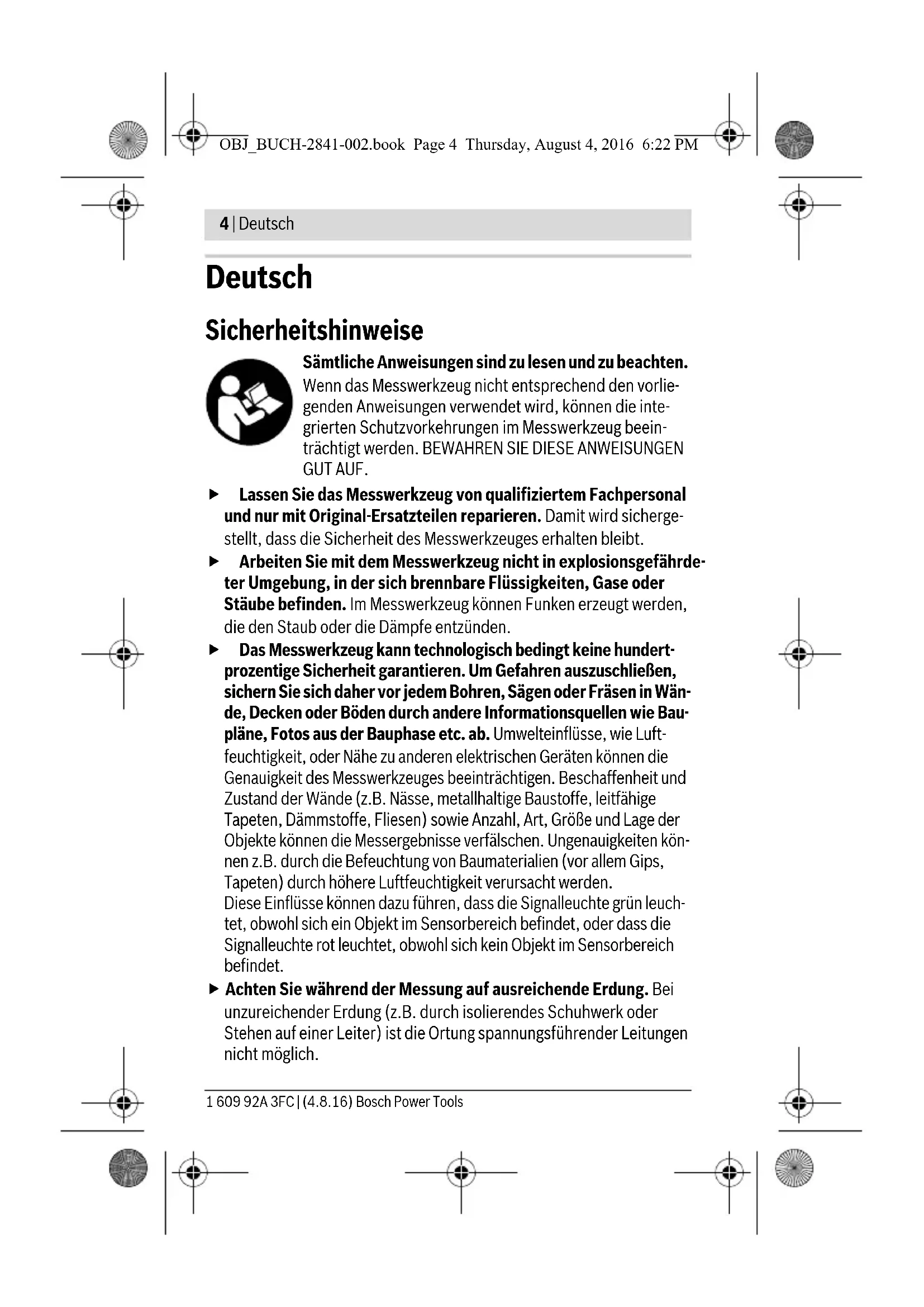 OBJ_BUCH-2841-002.book Page 3 Thursday, August 4, 2016 6:22 PM4 | Deutsch 1 609 92A 3FC | (4.8.16) Bosch Power Tools Deutsch Sicherheitshinweise Sämtliche Anweisungen sind zu lesen und zu beachten. Wenn das Messwerkzeug nicht entsprechend den vorlie- genden Anweisungen verwendet wird, können die inte- grierten Schutzvorkehrungen im Messwerkzeug beein- trächtigt werden. BEWAHREN SIE DIESE ANWEISUNGEN GUT AUF. Lassen Sie das Messwerkzeug von qualifiziertem Fachpersonal und nur mit Original-Ersatzteilen reparieren. Damit wird sicherge- stellt, dass die Sicherheit des Messwerkzeuges erhalten bleibt. Arbeiten Sie mit dem Messwerkzeug nicht in explosionsgefährde- ter Umgebung, in der sich brennbare Flüssigkeiten, Gase oder Stäube befinden. Im Messwerkzeug können Funken erzeugt werden, die den Staub oder die Dämpfe entzünden. Das Messwerkzeug kann technologisch bedingt keine hundert- prozentige Sicherheit garantieren. Um Gefahren auszuschließen, sichern Sie sich daher vor jedem Bohren, Sägen oder Fräsen in Wän- de, Decken oder Böden durch andere Informationsquellen wie Bau- pläne, Fotos aus der Bauphase etc. ab. Umwelteinflüsse, wie Luft- feuchtigkeit, oder Nähe zu anderen elektrischen Geräten können die Genauigkeit des Messwerkzeuges beeinträchtigen. Beschaffenheit und Zustand der Wände (z.B. Nässe, metallhaltige Baustoffe, leitfähige Tapeten, Dämmstoffe, Fliesen) sowie Anzahl, Art, Größe und Lage der Objekte können die Messergebnisse verfälschen. Ungenauigkeiten kön- nen z.B. durch die Befeuchtung von Baumaterialien (vor allem Gips, Tapeten) durch höhere Luftfeuchtigkeit verursacht werden. Diese Einflüsse können dazu führen, dass die Signalleuchte grün leuch- tet, obwohl sich ein Objekt im Sensorbereich befindet, oder dass die Signalleuchte rot leuchtet, obwohl sich kein Objekt im Sensorbereich befindet. Achten Sie während der Messung auf ausreichende Erdung. Bei unzureichender Erdung (z.B. durch isolierendes Schuhwerk oder Stehen auf einer Leiter) ist die Ortung spannungsführender Leitungen nicht möglich. OBJ_BUCH-2841-002.book Page 4 Thursday, August 4, 2016 6:22 PMDeutsch | 5 Bosch Power Tools 1 609 92A 3FC | (4.8.16) Produkt- und Leistungsbeschreibung Bestimmungsgemäßer Gebrauch Das Messwerkzeug ist bestimmt zur Suche nach Eisenmetallen (z.B. Bewehrungsstahl), nach Nichteisenmetallen (z.B. Kupferrohre) sowie spannungsführenden Leitungen in Wänden, Decken und Fußböden. Abgebildete Komponenten Die Nummerierung der abgebildeten Komponenten bezieht sich auf die Darstellung des Messwerkzeugs auf der Grafikseite. 1 Markierungshilfe 2 Signalleuchte 3 Ein-/Ausschalter 4 Arretierung des Batteriefachdeckels 5 Batteriefachdeckel 6 Seriennummer 7 Sensorbereich Technische Daten Digitales Ortungsgerät Truvo Sachnummer 3 603 F68 2.. max. Erfassungstiefe*: – Eisenmetalle – Nichteisenmetalle (Kupferrohr) – Kupferleitungen (spannungsführend)** 70 mm 60 mm 50 mm Kalibrierung automatisch Abschaltautomatik nach ca. 10 min Betriebstemperatur 0 °C...+40 °C Lagertemperatur –20 °C...+70 °C Relative Luftfeuchte 30 ... 80 %