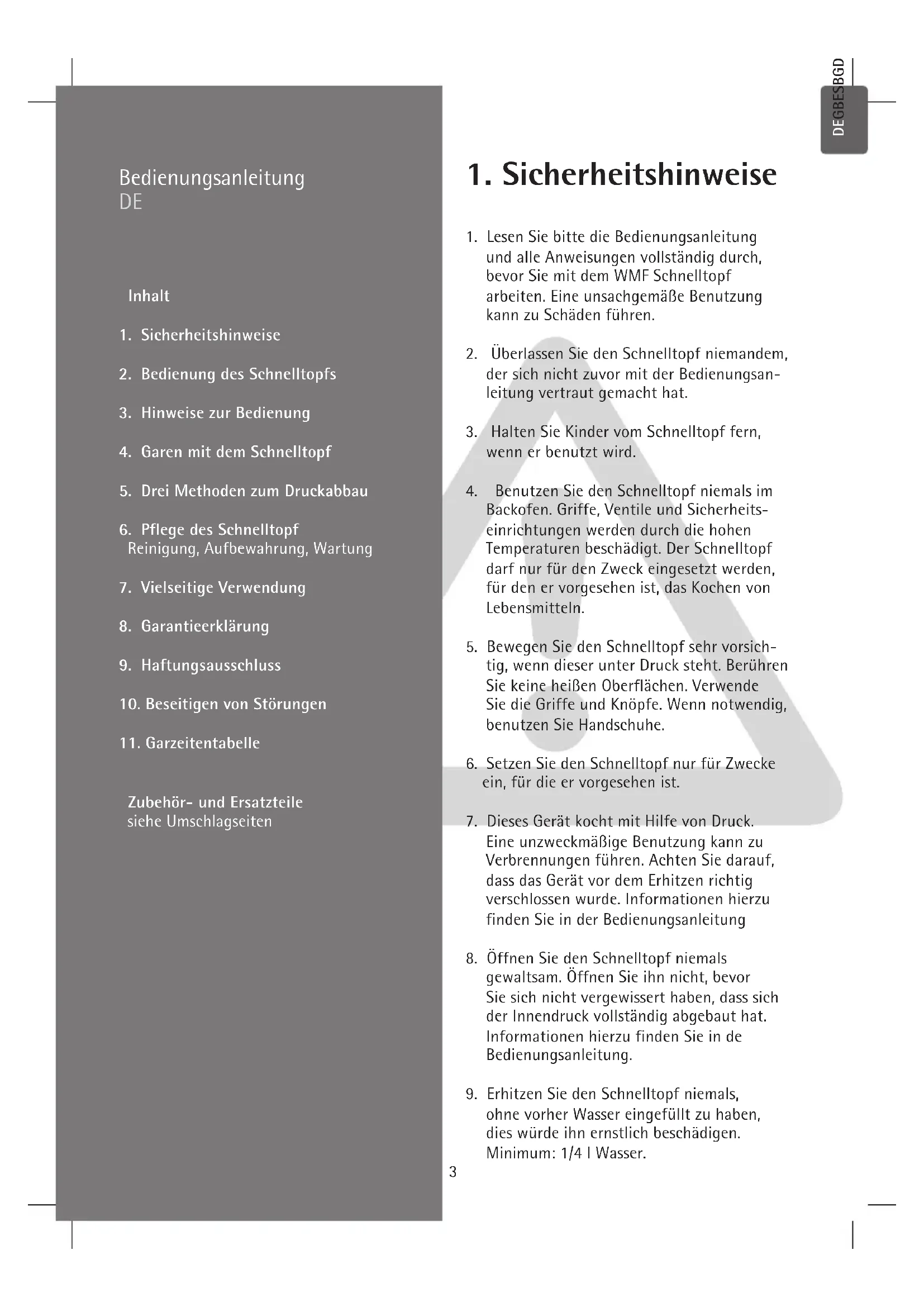 4.1. Allgemeines Im Schnelltopf garen die Speisen unter Druck, d.h. mit Temperaturen über 100 °C. Dadurch verkürzen sich die Garzeiten bis zu 70 %, eine deutliche Energieeinsparung. Durch das kurze Garen im Dampf bleiben Aroma, Ge- schmack und Vitamine weitgehend erhalten. 4.2. Garen mit Einsätzen Je nach Größe des Schnelltopfs können Sie mit Einsätzen (12) und Steg (13) garen. Einsatz und Steg erhalten Sie als Zubehör im Fachhandel (siehe »Zubehör und Ersatzteile« im Umschlag). 4.3. Aufheizen Verschlossenen, gefüllten Topf auf Heizquelle setzen und auf höchste Energiezufuhr ein- stellen. Über die Ankochautomatik (9), die zugleich Sicherheitsventil ist, entweicht in der Ankochphase so lange Luft, bis das Ventil hörbar schließt und sich Druck aufbauen kann. Das Kochsignal (1) steigt an, der gelbe Druck- ring und die beiden orangefarbenen Kochringe werden sichtbar (J). Verringern Sie die Energiezufuhr rechtzeitig und ausreichend, so dass der im Rezept empfohlene orangefarbene Kochring gerade noch sichtbar bleibt. 4.4. Garzeiten Die Garzeit beginnt erst dann, wenn der im Rezept empfohlene Kochring ganz sichtbar ist. Achten Sie darauf, dass die Ringposition stabil bleibt. Regulieren Sie die Energiezufuhr entsprechend. Sinkt das Kochsignal (1) unter den gewünschten orangefarbenen Kochring, müssen Sie die Heizquelle wieder höher stellen. Die Garzeit verlängert sich dadurch etwas. Steigt das Kochsignal (1) über den zweiten orangefarbenen Kochring hinaus, entsteht zu hoher Dampfdruck, der über das Hauptventil (3) am Deckelgriff hörbar entweicht. Den Topf von der Kochstelle nehmen, warten bis sich das Kochsignal auf den zweiten oran- gefarbenen Kochring gesenkt hat und Energie- zufuhr zurückschalten. Die kurzen Garzeiten sind beim Schnellkochen deshalb möglich, weil durch den Dampfdruck im Topf höhere Temperaturen herrschen: Erster Ring, ca. 110 °C für empfindliche Speisen wie Fisc oder Kompott. (45 kPa Betriebsdruck, 90 kPa Regeldruck) Zweiter Ring, ca. 119 °C für alle übrigen Speisen. (95 kPa Betriebsdruck, 130 kPa Regeldruck, max. 150 kPa) Energiebewusste schalten die Heizquelle bereits vor Beendigung der Garzeit aus, da die im Topf gespeicherte Wärme ausreicht, den Garprozess zu beenden. Garzeiten können bei demselben Gargut unterschiedlich sein, da Menge, Form und Beschaffenheit des Lebensmittels variieren. 4.5. Öffnen des Topfes Nach Ablauf der Garzeit Schnelltopf von der Heizquelle nehmen. Grundsätzlich darf der Deckel nur geöffnet und vom Topf genommen werden, wenn der Topf drucklos ist, d.h. das Kochsignal (1) muss vollkommen im Griff verschwunden sein (I).9 8 DEGBESBGDKFIFRGRITNLNOPLPTRUSESKSICZTRHUHR ungelochten Einsatz setzen und bei Bedarf zu- ckern. Beim 2. orangefarbenen Kochring garen. Je nach Obstsorte liegt die Zeit zwischen 10-20 Minuten. Topf unter fli - ßendem Wasser drucklos machen (Methode 3). Vor dem Öffnen kurz rütteln. 7.5. Sterilisieren Babyflaschen, Einmachgläser etc. könne schnell sterilisiert werden. Teile mit der Öffnung nach unten in den gelochten Einsatz stellen, 1/4 l Wasser zugeben und 20 min beim 2. orangefarbenen Kochring sterilisieren. Langsam abkühlen lassen (Methode 1). 7.6. Garen mit Einsätzen Je nach Größe des Schnelltopfs können Sie mit Einsätzen und Steg garen. Einsatz und Steg erhalten Sie als Zubehör im Fachhandel. Sie können im Schnelltopf auch mehrere Gerichte gleichzeitig zubereiten. Die einzelnen Beilagen werden durch Einsätze getrennt. Das Gericht mit der längsten Garzeit wird zuerst ohne Einsatz in den Topf gefüllt. Beispiele Braten (20 min) – Topfboden Kartoffeln (8 min) – gelochter Einsatz Gemüse (8 min) – ungelochter Einsatz Den Braten zunächst 12 min garen. Dann den Topf nach Anleitung öffnen. Kartoffeln im gelochten Einsatz auf den Steg stellen, Gemüse im ungelochten Einsatz einsetzen, Topf schlie- ßen und weitere 8 min garen. Unterscheiden sich die Garzeiten nicht wesentlich, können alle Einsätze gleichzeitig in den Topf gegeben werden. Durch das Öffnen zwischendurch ent- weicht Dampf, geben Sie deshalb etwas mehr als die erforderliche Flüssigkeit in den Topf.