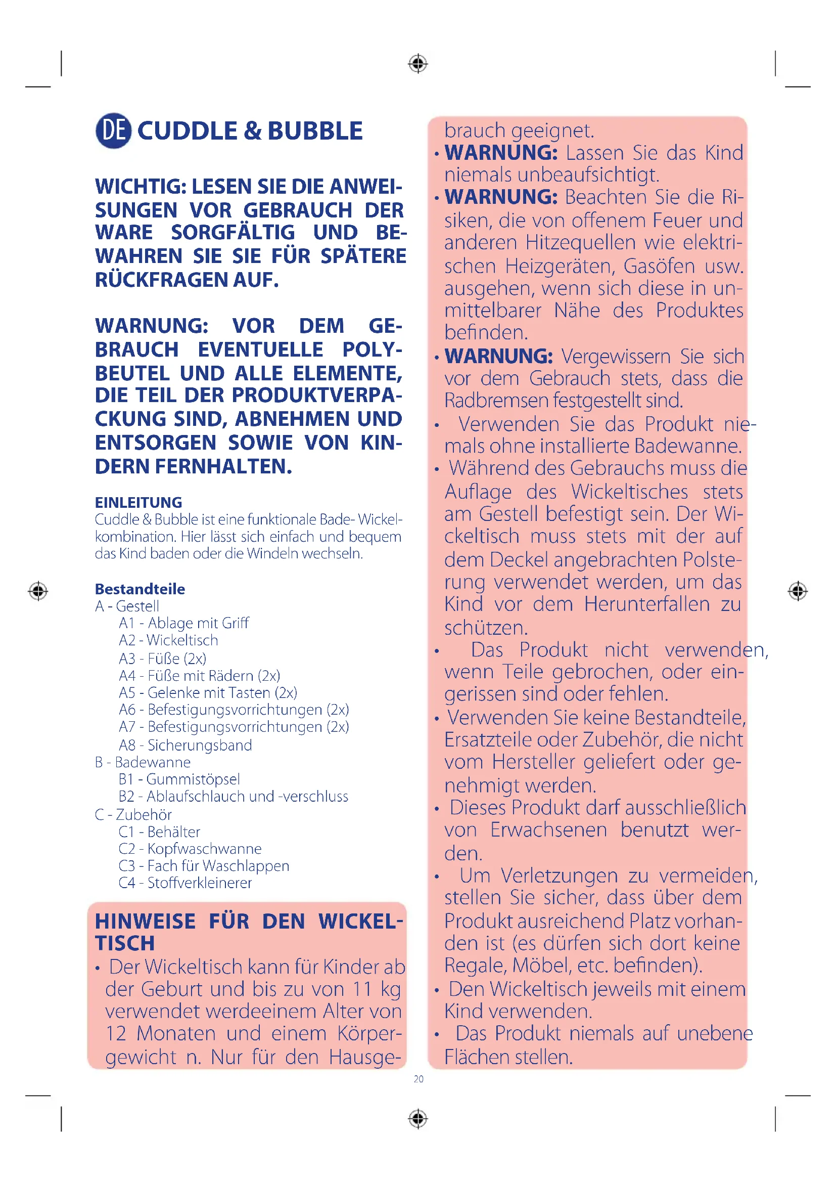 DERN FERNHALTEN. EINLEITUNG Cuddle & Bubble ist eine funktionale Bade- Wickel- kombination. Hier lässt sich einfach und bequem das Kind baden oder die Windeln wechseln. Bestandteile A - Gestell A1 - Ablage mit Gri A2 - Wickeltisch A3 - Füße (2x) A4 - Füße mit Rädern (2x) A5 - Gelenke mit Tasten (2x) A6 - Befestigungsvorrichtungen (2x) A7 - Befestigungsvorrichtungen (2x) A8 - Sicherungsband B - Badewanne B1 - Gummistöpsel B2 - Ablaufschlauch und -verschluss C - Zubehör C1 - Behälter C2 - Kopfwaschwanne C3 - Fach für Waschlappen C4 - Stoverkleinerer