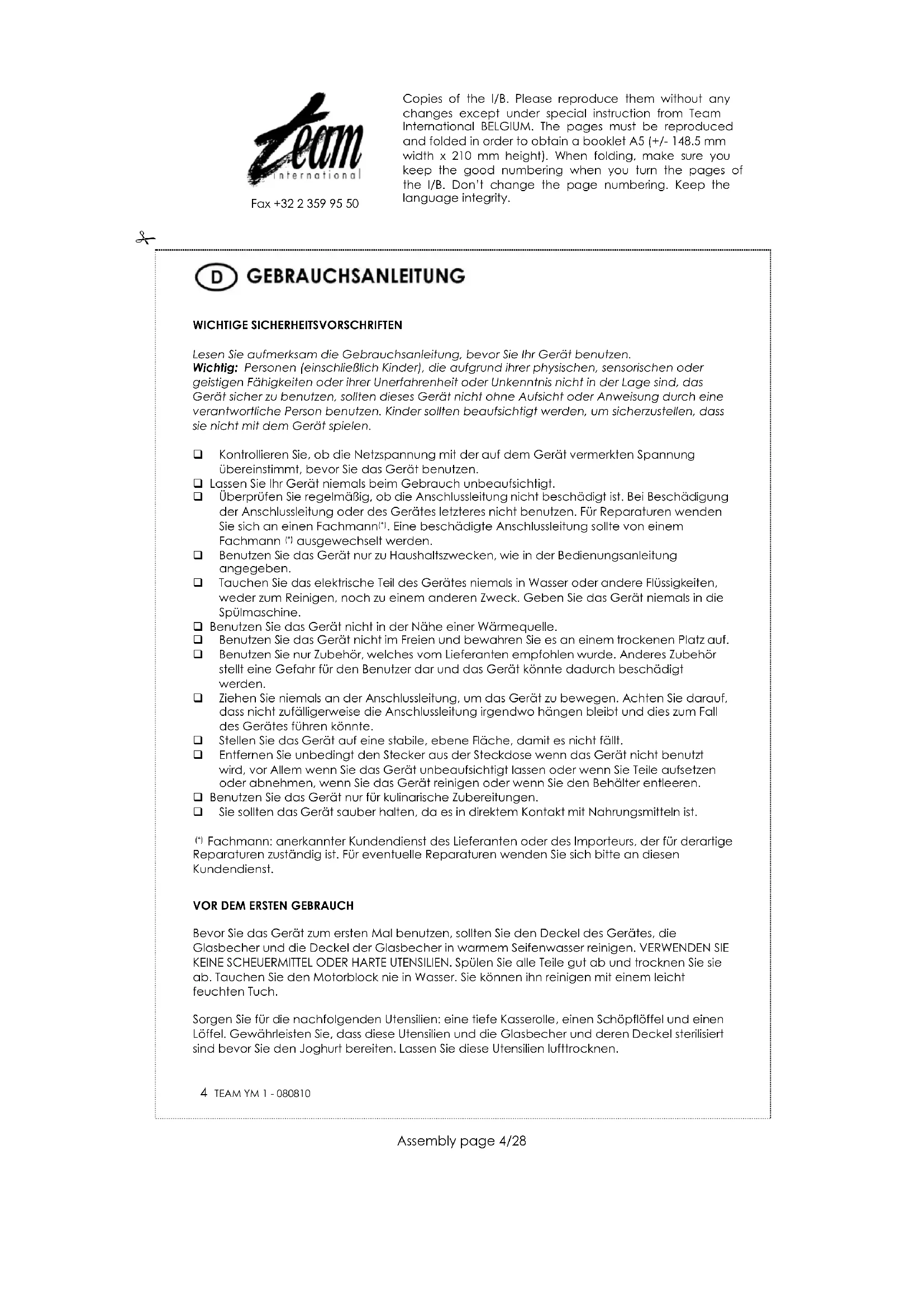 Bevor Sie das Gerät zum ersten Mal benutzen, sollten Sie den Deckel des Gerätes, die Glasbecher und die Deckel der Glasbecher in warmem Seifenwasser reinigen. VERWENDEN SIE KEINE SCHEUERMITTEL ODER HARTE UTENSILIEN. Spülen Sie alle Teile gut ab und trocknen Sie sie ab. Tauchen Sie den Motorblock nie in Wasser. Sie können ihn reinigen mit einem leicht feuchten Tuch. Sorgen Sie für die nachfolgenden Utensilien: eine tiefe Kasserolle, einen Schöpflöffel und einen Löffel. Gewährleisten Sie, dass diese Utensilien und die Glasbecher und deren Deckel sterilisiert sind bevor Sie den Joghurt bereiten. Lassen Sie diese Utensilien lufttrocknen. Copies of the I/B. Please reproduce them without any changes except under special instruction from Team International BELGIUM. The pages must be reproduced and folded in order to obtain a booklet A5 (+/- 148.5 mm width x 210 mm height). When folding, make sure you keep the good numbering when you turn the pages of the I/B. Don’t change the page numbering. Keep the language integrity.