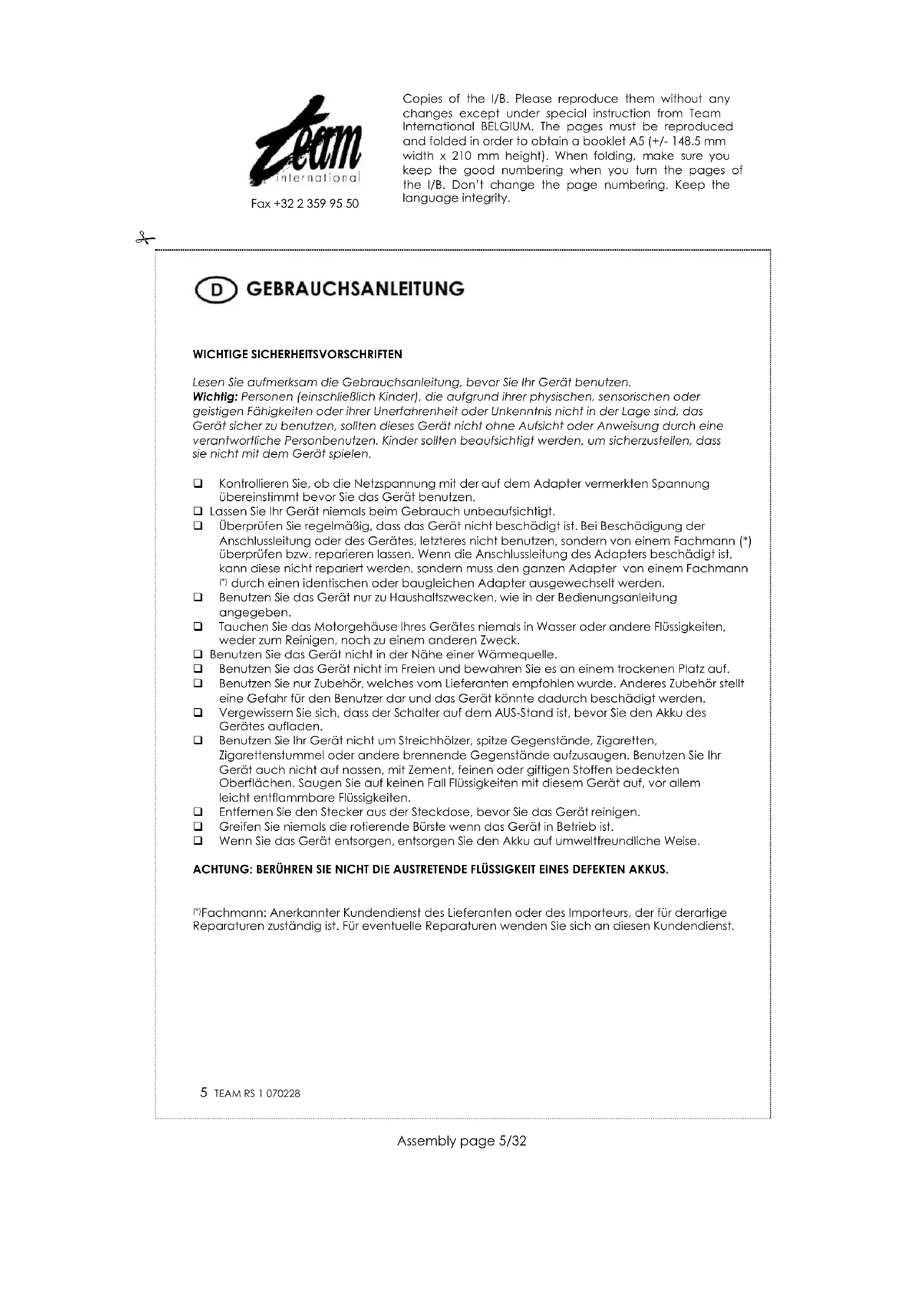 ABHILFE Gerät funktioniert nicht Akku nicht aufgeladen Keine Spannung an der Steckdose Gerät benötigt Service Akku aufladen Überprüfen Sie die Sicherung Wenden Sie sich bitte an einen Fachmann(*) Gerät funktioniert schlecht Staubsammelbehälter ist voll Akku nicht aufgeladen Entleeren Sie den Staubsammelbehälter Akku aufladen Rotierende Bürste ist blockiert Es gibt zu viel Dreck an der Bürste Entfernen Sie die Haare und anderen Fremdgegenstände Staub kommt aus dem Gerät Staubsammelbehälter ist voll Das Gerät ist schräg Entleeren Sie den Staubsammelbehälter Stellen Sie das Gerät auf eine ebene Fläche Copies of the I/B. Please reproduce them without any changes except under special instruction from Team International BELGIUM. The pages must be reproduced and folded in order to obtain a booklet A5 (+/- 148.5 mm width x 210 mm height). When folding, make sure you keep the good numbering when you turn the pages of the I/B. Don’t change the page numbering. Keep the language integrity. 8 TEAM RS 1 070228