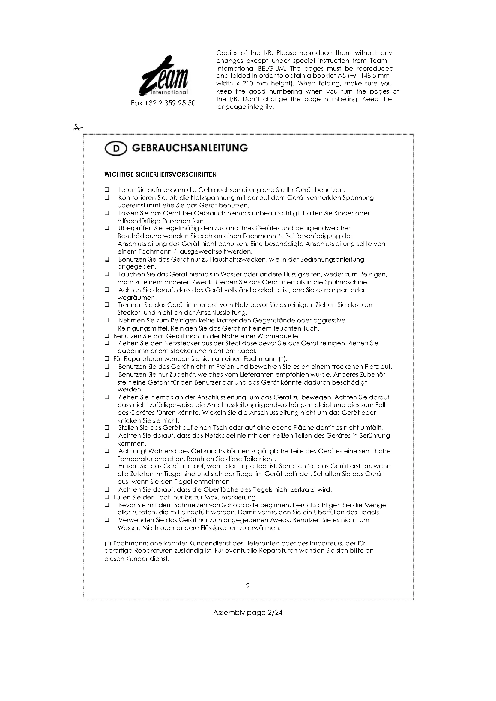 ausgewechselt werden. Benutzen Sie das Gerät nur zu Haushaltszwecken, wie in der Bedienungsanleitung angegeben. Tauchen Sie das Gerät niemals in Wasser oder andere Flüssigkeiten, weder zum Reinigen, noch zu einem anderen Zweck. Geben Sie das Gerät niemals in die Spülmaschine. Achten Sie darauf, dass das Gerät vollständig erkaltet ist, ehe Sie es reinigen oder wegräumen. Trennen Sie das Gerät immer erst vom Netz bevor Sie es reinigen. Ziehen Sie dazu am Stecker, und nicht an der Anschlussleitung. Nehmen Sie zum Reinigen keine kratzenden Gegenstände oder aggressive Reinigungsmittel. Reinigen Sie das Gerät mit einem feuchten Tuch. Benutzen Sie das Gerät nicht in der Nähe einer Wärmequelle. Ziehen Sie den Netzstecker aus der Steckdose bevor Sie das Gerät reinigen. Ziehen Sie dabei immer am Stecker und nicht am Kabel. Für Reparaturen wenden Sie sich an einen Fachmann (*). Benutzen Sie das Gerät nicht im Freien und bewahren Sie es an einem trockenen Platz auf. Benutzen Sie nur Zubehör, welches vom Lieferanten empfohlen wurde. Anderes Zubehör stellt eine Gefahr für den Benutzer dar und das Gerät könnte dadurch beschädigt werden. Ziehen Sie niemals an der Anschlussleitung, um das Gerät zu bewegen. Achten Sie darauf, dass nicht zufälligerweise die Anschlussleitung irgendwo hängen bleibt und dies zum Fall des Gerätes führen könnte. Wickeln Sie die Anschlussleitung nicht um das Gerät oder knicken Sie sie nicht. Stellen Sie das Gerät auf einen Tisch oder auf eine ebene Fläche damit es nicht umfällt. Achten Sie darauf, dass das Netzkabel nie mit den heißen Teilen des Gerätes in Berührung kommen. Achtung! Während des Gebrauchs können zugängliche Teile des Gerätes eine sehr hohe Temperatur erreichen. Berühren Sie diese Teile nicht. Heizen Sie das Gerät nie auf, wenn der Tiegel leer ist. Schalten Sie das Gerät erst an, wenn alle Zutaten im Tiegel sind und sich der Tiegel im Gerät befindet. Schalten Sie das Gerät aus, wenn Sie den Tiegel entnehmen Achten Sie darauf, dass die Oberfläche des Tiegels nicht zerkratzt wird. Füllen Sie den Topf nur bis zur Max.-markierung Bevor Sie mit dem Schmelzen von Schokolade beginnen, berücksichtigen Sie die Menge aller Zutaten, die mit eingefüllt werden. Damit vermeiden Sie ein Überfüllen des Tiegels. Verwenden Sie das Gerät nur zum angegebenen Zweck. Benutzen Sie es nicht, um Wasser, Milch oder andere Flüssigkeiten zu erwärmen. (*) Fachmann: anerkannter Kundendienst des Lieferanten oder des Importeurs, der für derartige Reparaturen zuständig ist. Für eventuelle Reparaturen wenden Sie sich bitte an diesen Kundendienst. Copies of the I/B. Please reproduce them without any changes except under special instruction from Team International BELGIUM. The pages must be reproduced and folded in order to obtain a booklet A5 (+/- 148.5 mm width x 210 mm height). When folding, make sure you keep the good numbering when you turn the pages of the I/B. Don’t change the page numbering. Keep the language integrity.