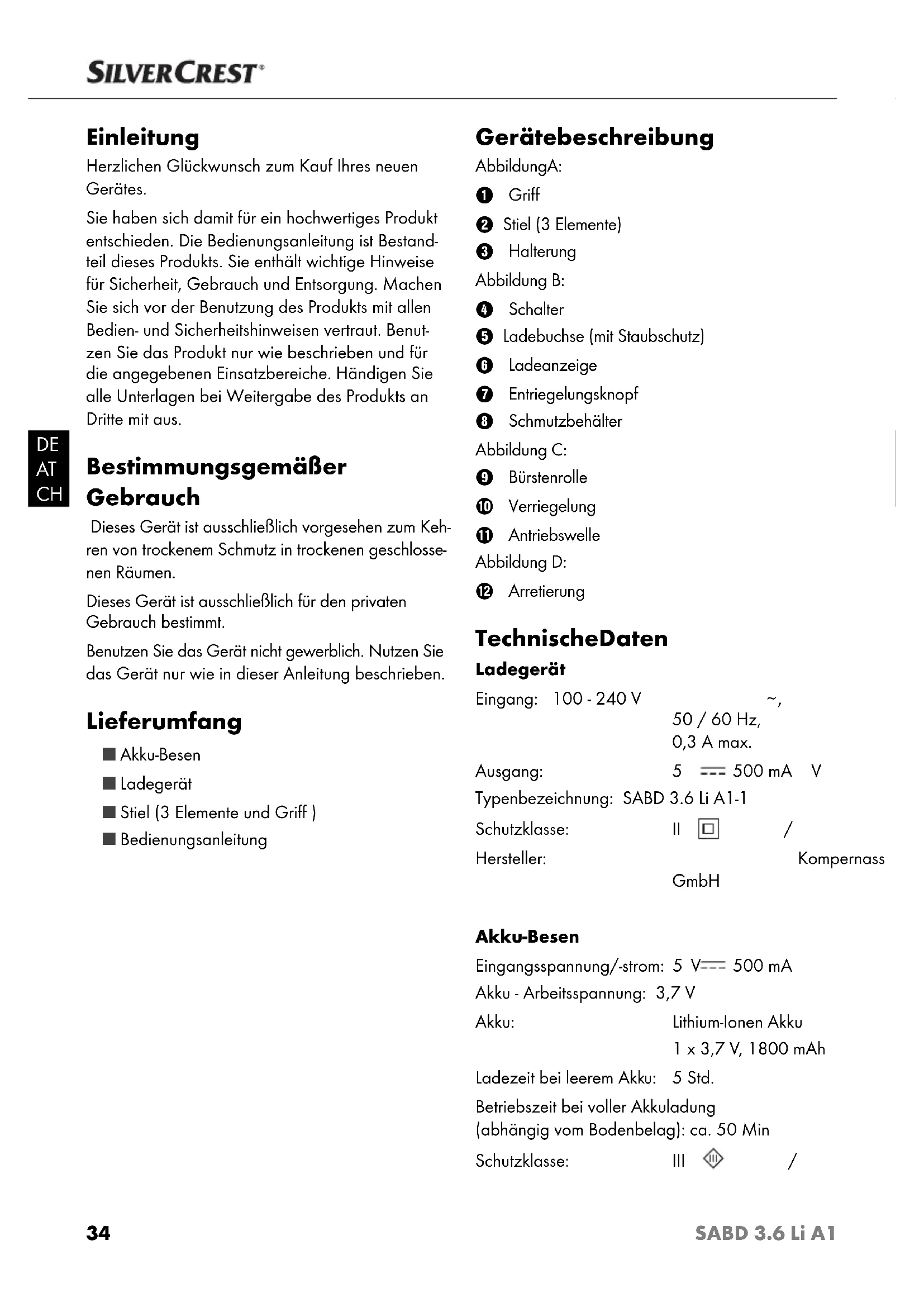 50 / 60 Hz, 0,3 A max. Ausgang: 5 V 500 mA Typenbezeichnung: SABD 3.6 Li A1-1 Schutzklasse: II / Hersteller: Kompernass Handels GmbH Akku-Besen Eingangsspannung/-strom: 5 V 500 mA Akku - Arbeitsspannung: 3,7 V Akku: Lithium-Ionen Akku 1 x 3,7 V, 1800 mAh Ladezeit bei leerem Akku: 5 Std. Betriebszeit bei voller Akkuladung (abhängig vom Bodenbelag): ca. 50 Min Schutzklasse: III / IB_100114_SABD3.6LiA1_DK_BE_NL.indb 34IB_100114_SABD3.6LiA1_DK_BE_NL.indb 34 18.07.14 11:5418.07.14 11:5435 SABD 3.6 Li A1