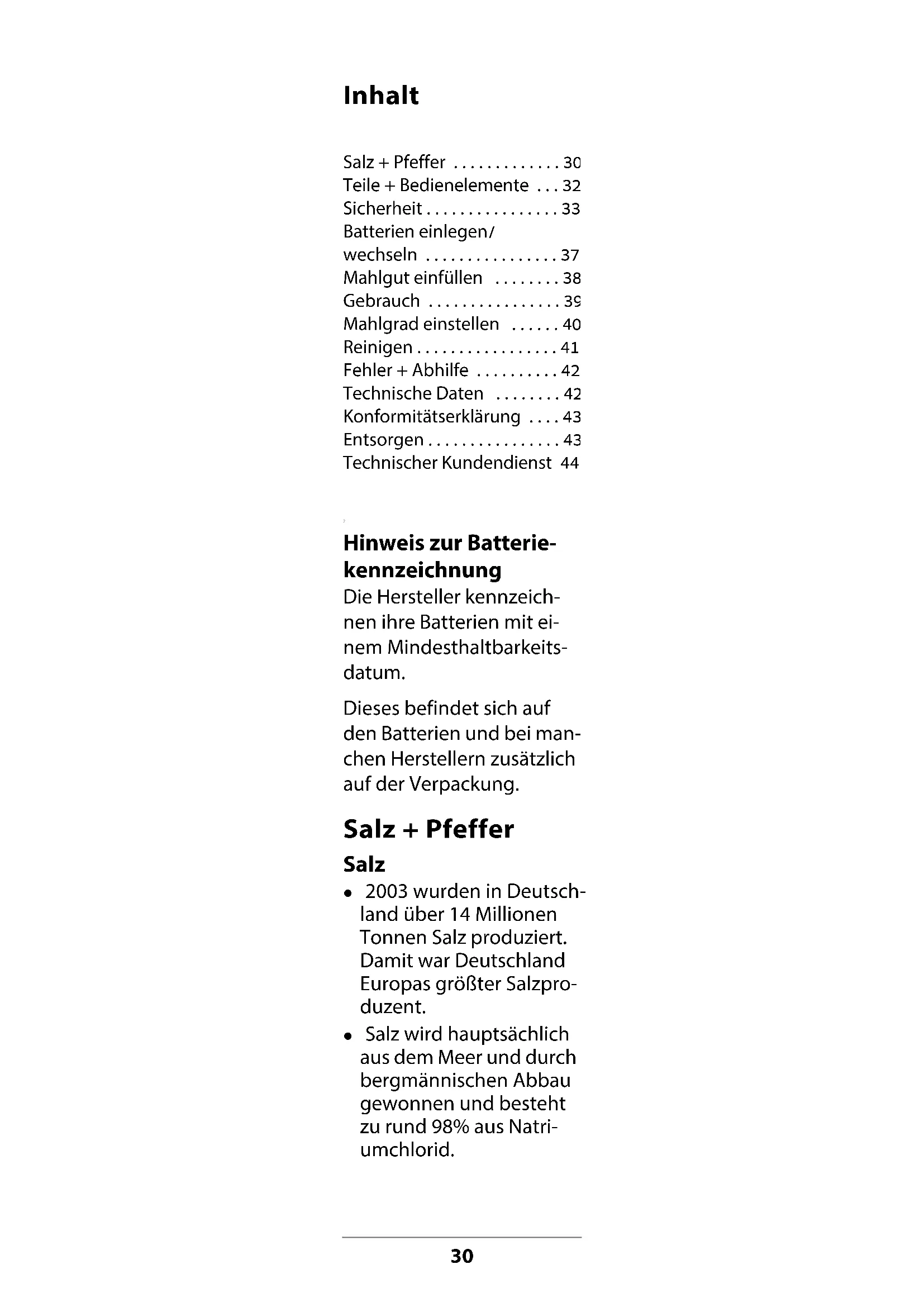 - Hinweis zur Batterie- kennzeichnung Die Hersteller kennzeich- nen ihre Batterien mit ei- nem Mindesthaltbarkeits- datum. Dieses befindet sich auf den Batterien und bei man- chen Herstellern zusätzlich auf der Verpackung. Salz + Pfeffer Salz z 2003 wurden in Deutsch- land über 14 Millionen Tonnen Salz produziert. Damit war Deutschland Europas größter Salzpro- duzent. z Salz wird hauptsächlich aus dem Meer und durch bergmännischen Abbau gewonnen und besteht zu rund 98% aus Natri- umchlorid. Salz + Pfeffer p. 30
