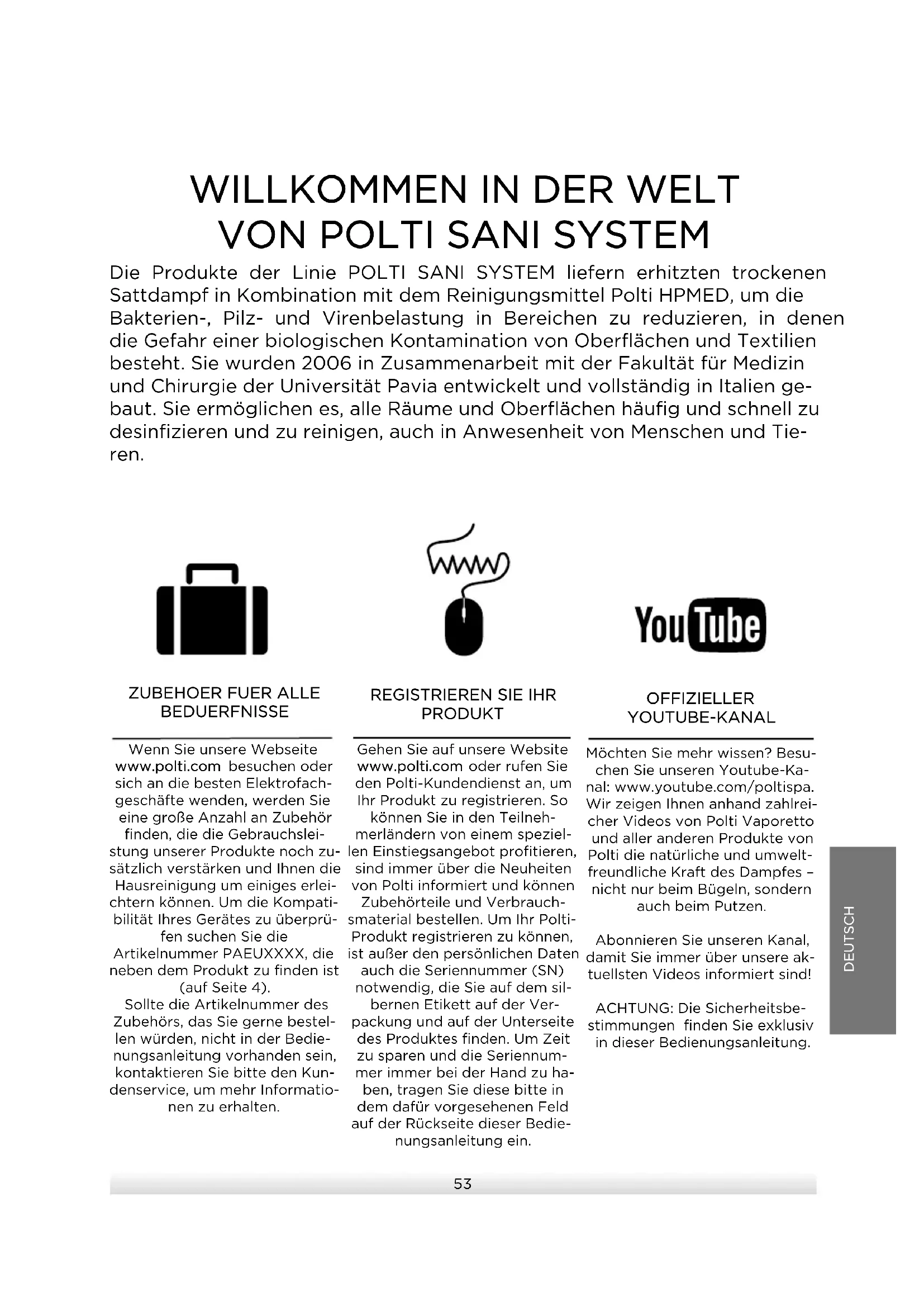 PRODUKT Gehen Sie auf unsere Website www.polti.com oder rufen Sie den Polti-Kundendienst an, um Ihr Produkt zu registrieren. So können Sie in den Teilneh- merländern von einem speziel- len Einstiegsangebot profitieren, sind immer über die Neuheiten von Polti informiert und können Zubehörteile und Verbrauch- smaterial bestellen. Um Ihr Polti- Produkt registrieren zu können, ist außer den persönlichen Daten auch die Seriennummer (SN) notwendig, die Sie auf dem sil- bernen Etikett auf der Ver- packung und auf der Unterseite des Produktes finden. Um Zeit zu sparen und die Seriennum- mer immer bei der Hand zu ha- ben, tragen Sie diese bitte in dem dafür vorgesehenen Feld auf der Rückseite dieser Bedie- nungsanleitung ein. OFFIZIELLER YOUTUBE-KANAL Möchten Sie mehr wissen? Besu- chen Sie unseren Youtube-Ka- nal: www.youtube.com/poltispa. Wir zeigen Ihnen anhand zahlrei- cher Videos von Polti Vaporetto und aller anderen Produkte von Polti die natürliche und umwelt- freundliche Kraft des Dampfes – nicht nur beim Bügeln, sondern auch beim Putzen. Abonnieren Sie unseren Kanal, damit Sie immer über unsere ak- tuellsten Videos informiert sind! ACHTUNG: Die Sicherheitsbe- stimmungen finden Sie exklusiv in dieser Bedienungsanleitung.54 SICHERHEITSHINWEISE WICHTIGE VORSICHTSMASSNAHMEN ACHTUNG! VOR DEM GEBRAUCH DES GERÄTS ALLE