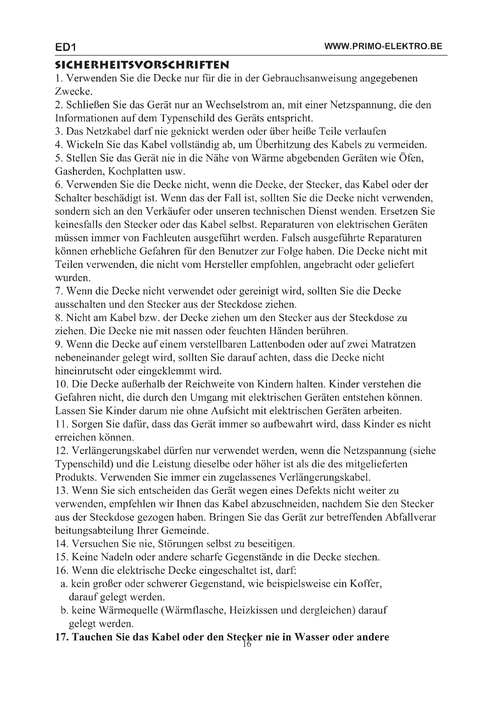 ED1 - Elektrische Heizdecke PRIMO - Kostenlose Bedienungsanleitung