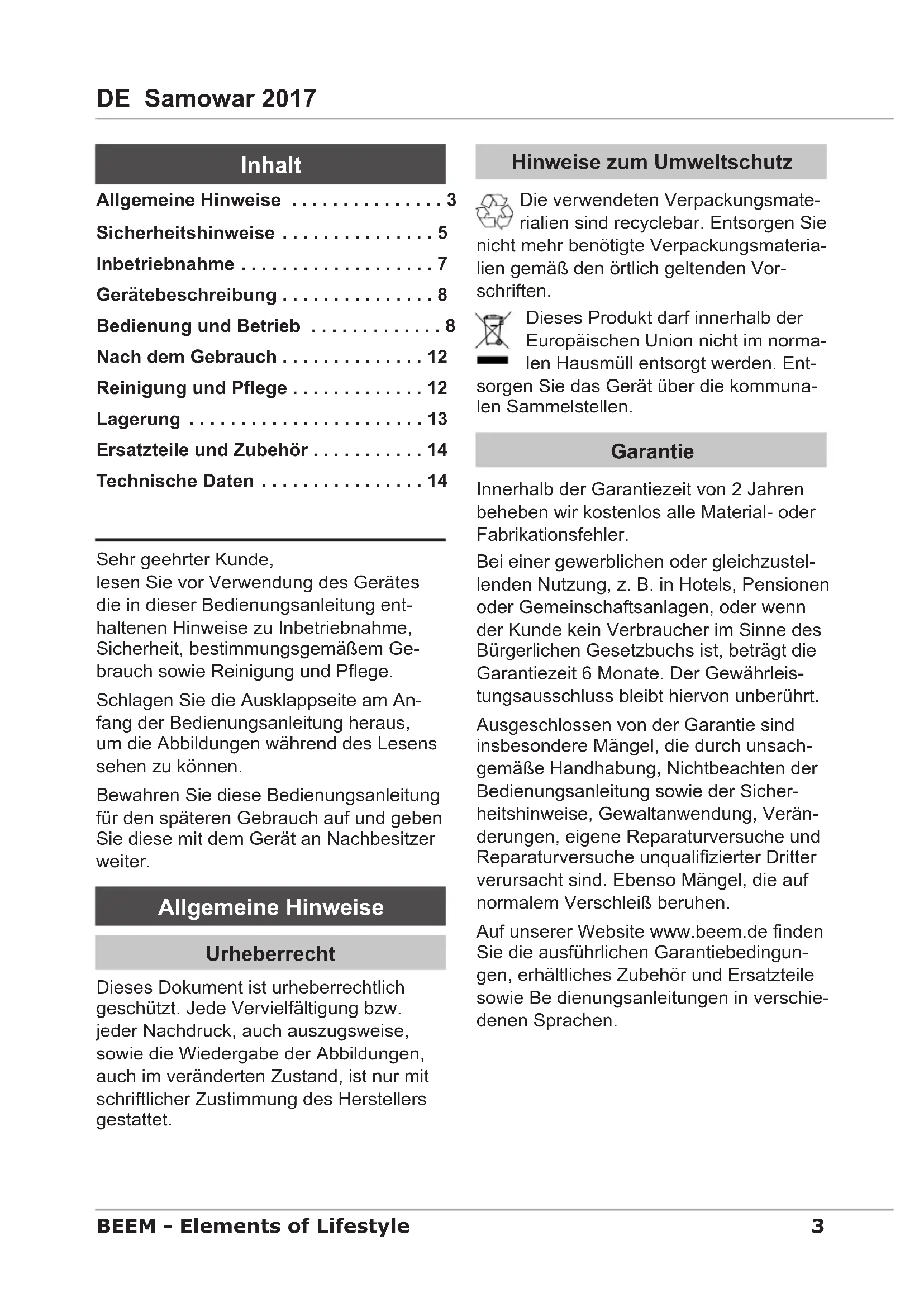 Finden Sie kostenlos die Bedienungsanleitung des Geräts Samowar 2017 BEEM als PDF.