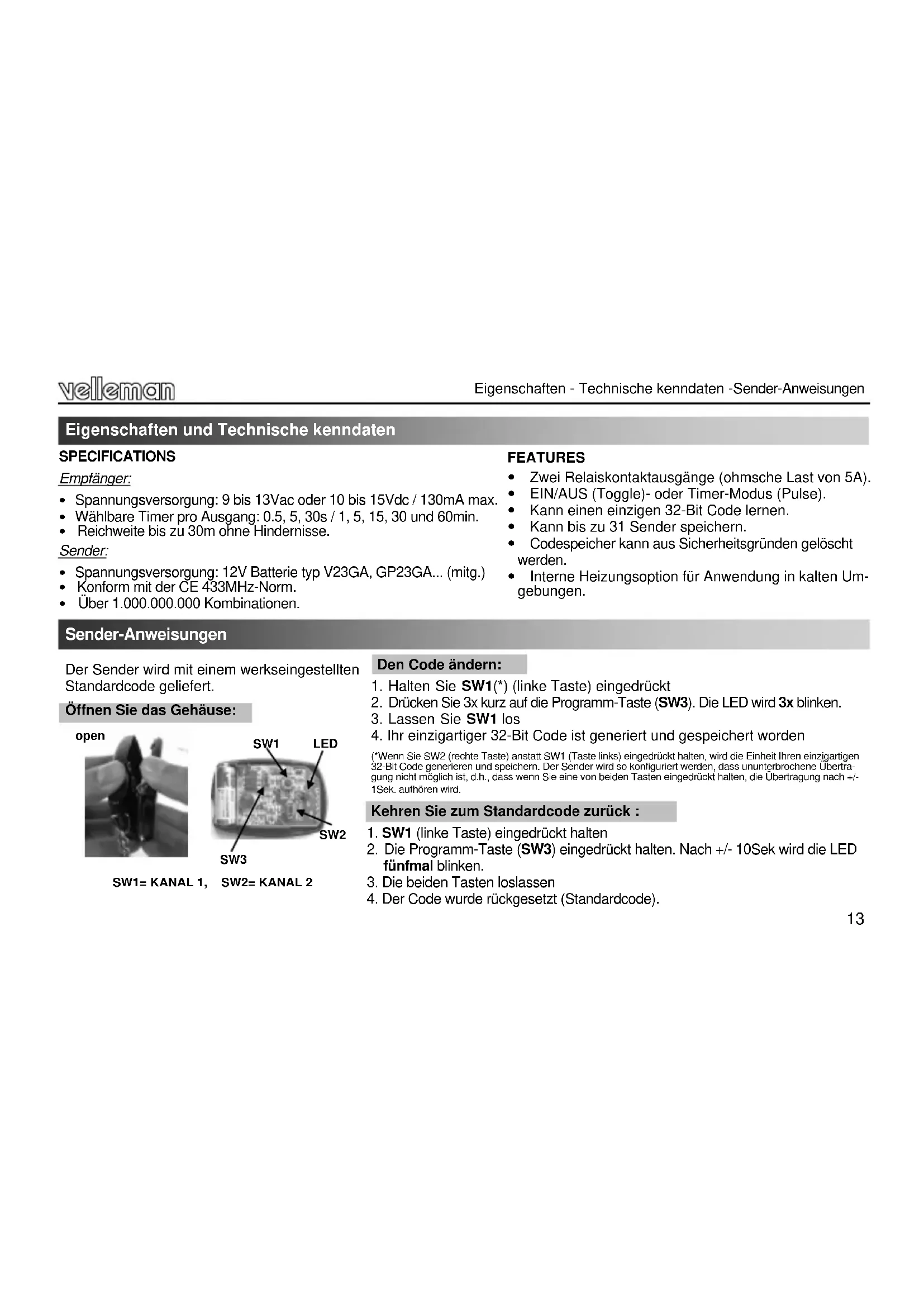 (*Wenn Sie SW2 (rechte Taste) anstatt SW1 (Taste links) eingedrückt halten, wird die Einheit Ihren einzigartigen 32-Bit Code generieren und speichern. Der Sender wird so konfiguriert werden, dass ununterbrochene Übertra- gung nicht möglich ist, d.h., dass wenn Sie eine von beiden Tasten eingedrückt halten, die Übertragung nach +/- 1Sek. aufhören wird. VM130G'1_rev3.pub page 13 Friday, January 25, 2013 11:0814 Empfänger-Anweisungen Empfänger-Anweisungen Fernbedienungsfunktionen lernen : Konfiguration von Kanal 1 (CH1) und Kanal 2 (CH2) : Damit das Gerät funktionieren kann, erzeugt jeder Sender einen Code, den der Empfänger erkennen muss, Gehen Sie zum nächsten Schritt um 1 oder mehrere Sender im Speicher des Empfängers zu speichern