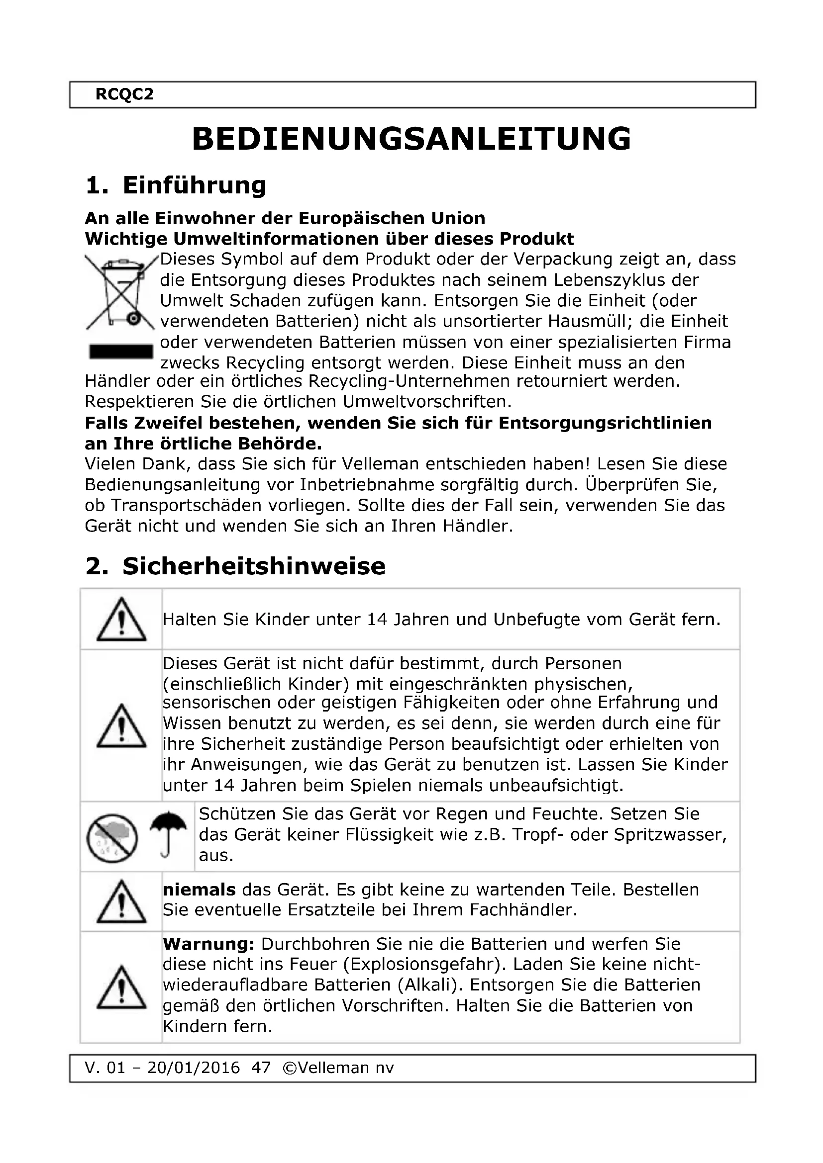 Finden Sie kostenlos die Bedienungsanleitung des Geräts RCQC2 VELLEMAN als PDF.