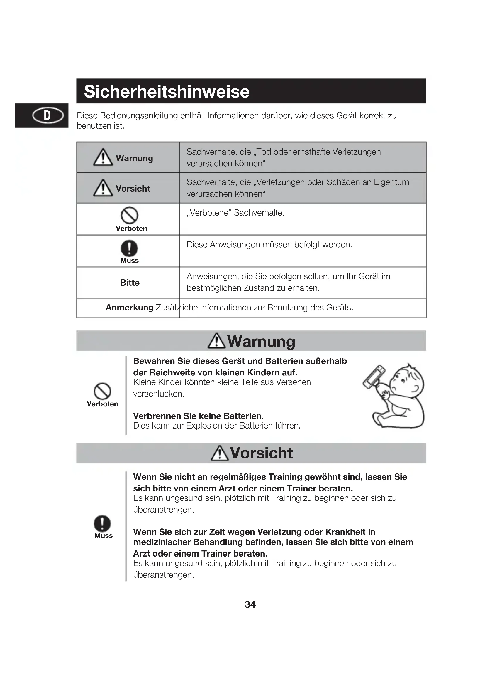 Sicherheitshinweise Warnung Diese Bedienungsanleitung enthält Informationen darüber, wie dieses Gerät korrekt zu benutzen ist. Warnung Sachverhalte, die „Tod oder ernsthafte Verletzungen verursachen können“. Vorsicht Sachverhalte, die „Verletzungen oder Schäden an Eigentum verursachen können“. Verboten „Verbotene“ Sachverhalte. Muss Diese Anweisungen müssen befolgt werden. Bitte Anweisungen, die Sie befolgen sollten, um Ihr Gerät im bestmöglichen Zustand zu erhalten. Anmerkung Zusätzliche Informationen zur Benutzung des Geräts. Vorsicht Verboten Bewahren Sie dieses Gerät und Batterien außerhalb der Reichweite von kleinen Kindern auf. Kleine Kinder könnten kleine Teile aus Versehen verschlucken. Verbrennen Sie keine Batterien. Dies kann zur Explosion der Batterien führen. Muss Wenn Sie nicht an regelmäßiges Training gewöhnt sind, lassen Sie sich bitte von einem Arzt oder einem Trainer beraten. Es kann ungesund sein, plötzlich mit Training zu beginnen oder sich zu überanstrengen. Wenn Sie sich zur Zeit wegen Verletzung oder Krankheit in medizinischer Behandlung befinden, lassen Sie sich bitte von einem Arzt oder einem Trainer beraten. Es kann ungesund sein, plötzlich mit Training zu beginnen oder sich zu überanstrengen.35