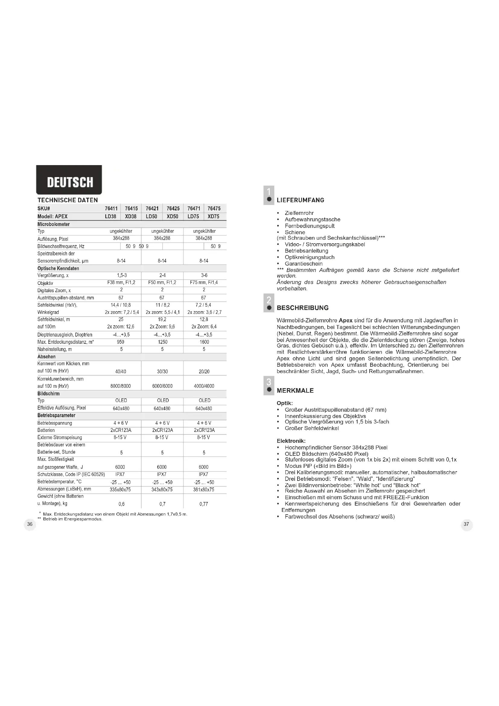 LIEFERUMFANG џ Zielfernrohr џ Aufbewahrungstasche џ Fernbedienungspult џ Schiene (mit Schrauben und Sechskantschlüssel)*** џ Video- / Stromversorgungskabel џ Betriebsanleitung џ Optikreinigungstuch џ Garantieschein *** Bestimmten Aufträgen gemäß kann die Schiene nicht mitgeliefert werden. Änderung des Designs zwecks höherer Gebrauchseigenschaften vorbehalten. BESCHREIBUNG Wärmebild-Zielfernrohre Apex sind für die Anwendung mit Jagdwaffen in Nachtbedingungen, bei Tageslicht bei schlechten Witterungsbedingungen (Nebel, Dunst, Regen) bestimmt. Die Wärmebild-Zielfernrohre sind sogar bei Anwesenheit der Objekte, die die Zielentdeckung stören (Zweige, hohes Gras, dichtes Gebüsch u.ä.), effektiv. Im Unterschied zu den Zielfernrohren mit Restlichtverstärkerröhre funktionieren die Wärmebild-Zielfernrohre Apex ohne Licht und sind gegen Seitenbelichtung unempfindlich. Der Betriebsbereich von Apex umfasst Beobachtung, Orientierung bei beschränkter Sicht, Jagd, Such- und Rettungsmaßnahmen. MERKMALE Optik: џ Großer Austrittspupillenabstand (67 mm) џ Innenfokussierung des Objektivs џ Optische Vergrößerung von 1,5 bis 3-fach џ Großer Sehfeldwinkel Elektronik: џ Hochempfindlicher Sensor 384x288 Pixel џ OLED Bildschirm (640x480 Pixel) џ Stufenloses digitales Zoom (von 1x bis 2x) mit einem Schritt von 0,1x џ Modus PiP («Bild im Bild») џ Drei Kalibrierungsmodi: manueller, automatischer, halbautomatischer џ Drei Betriebsmodi: “Felsen”, “Wald”, “Identifizierung” џ Zwei Bildinversionbetriebe: “White hot” und “Black hot” џ Reiche Auswahl an Absehen im Zielfernrohr gespeichert џ Einschießen mit einem Schuss und mit FREEZE-Funktion џ Kennwertspeicherung des Einschießens für drei Gewehrarten oder Entfernungen џ Farbwechsel des Absehens (schwarz/ weiß)