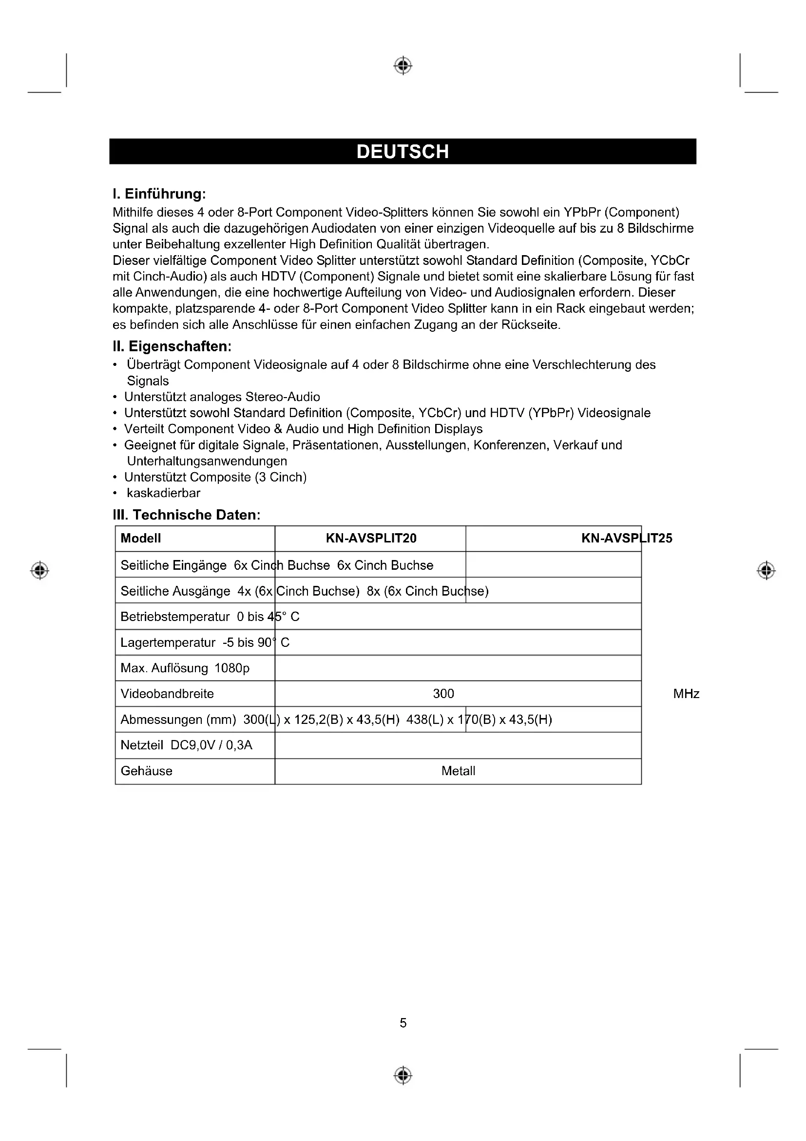 Modell KN-AVSPLIT20 KN-AVSPLIT25 Seitliche Eingänge 6x Cinch Buchse 6x Cinch Buchse Seitliche Ausgänge 4x (6x Cinch Buchse) 8x (6x Cinch Buchse) Betriebstemperatur 0 bis 45° C Lagertemperatur -5 bis 90° C Max. Auflösung 1080p Videobandbreite 300 MHz Abmessungen (mm) 300(L) x 125,2(B) x 43,5(H) 438(L) x 170(B) x 43,5(H) Netzteil DC9,0V / 0,3A Gehäuse Metall6