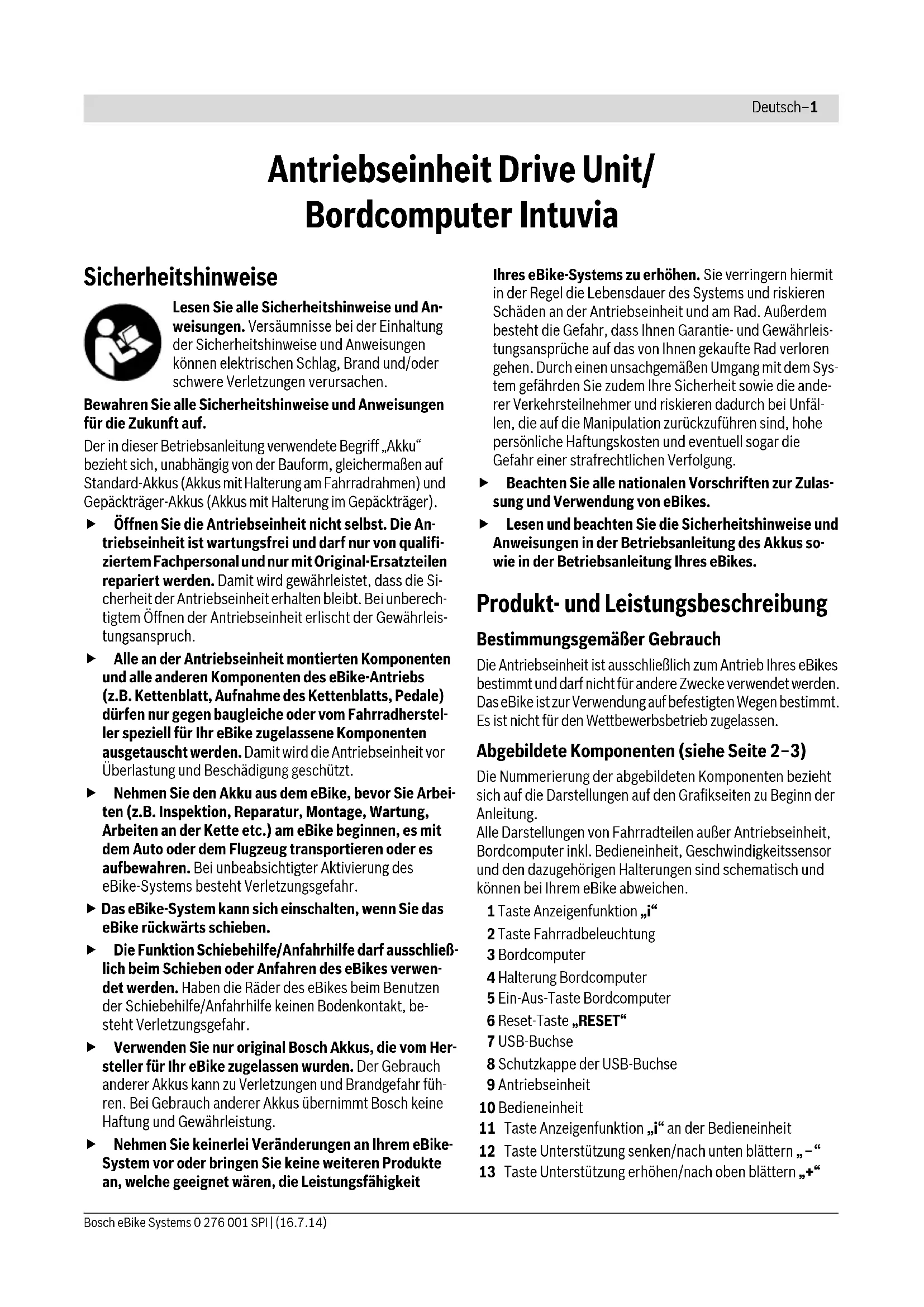 GDeutsch–1 Bosch eBike Systems 0 276 001 SPI | (16.7.14) Antriebseinheit Drive Unit/ Bordcomputer Intuvia Sicherheitshinweise Lesen Sie alle Sicherheitshinweise und An- weisungen. Versäumnisse bei der Einhaltung der Sicherheitshinweise und Anweisungen können elektrischen Schlag, Brand und/oder schwere Verletzungen verursachen. Bewahren Sie alle Sicherheitshinweise und Anweisungen für die Zukunft auf. Der in dieser Betriebsanleitung verwendete Begriff „Akku“ bezieht sich, unabhängig von der Bauform, gleichermaßen auf Standard-Akkus (Akkus mit Halterung am Fahrradrahmen) und Gepäckträger-Akkus (Akkus mit Halterung im Gepäckträger). Öffnen Sie die Antriebseinheit nicht selbst. Die An- triebseinheit ist wartungsfrei und darf nur von qualifi- ziertem Fachpersonal und nur mit Original-Ersatzteilen repariert werden. Damit wird gewährleistet, dass die Si- cherheit der Antriebseinheit erhalten bleibt. Bei unberech- tigtem Öffnen der Antriebseinheit erlischt der Gewährleis- tungsanspruch. Alle an der Antriebseinheit montierten Komponenten und alle anderen Komponenten des eBike-Antriebs (z.B. Kettenblatt, Aufnahme des Kettenblatts, Pedale) dürfen nur gegen baugleiche oder vom Fahrradherstel- ler speziell für Ihr eBike zugelassene Komponenten ausgetauscht werden. Damit wird die Antriebseinheit vor Überlastung und Beschädigung geschützt. Nehmen Sie den Akku aus dem eBike, bevor Sie Arbei- ten (z.B. Inspektion, Reparatur, Montage, Wartung, Arbeiten an der Kette etc.) am eBike beginnen, es mit dem Auto oder dem Flugzeug transportieren oder es aufbewahren. Bei unbeabsichtigter Aktivierung des eBike-Systems besteht Verletzungsgefahr. Das eBike-System kann sich einschalten, wenn Sie das eBike rückwärts schieben. Die Funktion Schiebehilfe/Anfahrhilfe darf ausschließ- lich beim Schieben oder Anfahren des eBikes verwen- det werden. Haben die Räder des eBikes beim Benutzen der Schiebehilfe/Anfahrhilfe keinen Bodenkontakt, be- steht Verletzungsgefahr. Verwenden Sie nur original Bosch Akkus, die vom Her- steller für Ihr eBike zugelassen wurden. Der Gebrauch anderer Akkus kann zu Verletzungen und Brandgefahr füh- ren. Bei Gebrauch anderer Akkus übernimmt Bosch keine Haftung und Gewährleistung. Nehmen Sie keinerlei Veränderungen an Ihrem eBike- System vor oder bringen Sie keine weiteren Produkte an, welche geeignet wären, die Leistungsfähigkeit Ihres eBike-Systems zu erhöhen. Sie verringern hiermit in der Regel die Lebensdauer des Systems und riskieren Schäden an der Antriebseinheit und am Rad. Außerdem besteht die Gefahr, dass Ihnen Garantie- und Gewährleis- tungsansprüche auf das von Ihnen gekaufte Rad verloren gehen. Durch einen unsachgemäßen Umgang mit dem Sys- tem gefährden Sie zudem Ihre Sicherheit sowie die ande- rer Verkehrsteilnehmer und riskieren dadurch bei Unfäl- len, die auf die Manipulation zurückzuführen sind, hohe persönliche Haftungskosten und eventuell sogar die Gefahr einer strafrechtlichen Verfolgung. Beachten Sie alle nationalen Vorschriften zur Zulas- sung und Verwendung von eBikes. Lesen und beachten Sie die Sicherheitshinweise und Anweisungen in der Betriebsanleitung des Akkus so- wie in der Betriebsanleitung Ihres eBikes. Produkt- und Leistungsbeschreibung Bestimmungsgemäßer Gebrauch Die Antriebseinheit ist ausschließlich zum Antrieb Ihres eBikes bestimmt und darf nicht für andere Zwecke verwendet werden. Das eBike ist zur Verwendung auf befestigten Wegen bestimmt. Es ist nicht für den Wettbewerbsbetrieb zugelassen. Abgebildete Komponenten (siehe Seite 2–3) Die Nummerierung der abgebildeten Komponenten bezieht sich auf die Darstellungen auf den Grafikseiten zu Beginn der Anleitung. Alle Darstellungen von Fahrradteilen außer Antriebseinheit, Bordcomputer inkl. Bedieneinheit, Geschwindigkeitssensor und den dazugehörigen Halterungen sind schematisch und können bei Ihrem eBike abweichen. 1 Taste Anzeigenfunktion „i“ 2 Taste Fahrradbeleuchtung 3 Bordcomputer 4 Halterung Bordcomputer 5 Ein-Aus-Taste Bordcomputer 6 Reset-Taste „RESET“ 7 USB-Buchse 8 Schutzkappe der USB-Buchse 9 Antriebseinheit 10 Bedieneinheit 11 Taste Anzeigenfunktion „i“ an der Bedieneinheit 12 Taste Unterstützung senken/nach unten blättern „–“ 13 Taste Unterstützung erhöhen/nach oben blättern „+“Deutsch–2 0 276 001 SPI | (16.7.14) Bosch eBike Systems 14 Taste Schiebehilfe/Anfahrhilfe „WALK“ 15 Arretierung Bordcomputer 16 Blockierschraube Bordcomputer 17 Geschwindigkeitssensor 18 Speichenmagnet des Geschwindigkeitssensors Anzeigenelemente Bordcomputer a Anzeige Unterstützung der Antriebseinheit b Anzeige Unterstützungslevel c Anzeige Beleuchtung d Textanzeige e Werteanzeige f Tachometeranzeige g Schaltempfehlung: größerer Gang h Schaltempfehlung: kleinerer Gang i Akku-Ladezustandsanzeige Technische Daten Montage Akku einsetzen und entnehmen Zum Einsetzen des eBike-Akkus in das eBike und zum Entneh- men lesen und beachten Sie die Betriebsanleitung des Akkus. Bordcomputer einsetzen und entnehmen (siehe Bild A) Zum Einsetzen des Bordcomputers 3 schieben Sie ihn von vorn in die Halterung 4. Zum Entnehmen des Bordcomputers 3 drücken Sie auf die Ar- retierung 15 und schieben ihn nach vorn aus der Halterung 4. Wenn Sie das eBike abstellen, entnehmen Sie den Bordcomputer. Es ist möglich, den Bordcomputer in der Halterung gegen Ent- nahme zu sichern. Demontieren Sie dazu die Halterung 4 vom Lenker. Setzen Sie den Bordcomputer in die Halterung. Schrauben Sie die Blockierschraube 16 (Gewinde M3, 8 mm lang) von unten in das dafür vorgesehene Gewinde der Halte- rung. Montieren Sie die Halterung wieder auf dem Lenker. Geschwindigkeitssensor überprüfen (siehe Bild B) Der Geschwindigkeitssensor 17 und der dazugehörige Spei- chenmagnet 18 müssen so montiert sein, dass sich der Spei- chenmagnet bei einer Umdrehung des Rades in einem Ab- stand von mindestens 5 mm und höchstens 17 mm am Geschwindigkeitssensor vorbeibewegt. Antriebseinheit Drive U