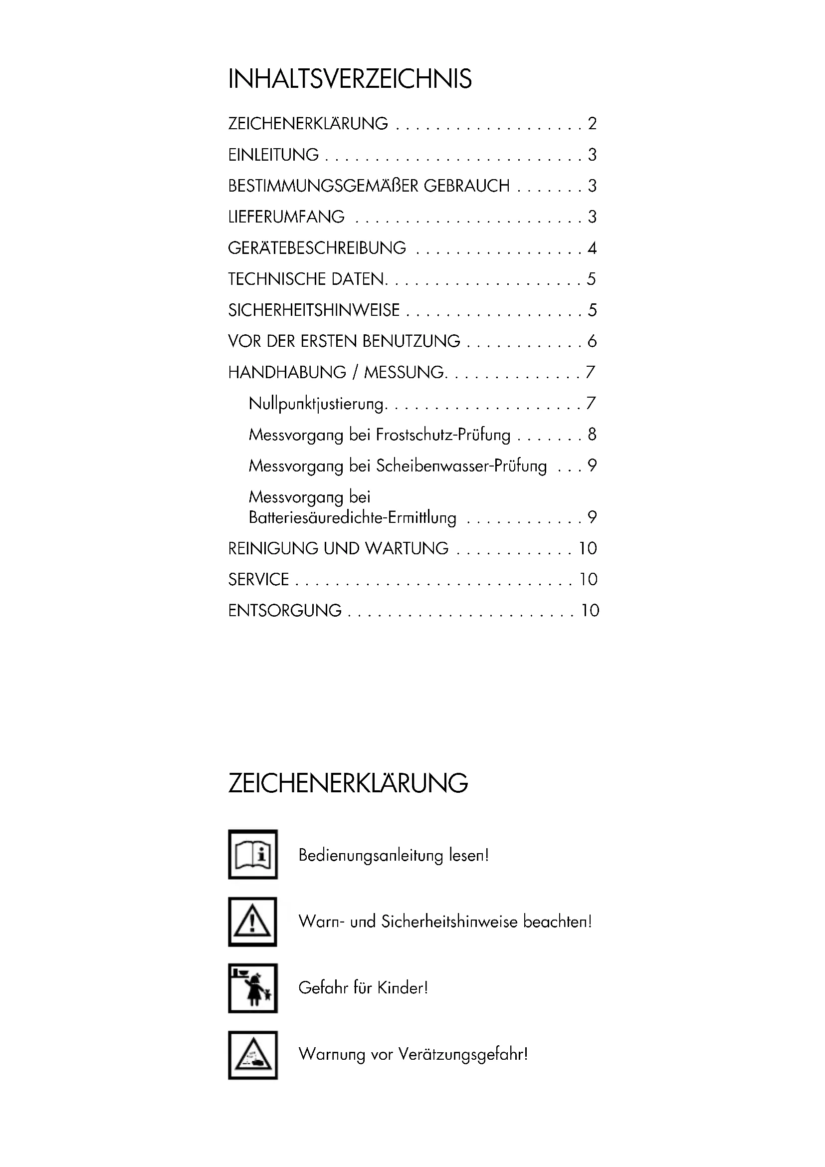 SERVICE ............................10 ENTSORGUNG .......................10 ZEICHENERKLÄRUNG Bedienungsanleitung lesen! Warn- und Sicherheitshinweise beachten! Gefahr für Kinder! Warnung vor Verätzungsgefahr!3