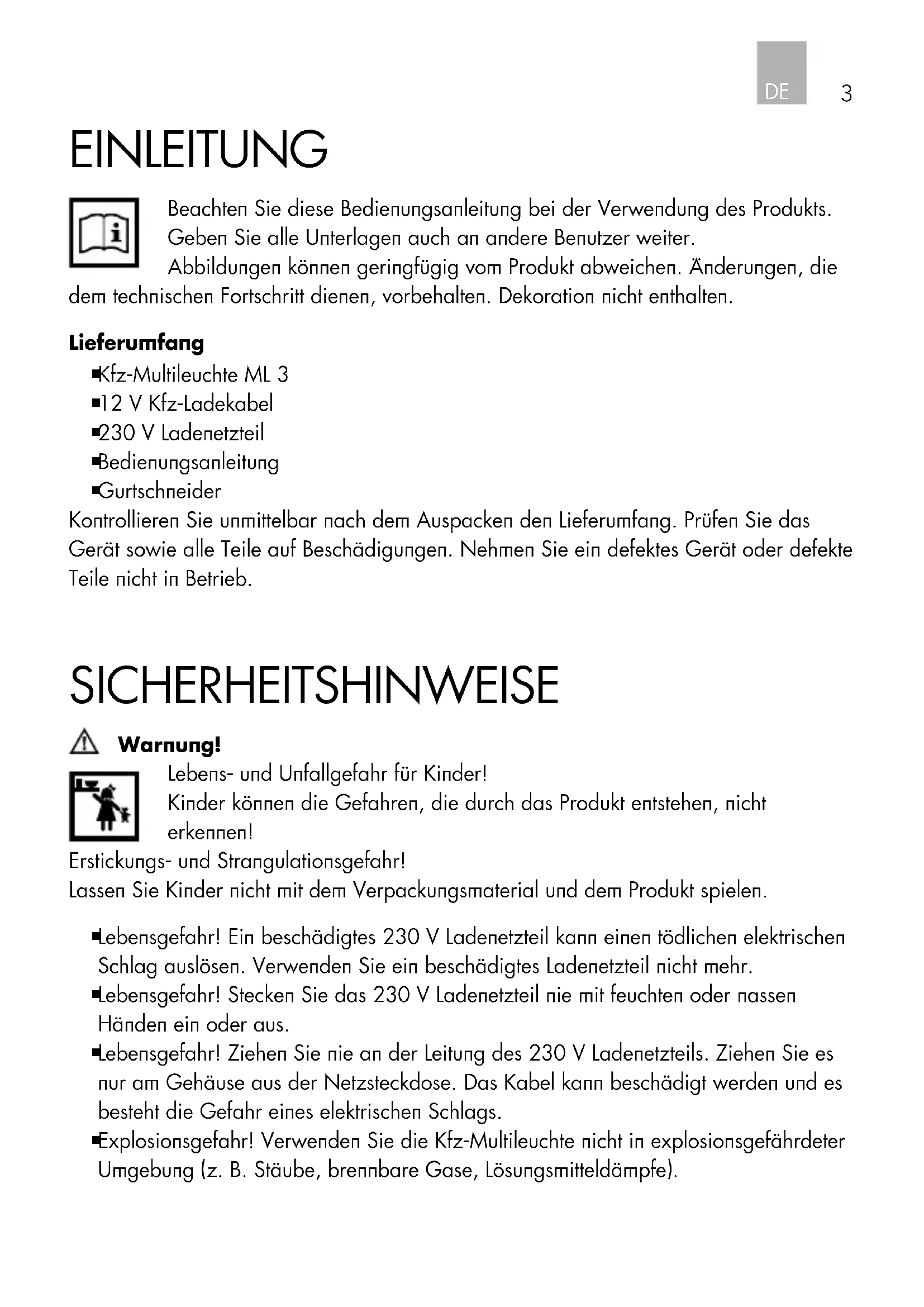 ■Brandgefahr! Die Kfz-Multileuche darf nur mit dem mitgelieferten 230 V Ladenetzteil an einer 230 V/50 Hz Netzsteckdose oder mit dem 12 V Kfz-Ladekabel an einer 12 V Kfz-Steckdose aufgeladen werden.