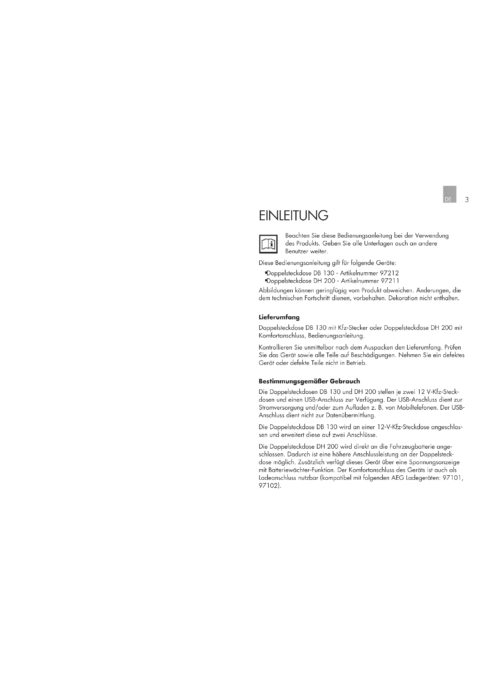Doppelsteckdose DH 200 - Artikelnummer 97211 Abbildungen können geringfügig vom Produkt abweichen. Änderungen, die dem technischen Fortschritt dienen, vorbehalten. Dekoration nicht enthalten. Lieferumfang Doppelsteckdose DB 130 mit Kfz-Stecker oder Doppelsteckdose DH 200 mit Komfortanschluss, Bedienungsanleitung. Kontrollieren Sie unmittelbar nach dem Auspacken den Lieferumfang. Prüfen Sie das Gerät sowie alle Teile auf Beschädigungen. Nehmen Sie ein defektes Gerät oder defekte Teile nicht in Betrieb. Bestimmungsgemäßer Gebrauch Die Doppelsteckdosen DB 130 und DH 200 stellen je zwei 12 V-Kfz-Steck- dosen und einen USB-Anschluss zur Verfügung. Der USB-Anschluss dient zur Stromversorgung und/oder zum Aufladen z. B. von Mobiltelefonen. Der USB- Anschluss dient nicht zur Datenübermittlung. Die Doppelsteckdose DB 130 wird an einer 12-V-Kfz-Steckdose angeschlos- sen und erweitert diese auf zwei Anschlüsse. Die Doppelsteckdose DH 200 wird direkt an die Fahrzeugbatterie ange- schlossen. Dadurch ist eine höhere Anschlussleistung an der Doppelsteck- dose möglich. Zusätzlich verfügt dieses Gerät über eine Spannungsanzeige mit Batteriewächter-Funktion. Der Komfortanschluss des Geräts ist auch als Ladeanschluss nutzbar (kompatibel mit folgenden AEG Ladegeräten: 97101, 97102).54