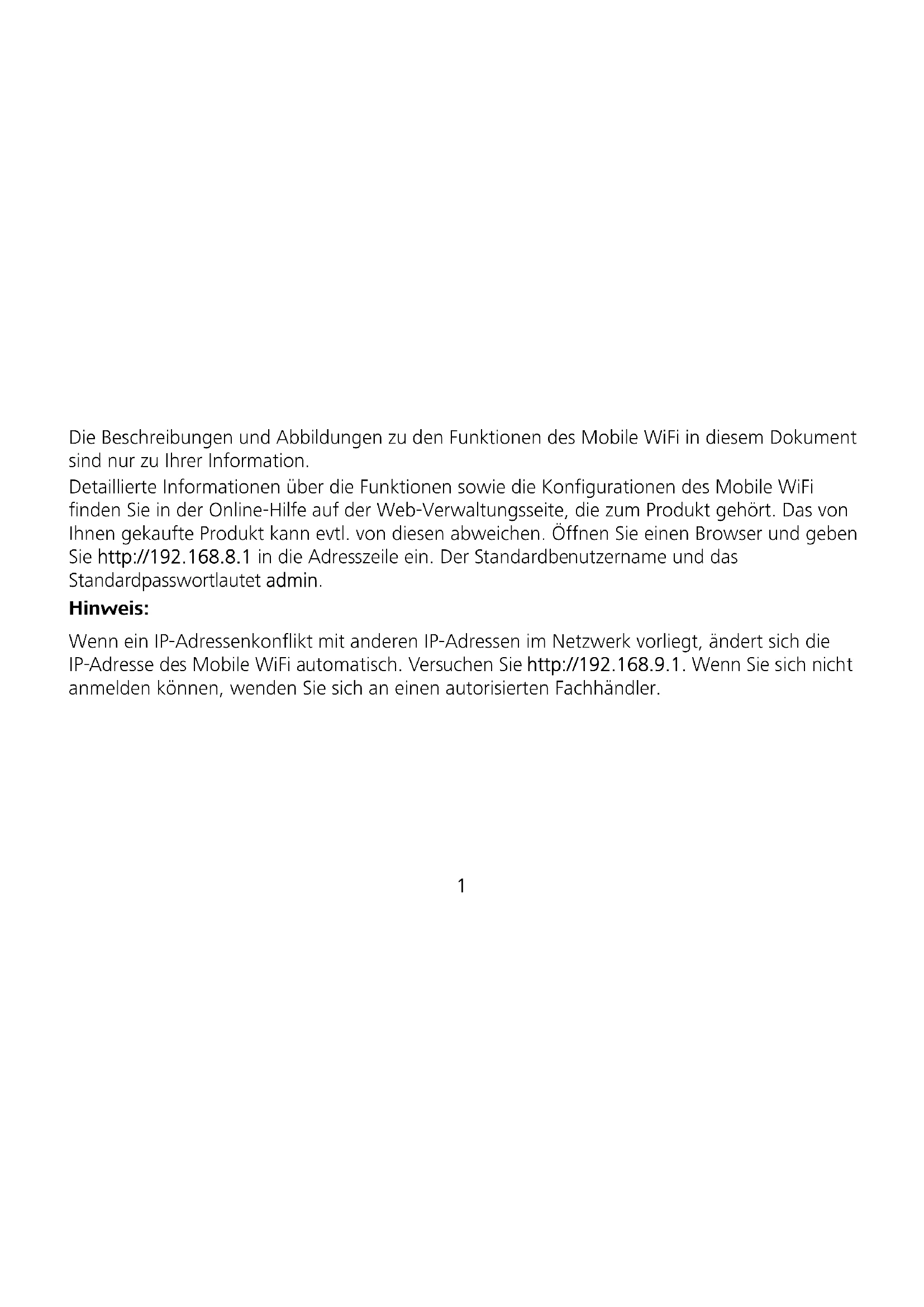 SSID et clé de chiffrement du réseau sans fil Lorsqu'un appareil Wi-Fi se connecte pour la première fois au Mobile WiFi, la saisie du SSID (Service Set Identifier) et de la clé de chiffrement du réseau sans fil par défaut peut être requise. Le SSID et la clé de chiffrement par défaut sont imprimés sur l'étiquette du Mobile WiFi. Il est recommandé de se connecter à la page d'administration en ligne et de modifier le SSID et la clé de chiffrement du réseau sans fil.Kurzanleitung1 Die Beschreibungen und Abbildungen zu den Funktionen des Mobile WiFi in diesem Dokument sind nur zu Ihrer Information. Detaillierte Informationen über die Funktionen sowie die Konfigurationen des Mobile WiFi finden Sie in der Online-Hilfe auf der Web-Verwaltungsseite, die zum Produkt gehört. Das von Ihnen gekaufte Produkt kann evtl. von diesen abweichen. Öffnen Sie einen Browser und geben Sie http://192.168.8.1 in die Adresszeile ein. Der Standardbenutzername und das Standardpasswortlautet admin. Hinweis: Wenn ein IP-Adressenkonflikt mit anderen IP-Adressen im Netzwerk vorliegt, ändert sich die IP-Adresse des Mobile WiFi automatisch. Versuchen Sie http://192.168.9.1. Wenn Sie sich nicht anmelden können, wenden Sie sich an einen autorisierten Fachhändler.2 Aussehen