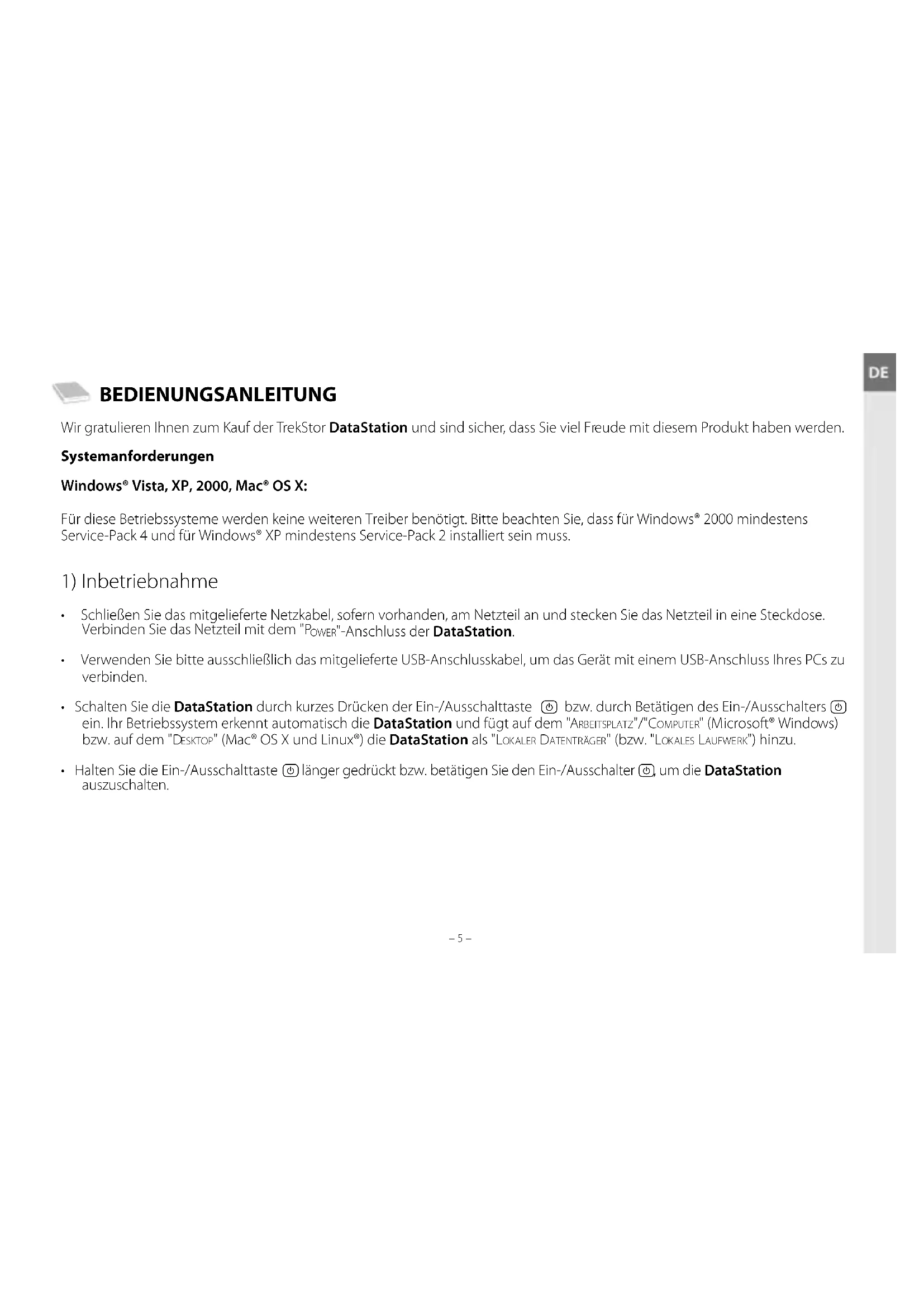 BEDIENUNGSANLEITUNG Wir gratulieren Ihnen zum Kauf der TrekStor DataStation und sind sicher, dass Sie viel Freude mit diesem Produkt haben werden. Systemanforderungen Windows® Vista, XP, 2000, Mac® OS X: Für diese Betriebssysteme werden keine weiteren Treiber benötigt. Bitte beachten Sie, dass für Windows® 2000 mindestens Service-Pack 4 und für Windows® XP mindestens Service-Pack 2 installiert sein muss.