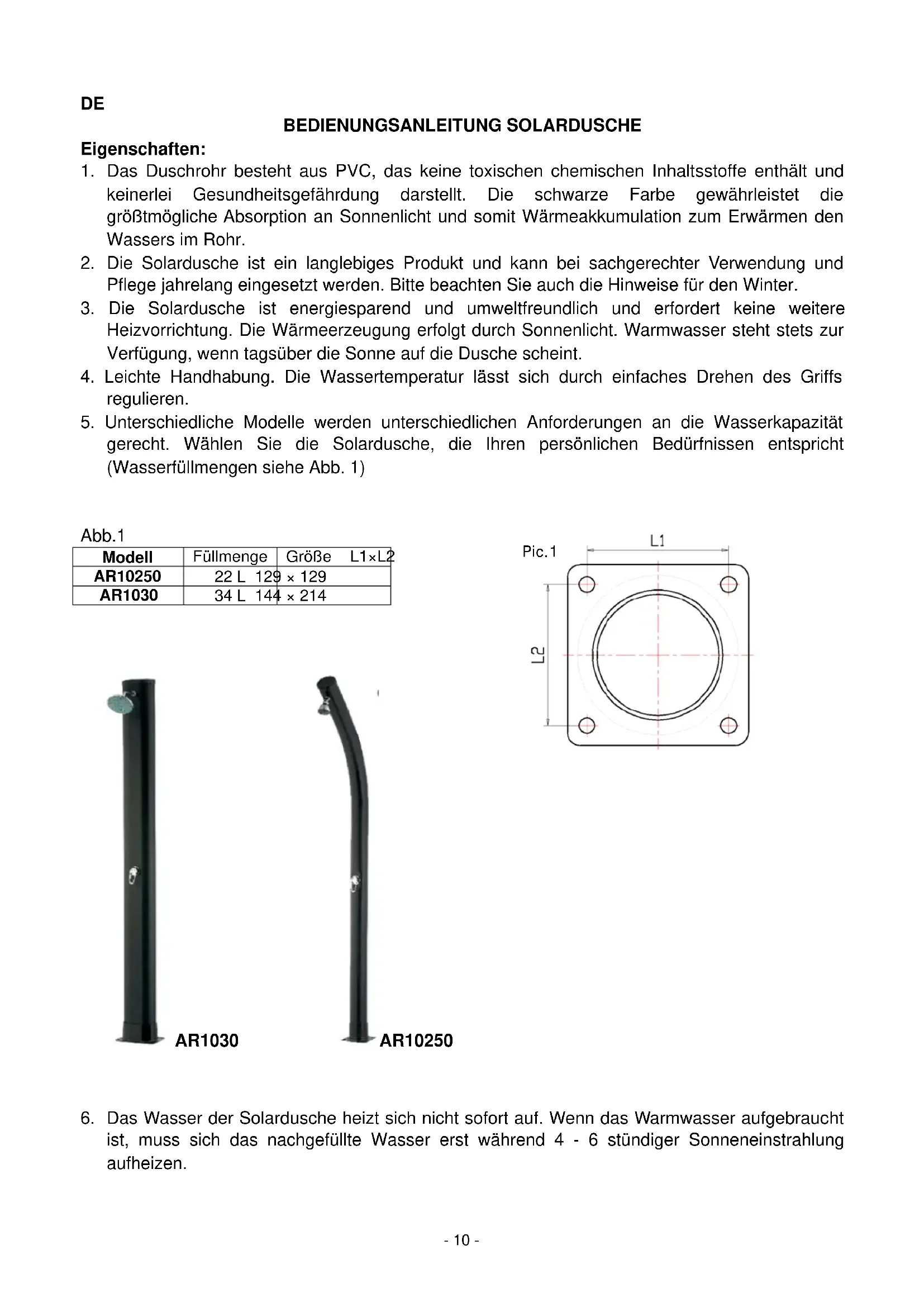- Unterschiedliche Modèle werden unterschiedlichen Anforderungen an die Wasserkapazität gerecht. Wahlen Sie die Solardusche, die ihren persönlichen Bedürfnissen entspricht (Wasserfüllmengen siehe Abb. 1)