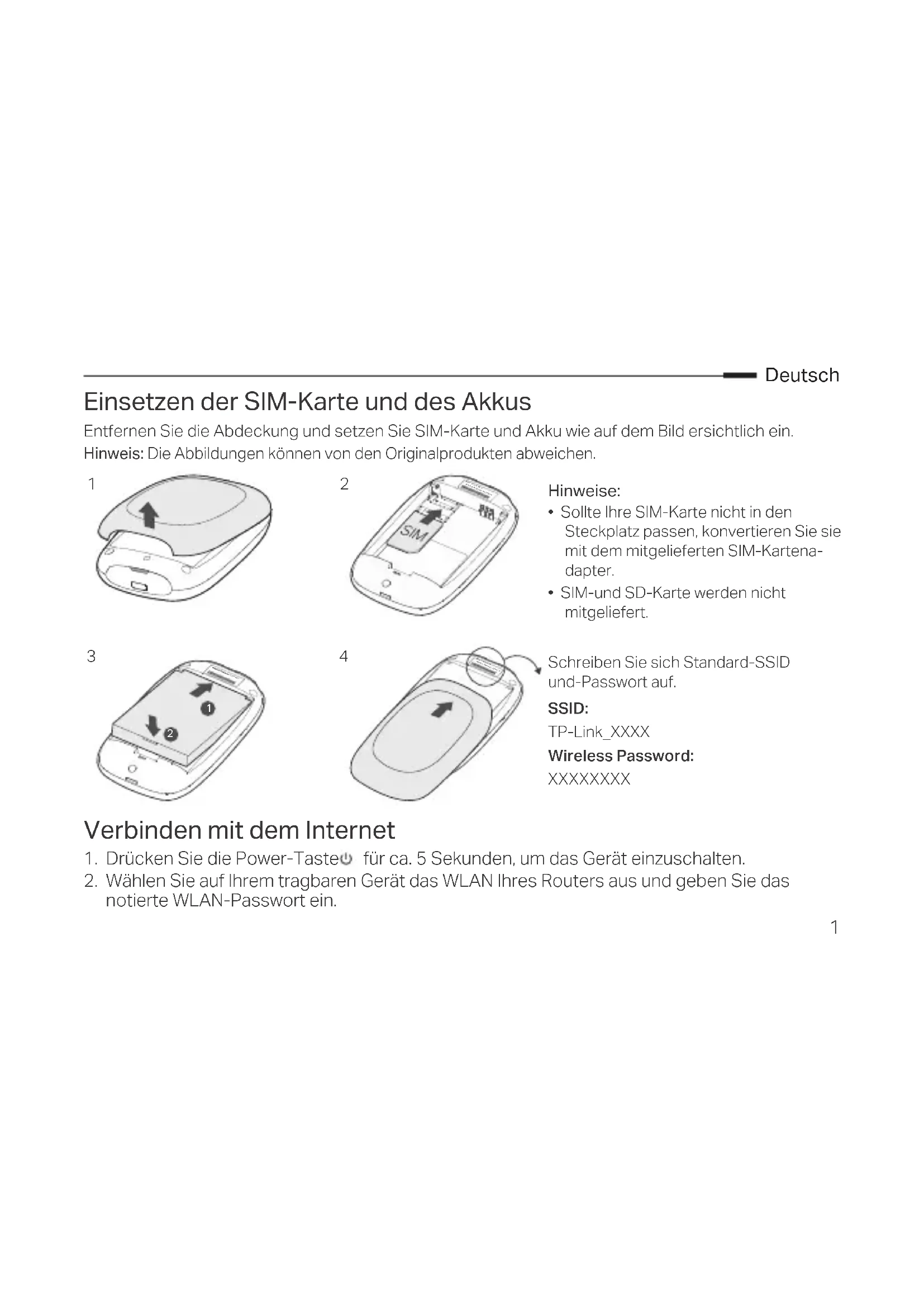 - SIM-und SD-Karte werden nicht mitgeliefert. Schreiben Sie sich Standard-SSID und-Passwort auf. SSID: TP-Link_XXXX Wireless Password: XXXXXXXX2 Deutsch Hinweis: Wir empfehlen Ihnen, den Namen und das Passwort Ihres WLANs zu ändern, um die Sicherheit zu erhöhen. Fertig! Hinweis: