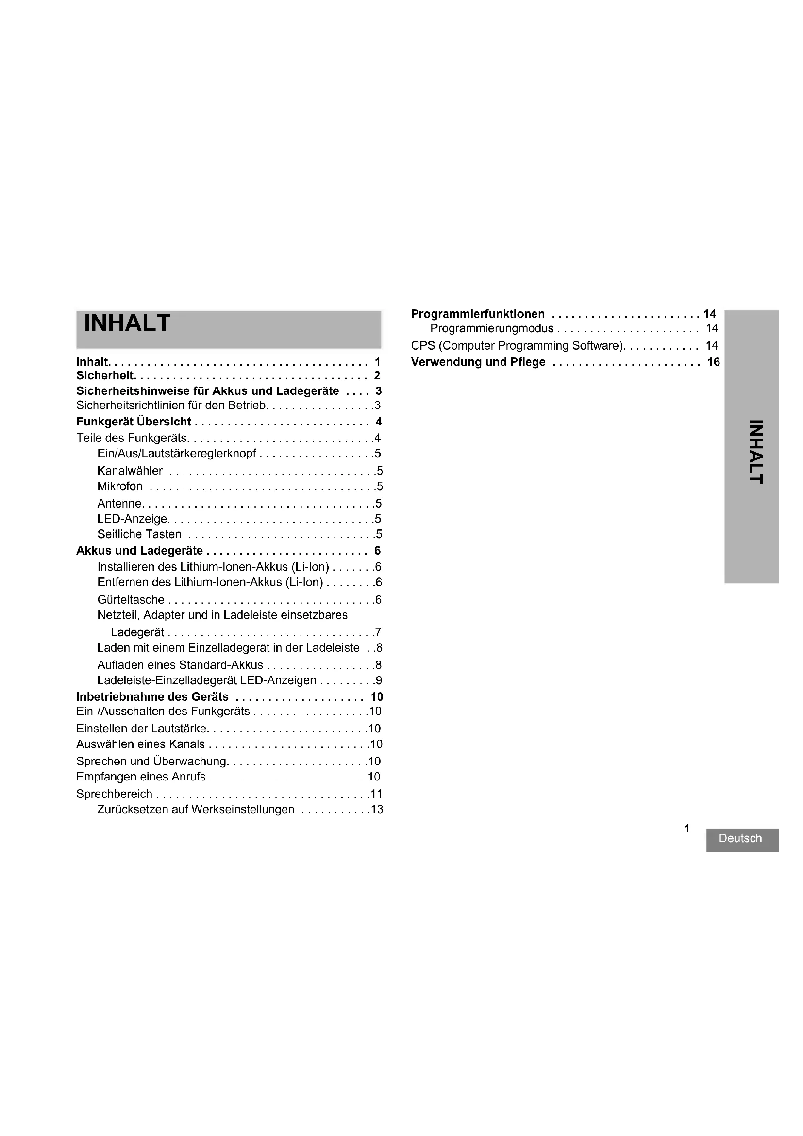 PROGRAMMIERFUNKTIONEN (um zu vermeiden, dass voreingestellte Funkwerte versehentlich gelöscht werden). Darüber hinaus bietet sie Sicherheit, indem Sie die Möglichkeit erhalten, ein Kennwort für das Profil der Funkgerät-Verwaltung festzulegen. Weitere Informationen finden Sie im Diagramm mit der Featureübersicht am Ende der Bedienungsanleitung. Hinweis: Funktionen sollten von einem autorisierten Motorola Händler aktiviert werden. Wenden Sie sich an Ihren Motorola Händler für Details. Hinweis: (*) Beim CPS-Programmierkabel handelt es sich um separat erhältliches Zubehör. Die Artikelnummern finden Sie im Abschnitt „Zubehör“. Siehe CPS CD für detaillierte Informationen zu CPS.Deutsch