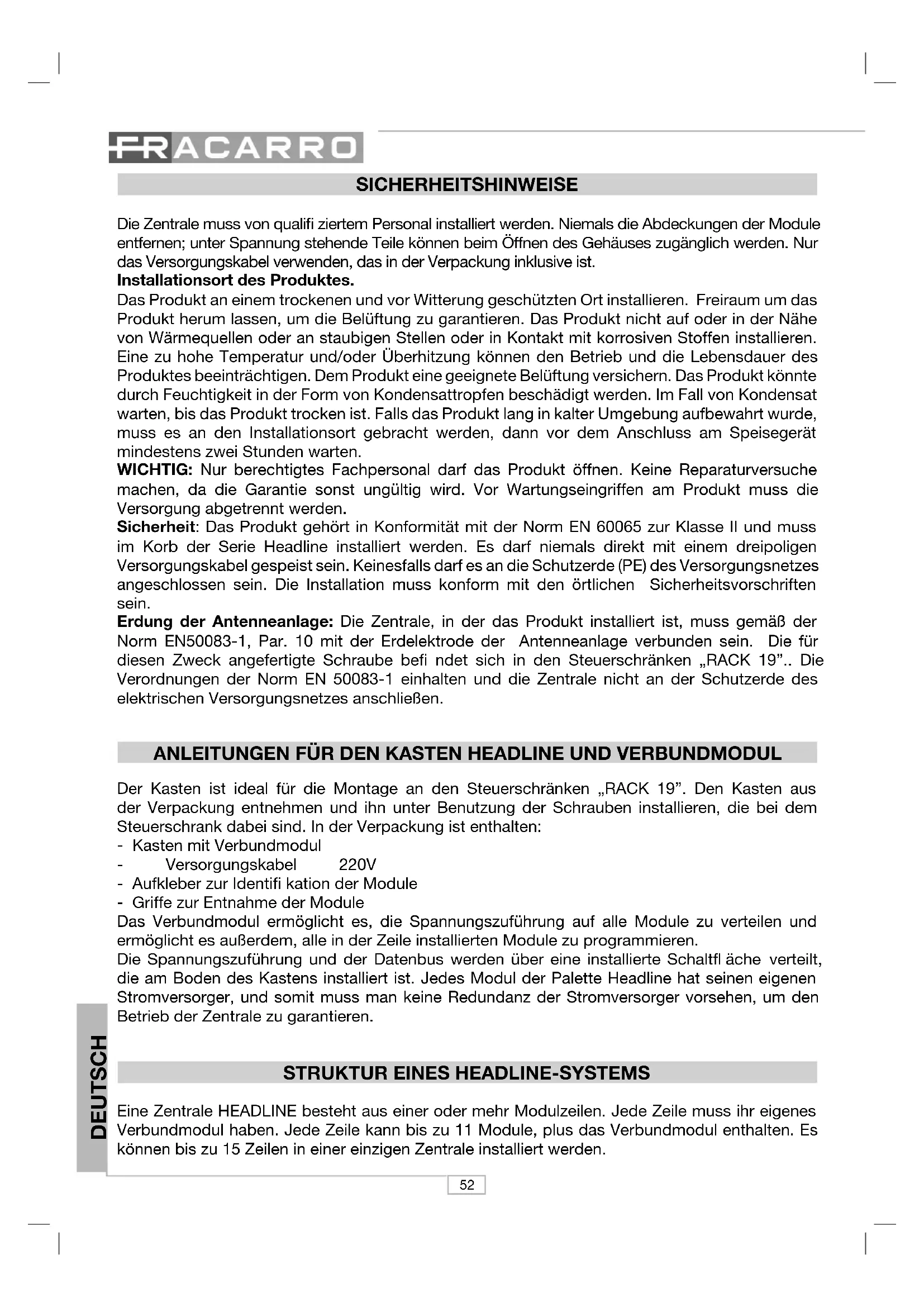 MÓDULO DEINTERCONEXÃOTODOS OS MÓDULOS DA LINHA52 DEUTSCH SICHERHEITSHINWEISE Die Zentrale muss von qualifi ziertem Personal installiert werden. Niemals die Abdeckungen der Module entfernen; unter Spannung stehende Teile können beim Öffnen des Gehäuses zugänglich werden. Nur das Versorgungskabel verwenden, das in der Verpackung inklusive ist. Installationsort des Produktes. Das Produkt an einem trockenen und vor Witterung geschützten Ort installieren. Freiraum um das Produkt herum lassen, um die Belüftung zu garantieren. Das Produkt nicht auf oder in der Nähe von Wärmequellen oder an staubigen Stellen oder in Kontakt mit korrosiven Stoffen installieren. Eine zu hohe Temperatur und/oder Überhitzung können den Betrieb und die Lebensdauer des Produktes beeinträchtigen. Dem Produkt eine geeignete Belüftung versichern. Das Produkt könnte durch Feuchtigkeit in der Form von Kondensattropfen beschädigt werden. Im Fall von Kondensat warten, bis das Produkt trocken ist. Falls das Produkt lang in kalter Umgebung aufbewahrt wurde, muss es an den Installationsort gebracht werden, dann vor dem Anschluss am Speisegerät mindestens zwei Stunden warten. WICHTIG: Nur berechtigtes Fachpersonal darf das Produkt öffnen. Keine Reparaturversuche machen, da die Garantie sonst ungültig wird. Vor Wartungseingriffen am Produkt muss die Versorgung abgetrennt werden. Sicherheit: Das Produkt gehört in Konformität mit der Norm EN 60065 zur Klasse II und muss im Korb der Serie Headline installiert werden. Es darf niemals direkt mit einem dreipoligen Versorgungskabel gespeist sein. Keinesfalls darf es an die Schutzerde (PE) des Versorgungsnetzes angeschlossen sein. Die Installation muss konform mit den örtlichen Sicherheitsvorschriften sein. Erdung der Antenneanlage: Die Zentrale, in der das Produkt installiert ist, muss gemäß der Norm EN50083-1, Par. 10 mit der Erdelektrode der Antenneanlage verbunden sein. Die für diesen Zweck angefertigte Schraube befi ndet sich in den Steuerschränken „RACK 19”.. Die Verordnungen der Norm EN 50083-1 einhalten und die Zentrale nicht an der Schutzerde des elektrischen Versorgungsnetzes anschließen. ANLEITUNGEN FÜR DEN KASTEN HEADLINE UND VERBUNDMODUL Der Kasten ist ideal für die Montage an den Steuerschränken „RACK 19”. Den Kasten aus der Verpackung entnehmen und ihn unter Benutzung der Schrauben installieren, die bei dem Steuerschrank dabei sind. In der Verpackung ist enthalten: - Kasten mit Verbundmodul - Versorgungskabel 220V - Aufkleber zur Identifi kation der Module - Griffe zur Entnahme der Module Das Verbundmodul ermöglicht es, die Spannungszuführung auf alle Module zu verteilen und ermöglicht es außerdem, alle in der Zeile installierten Module zu programmieren. Die Spannungszuführung und der Datenbus werden über eine installierte Schaltfl äche verteilt, die am Boden des Kastens installiert ist. Jedes Modul der Palette Headline hat seinen eigenen Stromversorger, und somit muss man keine Redundanz der Stromversorger vorsehen, um den Betrieb der Zentrale zu garantieren.