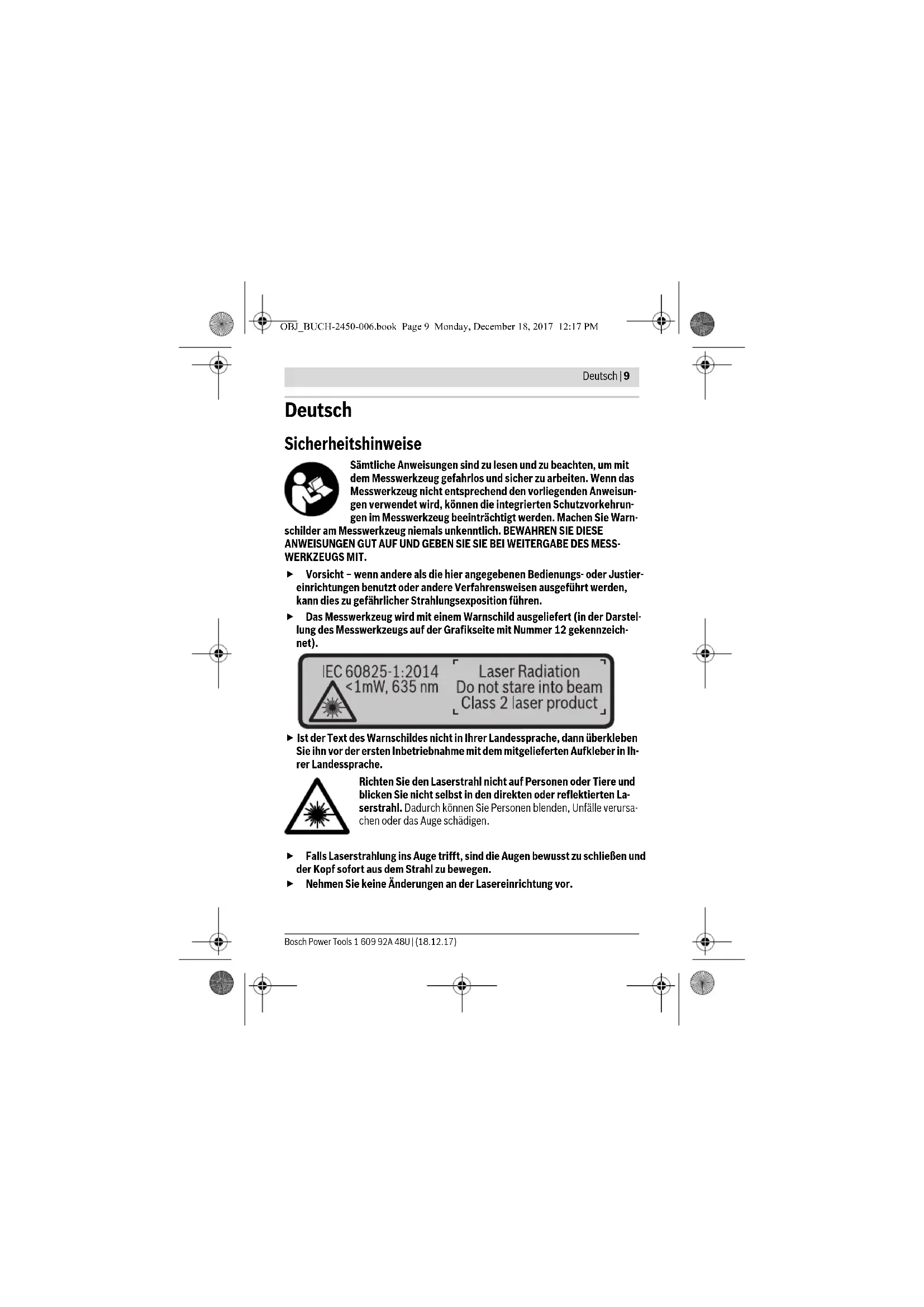 GLM 50 C Professional OBJ_BUCH-2450-006.book Page 8 Monday, December 18, 2017 12:17 PMDeutsch | 9 Bosch Power Tools 1 609 92A 48U | (18.12.17) Deutsch Sicherheitshinweise Sämtliche Anweisungen sind zu lesen und zu beachten, um mit dem Messwerkzeug gefahrlos und sicher zu arbeiten. Wenn das Messwerkzeug nicht entsprechend den vorliegenden Anweisun- gen verwendet wird, können die integrierten Schutzvorkehrun- gen im Messwerkzeug beeinträchtigt werden. Machen Sie Warn- schilder am Messwerkzeug niemals unkenntlich. BEWAHREN SIE DIESE ANWEISUNGEN GUT AUF UND GEBEN SIE SIE BEI WEITERGABE DES MESS- WERKZEUGS MIT. Vorsicht – wenn andere als die hier angegebenen Bedienungs- oder Justier- einrichtungen benutzt oder andere Verfahrensweisen ausgeführt werden, kann dies zu gefährlicher Strahlungsexposition führen. Das Messwerkzeug wird mit einem Warnschild ausgeliefert (in der Darstel- lung des Messwerkzeugs auf der Grafikseite mit Nummer 12 gekennzeich- net). Ist der Text des Warnschildes nicht in Ihrer Landessprache, dann überkleben Sie ihn vor der ersten Inbetriebnahme mit dem mitgelieferten Aufkleber in Ih- rer Landessprache. Richten Sie den Laserstrahl nicht auf Personen oder Tiere und blicken Sie nicht selbst in den direkten oder reflektierten La- serstrahl. Dadurch können Sie Personen blenden, Unfälle verursa- chen oder das Auge schädigen. Falls Laserstrahlung ins Auge trifft, sind die Augen bewusst zu schließen und der Kopf sofort aus dem Strahl zu bewegen. Nehmen Sie keine Änderungen an der Lasereinrichtung vor. OBJ_BUCH-2450-006.book Page 9 Monday, December 18, 2017 12:17 PM10 | Deutsch 1 609 92A 48U | (18.12.17) Bosch Power Tools Verwenden Sie die Laser-Sichtbrille nicht als Schutzbrille. Die Laser-Sichtbril- le dient zum besseren Erkennen des Laserstrahls, sie schützt jedoch nicht vor der Laserstrahlung. Verwenden Sie die Laser-Sichtbrille nicht als Sonnenbrille oder im Straßen- verkehr. Die Laser-Sichtbrille bietet keinen vollständigen UV-Schutz und vermin- dert die Farbwahrnehmung. Lassen Sie das Messwerkzeug von qualifiziertem Fachpersonal und nur mit Original-Ersatzteilen reparieren. Damit wird sichergestellt, dass die Sicherheit des Messwerkzeuges erhalten bleibt. Lassen Sie Kinder das Laser-Messwerkzeug nicht unbeaufsichtigt benutzen. Sie könnten unbeabsichtigt Personen blenden. Arbeiten Sie mit dem Messwerkzeug nicht in explosionsgefährdeter Umge- bung, in der sich brennbare Flüssigkeiten, Gase oder Stäube befinden. Im Messwerkzeug können Funken erzeugt werden, die den Staub oder die Dämpfe entzünden. Vorsicht! Bei der Verwendung des Messwerkzeugs mit Bluetooth® kann eine Störung anderer Geräte und Anlagen, Flugzeuge und medizinischer Geräte (z.B. Herzschrittmacher, Hörgeräte) auftreten. Ebenfalls kann eine Schädi- gung von Menschen und Tieren in unmittelbarer Umgebung nicht ganz ausge- schlossen werden. Verwenden Sie das Messwerkzeug mit Bluetooth® nicht in der Nähe von medizinischen Geräten, Tankstellen, chemischen Anlagen, Ge- bieten mit Explosionsgefahr und in Sprenggebieten. Verwenden Sie das Messwerkzeug mit Bluetooth® nicht in Flugzeugen. Vermeiden Sie den Be- trieb über einen längeren Zeitraum in direkter Körpernähe. Die Bluetooth®-Wortmarke wie auch die Bildzeichen (Logos) sind eingetragene Warenzeichen und Eigentum der Bluetooth SIG, Inc. Jegliche Verwendung die- ser Wortmarke/Bildzeichen durch die Robert Bosch Power Tools GmbH erfolgt unter Lizenz. Produkt- und Leistungsbeschreibung Bitte klappen Sie die Ausklappseite mit der Darstellung des Messwerkzeugs auf, und lassen Sie diese Seite aufgeklappt, während Sie die Betriebsanleitung lesen. Bestimmungsgemäßer Gebrauch Das Messwerkzeug ist bestimmt zum Messen von Entfernungen, Längen, Höhen, Ab- ständen, Neigungen und zum Berechnen von Flächen und Volumina. Die Messergebnisse können über Bluetooth® zu anderen Geräten übertragen werden. OBJ_BUCH-2450-006.book Page 10 Monday, December 18, 2017 12:17 PMDeutsch | 11 Bosch Power Tools 1 609 92A 48U | (18.12.17) Technische Daten Digitaler Laser-Entfernungsmesser GLM 50 C Sachnummer 3601K72C.. Messbereich (typisch) 0,05–50 m
