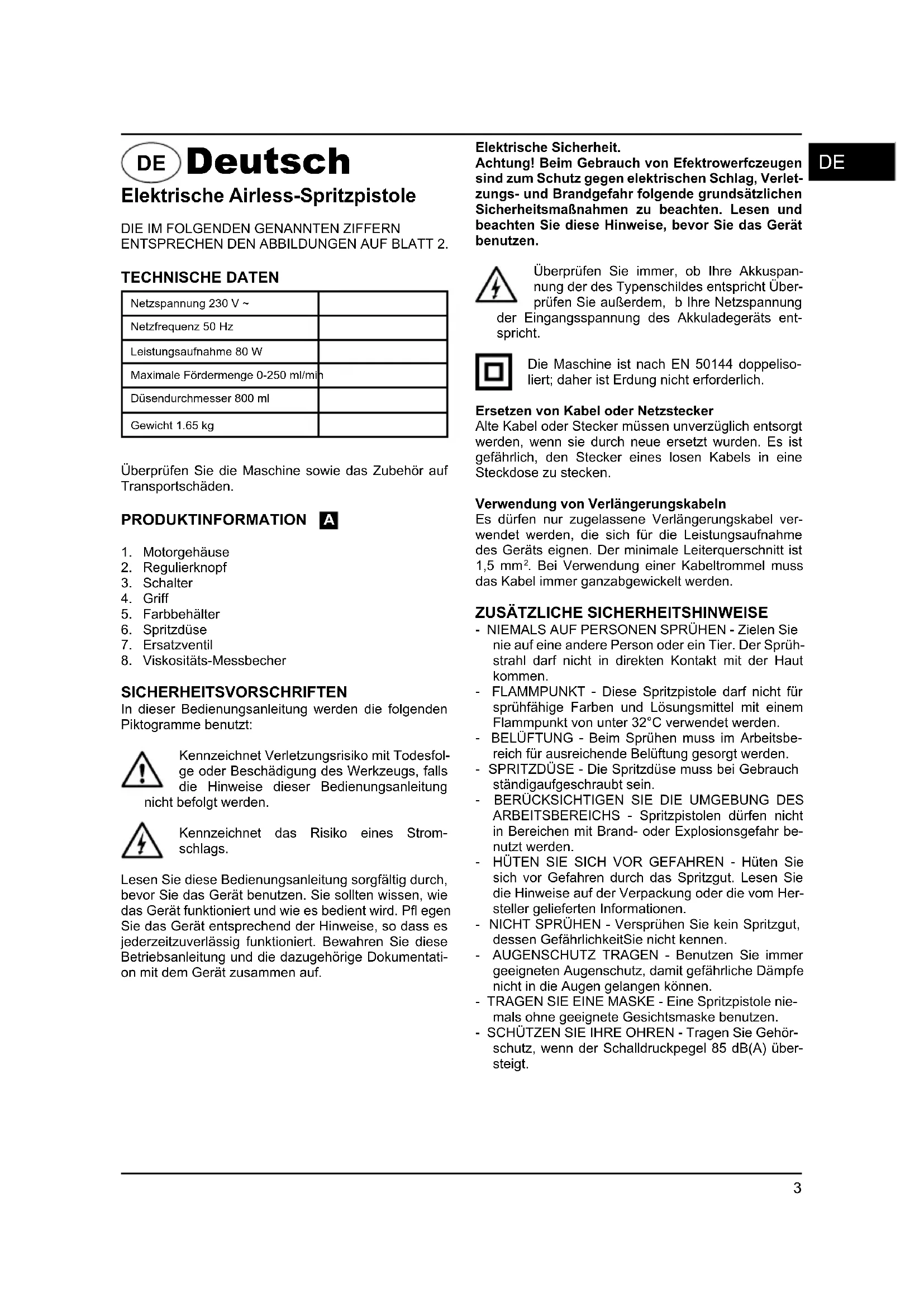 - NIEMALS AUF PERSONEN SPRÜHEN - Zielen Sie nie auf eine andere Person oder ein Tier. Der Sprüh- strahl darf nicht in direkten Kontakt mit der Haut kommen. - FLAMMPUNKT - Diese Spritzpistole darf nicht für sprühfähige Farben und Lösungsmittel mit einem Flammpunkt von unter 32°C verwendet werden. - BELÜFTUNG - Beim Sprühen muss im Arbeitsbe- reich für ausreichende Belüftung gesorgt werden. - SPRITZDÜSE - Die Spritzdüse muss bei Gebrauch ständigaufgeschraubt sein.