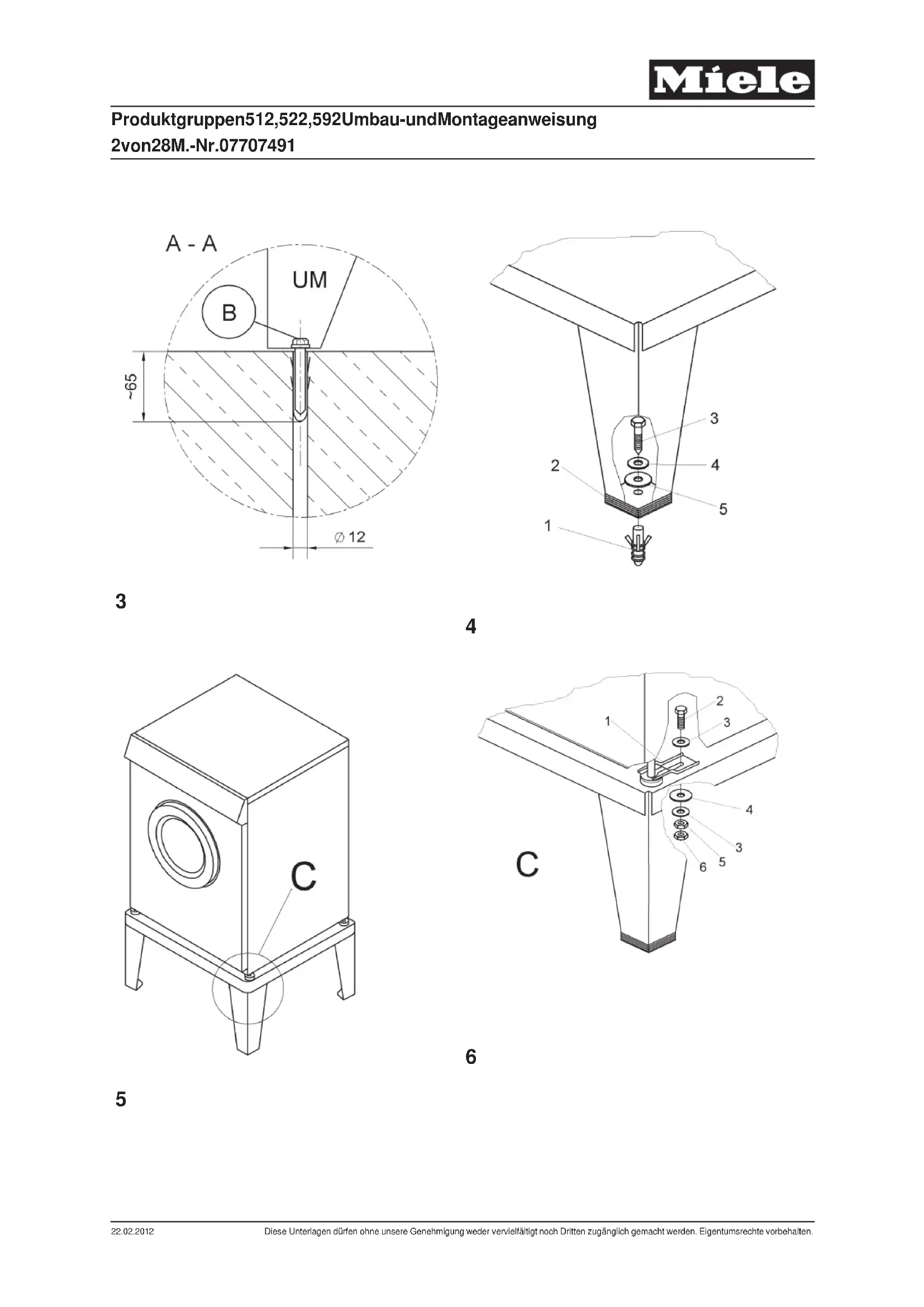 - Den Sockel nicht für eine Waschtrockensäule verwenden. Produktgruppen 512, 522, 592 Umbau- und Montageanweisung 4 von 28 M.-Nr. 07707491 22.02.2012 Diese Unterlagen dürfen ohne unsere Genehmigung weder vervielfältigt noch Dritten zugänglich gemacht werden. Eigentumsrechte vorbehalten.Hinweis Den Sockel ausschließlich für folgende Miele-Geräte verwenden: