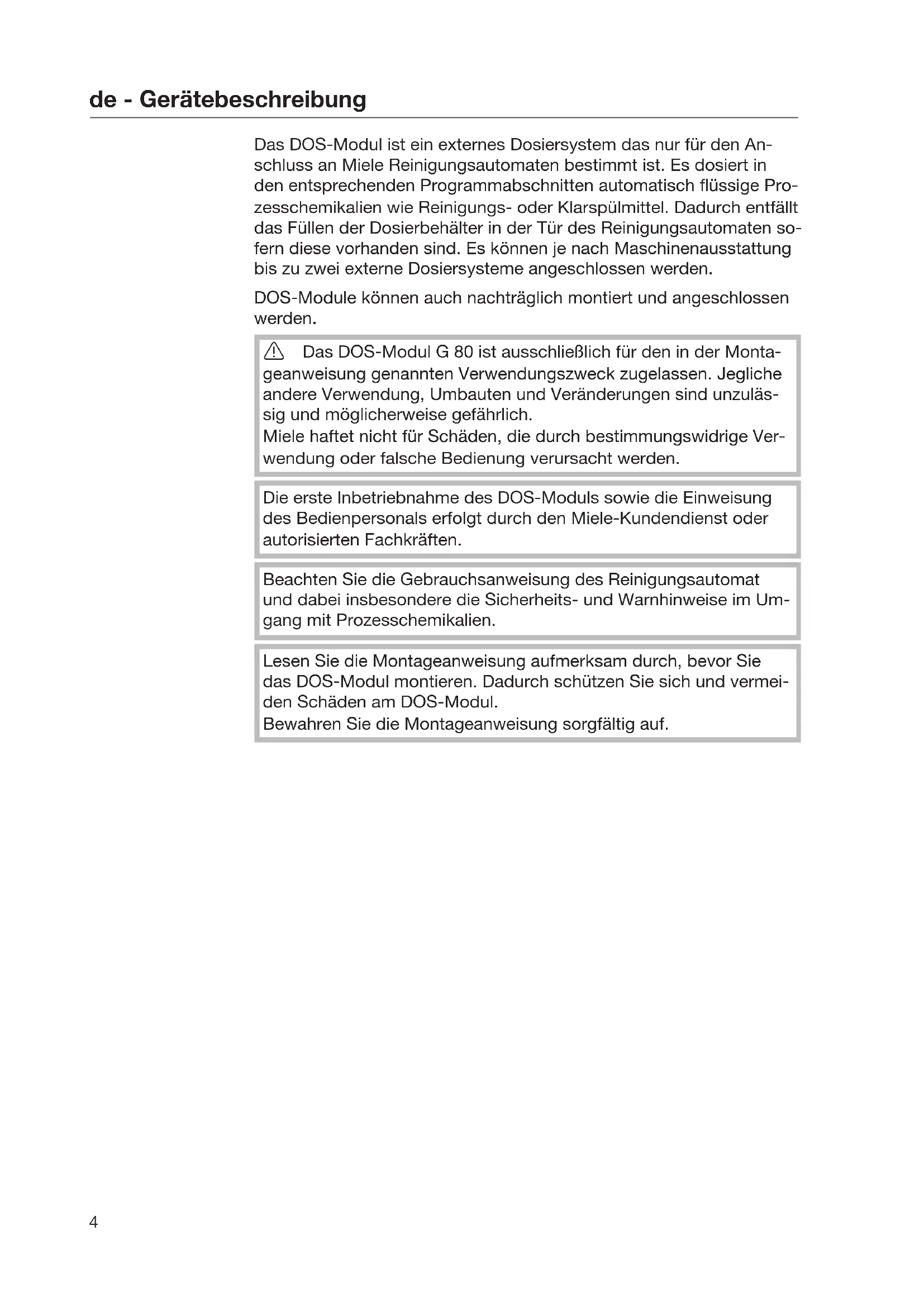 Das DOS-Modul ist ein externes Dosiersystem das nur für den An- schluss an Miele Reinigungsautomaten bestimmt ist. Es dosiert in den entsprechenden Programmabschnitten automatisch flüssige Pro- zesschemikalien wie Reinigungs- oder Klarspülmittel. Dadurch entfällt das Füllen der Dosierbehälter in der Tür des Reinigungsautomaten so- fern diese vorhanden sind. Es können je nach Maschinenausstattung bis zu zwei externe Dosiersysteme angeschlossen werden. DOS-Module können auch nachträglich montiert und angeschlossen werden. Das DOS-Modul G 80 ist ausschließlich für den in der Monta- geanweisung genannten Verwendungszweck zugelassen. Jegliche andere Verwendung, Umbauten und Veränderungen sind unzuläs- sig und möglicherweise gefährlich. Miele haftet nicht für Schäden, die durch bestimmungswidrige Ver- wendung oder falsche Bedienung verursacht werden. Die erste Inbetriebnahme des DOS-Moduls sowie die Einweisung des Bedienpersonals erfolgt durch den Miele-Kundendienst oder autorisierten Fachkräften. Beachten Sie die Gebrauchsanweisung des Reinigungsautomat und dabei insbesondere die Sicherheits- und Warnhinweise im Um- gang mit Prozesschemikalien. Lesen Sie die Montageanweisung aufmerksam durch, bevor Sie das DOS-Modul montieren. Dadurch schützen Sie sich und vermei- den Schäden am DOS-Modul. Bewahren Sie die Montageanweisung sorgfältig auf.de - Gerätebeschreibung