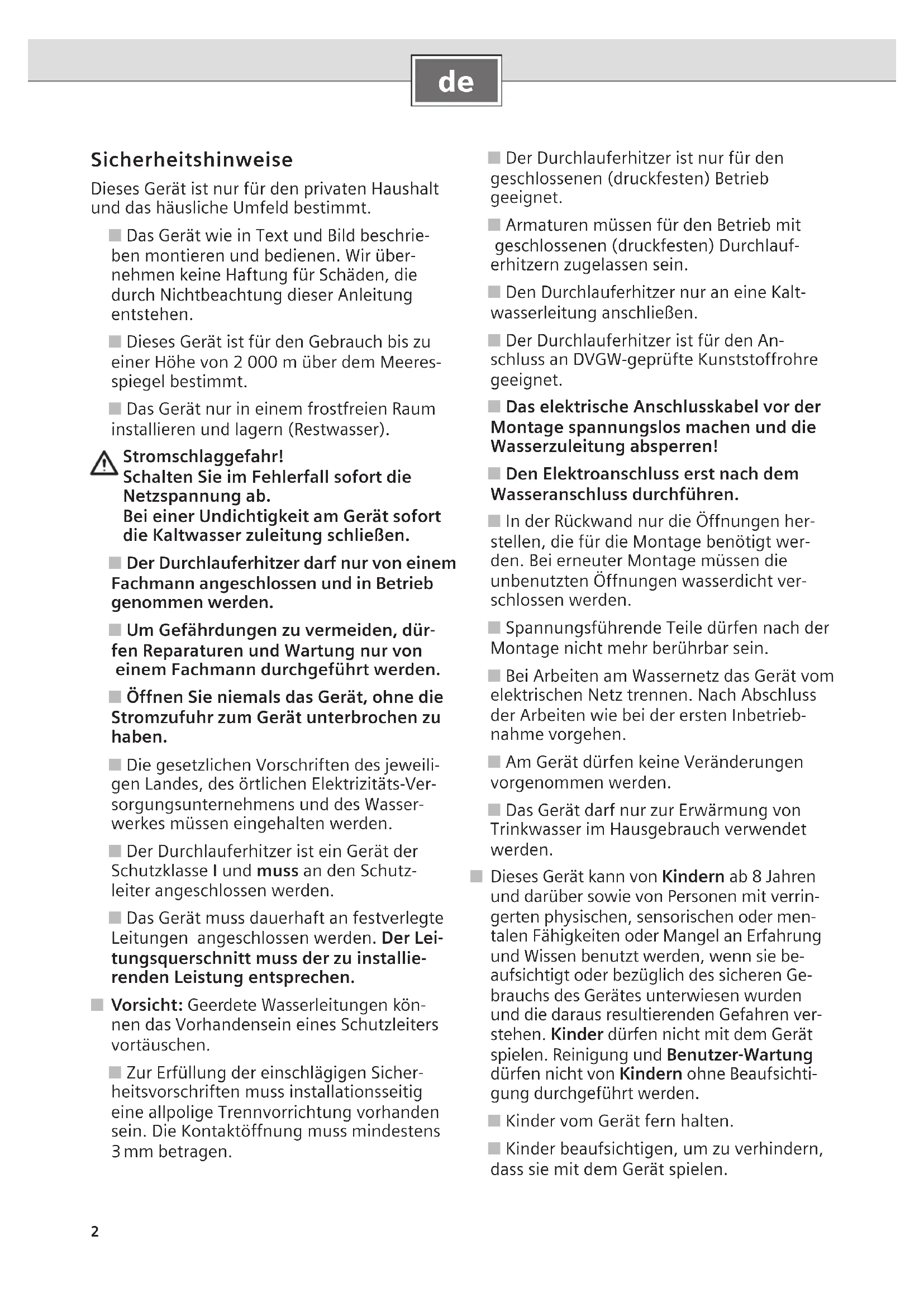 Sicherheitshinweise Dieses Gerät ist nur für den privaten Haushalt und das häusliche Umfeld bestimmt. ■ Das Gerät wie in Text und Bild beschrie- ben montieren und bedienen. Wir über- nehmen keine Haftung für Schäden, die durch Nichtbeachtung dieser Anleitung entstehen. ■ Dieses Gerät ist für den Gebrauch bis zu einer Höhe von 2 000 m über dem Meeres- spiegel bestimmt. ■ Das Gerät nur in einem frostfreien Raum installieren und lagern (Restwasser). Stromschlaggefahr! Schalten Sie im Fehlerfall sofort die Netzspannung ab. Bei einer Undichtigkeit am Gerät sofort die Kaltwasser zuleitung schließen. ■ Der Durchlauferhitzer darf nur von einem Fachmann angeschlossen und in Betrieb genommen werden. ■ Um Gefährdungen zu vermeiden, dür- fen Reparaturen und Wartung nur von einem Fachmann durchgeführt werden. ■ Öffnen Sie niemals das Gerät, ohne die Stromzufuhr zum Gerät unterbrochen zu haben. ■ Die gesetzlichen Vorschriften des jeweili- gen Landes, des örtlichen Elektrizitäts-Ver- sorgungsunternehmens und des Wasser- werkes müssen eingehalten werden. ■ Der Durchlauferhitzer ist ein Gerät der Schutzklasse I und muss an den Schutz- leiter angeschlossen werden. ■ Das Gerät muss dauerhaft an festverlegte Leitungen angeschlossen werden. Der Lei- tungsquerschnitt muss der zu installie- renden Leistung entsprechen. ■ Vorsicht: Geerdete Wasserleitungen kön- nen das Vorhandensein eines Schutzleiters vortäuschen. ■ Zur Erfüllung der einschlägigen Sicher- heitsvorschriften muss installationsseitig eine allpolige Trennvorrichtung vorhanden sein. Die Kontaktöffnung muss mindestens 3 mm betragen. ■ Der Durchlauferhitzer ist nur für den geschlossenen (druckfesten) Betrieb geeignet. ■ Armaturen müssen für den Betrieb mit geschlossenen (druckfesten) Durchlauf- erhitzern zugelassen sein. ■ Den Durchlauferhitzer nur an eine Kalt- wasserleitung anschließen. ■ Der Durchlauferhitzer ist für den An- schluss an DVGW-geprüfte Kunststoffrohre geeignet. ■ Das elektrische Anschlusskabel vor der Montage spannungslos machen und die Wasserzuleitung absperren! ■ Den Elektroanschluss erst nach dem Wasseranschluss durchführen. ■ In der Rückwand nur die Öffnungen her- stellen, die für die Montage benötigt wer- den. Bei erneuter Montage müssen die unbenutzten Öffnungen wasserdicht ver- schlossen werden. ■ Spannungsführende Teile dürfen nach der Montage nicht mehr berührbar sein. ■ Bei Arbeiten am Wassernetz das Gerät vom elektrischen Netz trennen. Nach Abschluss der Arbeiten wie bei der ersten Inbetrieb- nahme vorgehen. ■ Am Gerät dürfen keine Veränderungen vorgenommen werden. ■ Das Gerät darf nur zur Erwärmung von Trinkwasser im Hausgebrauch verwendet werden. ■ Dieses Gerät kann von Kindern ab 8 Jahren und darüber sowie von Personen mit verrin- gerten physischen, sensorischen oder men- talen Fähigkeiten oder Mangel an Erfahrung und Wissen benutzt werden, wenn sie be- aufsichtigt oder bezüglich des sicheren Ge- brauchs des Gerätes unterwiesen wurden und die daraus resultierenden Gefahren ver- stehen. Kinder dürfen nicht mit dem Gerät spielen. Reinigung und Benutzer-Wartung dürfen nicht von Kindern ohne Beaufsichti- gung durchgeführt werden. ■ Kinder vom Gerät fern halten. ■ Kinder beaufsichtigen, um zu verhindern, dass sie mit dem Gerät spielen.3