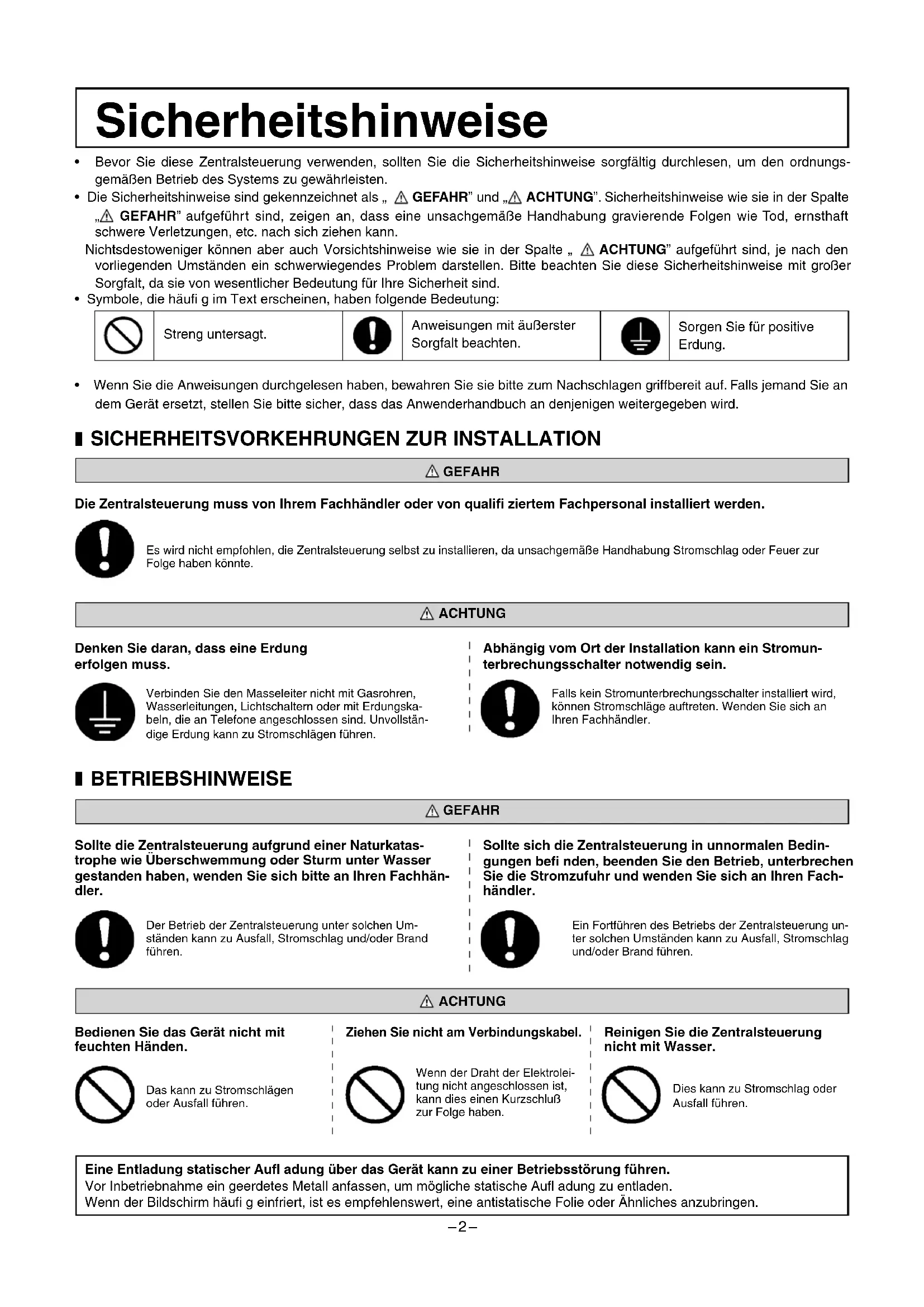 Bevor Sie diese Zentralsteuerung verwenden, sollten Sie die Sicherheitshinweise sorgfältig durchlesen, um den ordnungs- gemäßen Betrieb des Systems zu gewährleisten.